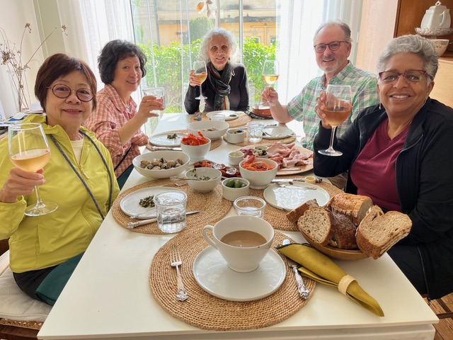 (A side note: After returning to our hotel from our wine museum tour, Tammy, Rosie and I, along with a very kind Canadian couple and their big suitcases got stuck in our hotel elevator. We were actually hoping to get to our rooms and get some rest before going out to dinner. We hit the alarm button hoping to get the hotel staff to respond, but instead the person who did respond was not at the hotel and spoke French. Thankfully our Canadian couple spoke both French and English and could respond to the caller with information about our location and interpret that information to us. Our phones also worked so we could let Alice and John know we were stuck. Alice sprang to action by both alerting the hotel staff and inquiring about getting help. We were in there for about 45 minutes or so before maintenance arrived and quickly moved the elevator to the second floor. It could have been much longer but it was not. Needless to say, we were all grateful to be released from that small elevator with limited circulating air. This was my first and hopefully last time ever being stuck in an elevator.)
