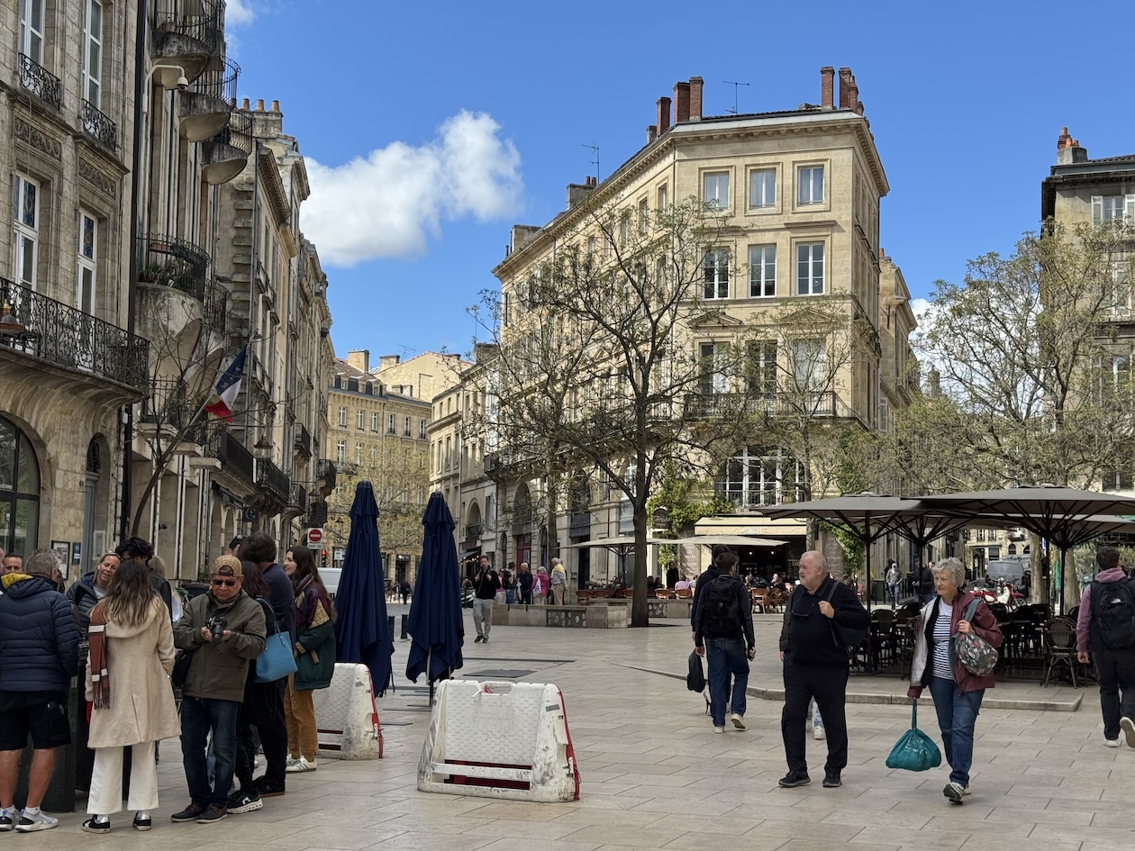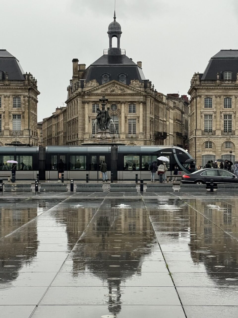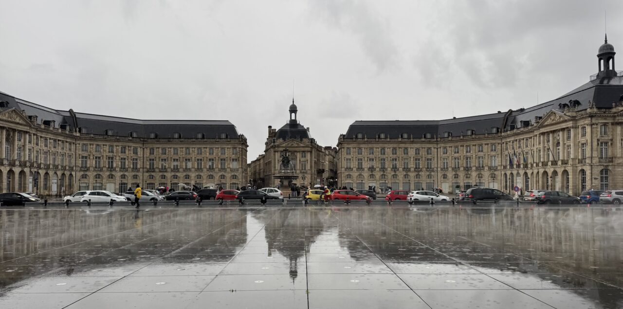 We took a drizzling evening walk to the Place de la Bourse, Bordeaux’s most recognizable square characterized by its symmetrical, half-moon shape and the elegant, identical buildings that line its perimeter. It was built from 1730 to 1775 along the river Garonne. We also timed this photo just right with the misting system at the Miroir d’eau, also known as the Water Mirror, a large reflecting pool in front of the Place de la Bourse. (April 19, 2025)The Place de la Bourse, Bordeaux’s most recognizable square characterized by its symmetrical, half-moon shape and the elegant, identical buildings that line its perimeter with the large reflecting pool in front, the Miroir d’eau, also known as the Water Mirror. The Bourse was built from 1730 to 1775 along the river Garonne. (April 19, 2025)The Place de la Bourse, Bordeaux’s most recognizable square characterized by its symmetrical, half-moon shape and the elegant, identical buildings that line its perimeter with the large reflecting pool in front, the Miroir d’eau, also known as the Water Mirror. The Bourse was built from 1730 to 1775 along the river Garonne. (April 19, 2025)