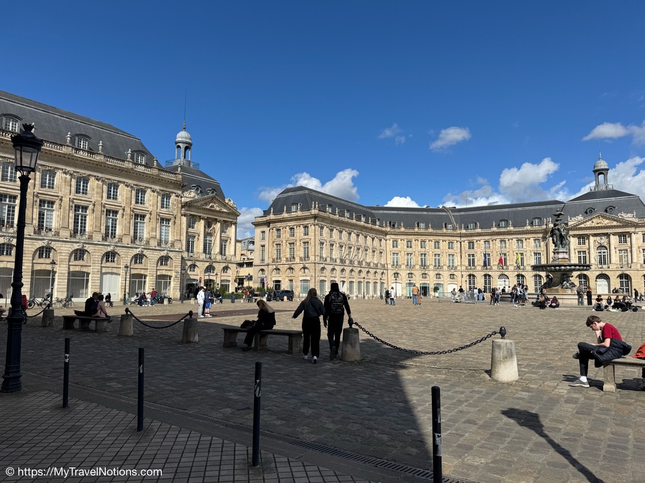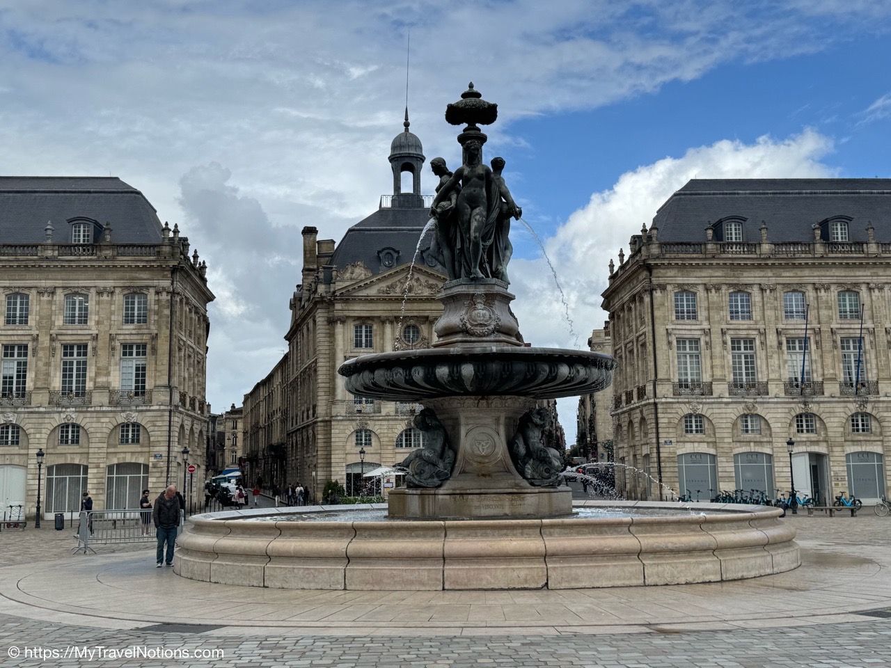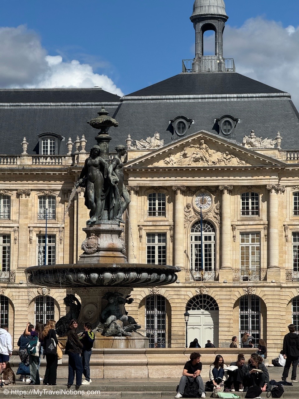 We took a drizzling evening walk to the Place de la Bourse, Bordeaux’s most recognizable square characterized by its symmetrical, half-moon shape and the elegant, identical buildings that line its perimeter. It was built from 1730 to 1775 along the river Garonne. We also timed this photo just right with the misting system at the Miroir d’eau, also known as the Water Mirror, a large reflecting pool in front of the Place de la Bourse. (April 19, 2025)The Place de la Bourse, Bordeaux’s most recognizable square characterized by its symmetrical, half-moon shape and the elegant, identical buildings that line its perimeter with the large reflecting pool in front, the Miroir d’eau, also known as the Water Mirror. The Bourse was built from 1730 to 1775 along the river Garonne. (April 19, 2025)The Place de la Bourse, Bordeaux’s most recognizable square characterized by its symmetrical, half-moon shape and the elegant, identical buildings that line its perimeter with the large reflecting pool in front, the Miroir d’eau, also known as the Water Mirror. The Bourse was built from 1730 to 1775 along the river Garonne. (April 19, 2025)