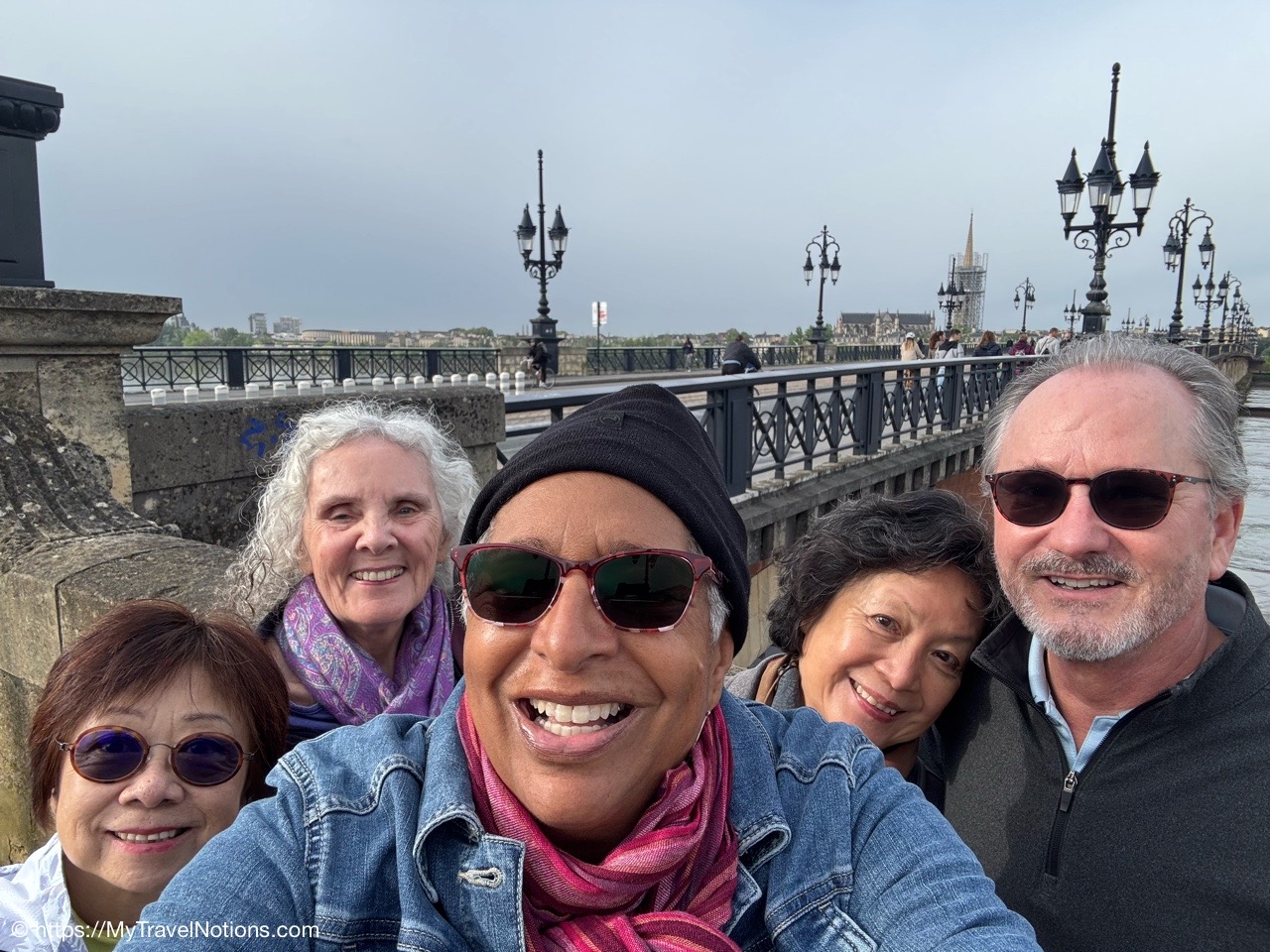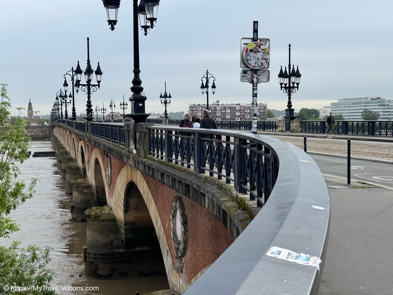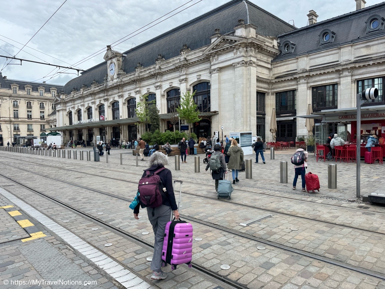 It was just a bit of a chilly, damp morning as we said goodbye to Bordeaux with a group morning walk to the stone bridge of Pont de Pierre, also sometimes referred to as the Pont Napoléon. Connecting the left and right banks of the Garonne, the bridge was commissioned by Napoleon I and inaugurated in 1822 and was the first stone bridge built in Bordeaux. Until then, it was necessary to cross the river by boat. (April 22, 2025)Getting in a morning walk towards the stone bridge of Pont de Pierre, also sometimes referred to as the Pont Napoléon in Bordeaux as our way of saying good-bye to our stay in Bordeaux. (April 22, 2025)First bridge over the river Garonne at Bordeaux, the Pont de Pierre was planned and designed during the First French Empire, under the orders of Napoleon I. (April 22, 2025)Walking along the Pont de Pierre with views of the Garonne river in Bordeaux. (April 22, 2025)Heading back to across the Pont de Pierre, back to our hotel, the Quality Hotel Bordeaux Centre to get cleaned up and finish packing for our tram ride to the Bordeaux Saint-Jean train station and then onto our less than 3-hour train ride to Sarlat-la-Canéda. (April 22, 2025)Heading back to our hotel, the Quality Hotel Bordeaux Centre to get cleaned up and finish packing for our tram ride to the Bordeaux Saint-Jean train station for our less than 3-hour train ride to Sarlat-la-Canéda. (April 22, 2025)Walking past the Porte Cailhau on the way back to the hotel, the Quality Hotel Bordeaux Centre to get cleaned up and finish packing for our tram ride to the Bordeaux Saint-Jean train station for our less than 3-hour train ride to Sarlat-la-Canéda. (April 22, 2025)Walking back through the Place du Parlement with our suitcases and backpacks as we head to tram station at the Place de la Bourse for 10-minute or so tram ride to the Bordeaux Saint-Jean train station. (April 22, 2025)At the Place de la Bourse where we picked up the tram for our 10-minute or so ride to the Bordeaux Saint-Jean train station. (April 22, 2025)Back at the Bordeaux Saint-Jean train station where we began our time into the city and now we’re saying good-bye as we move to our next location of our France & Friends journey: Sarlat-la-Canéda. (April 22, 2025)