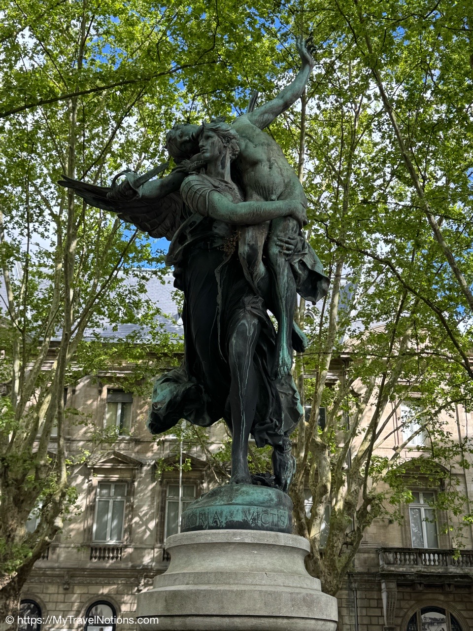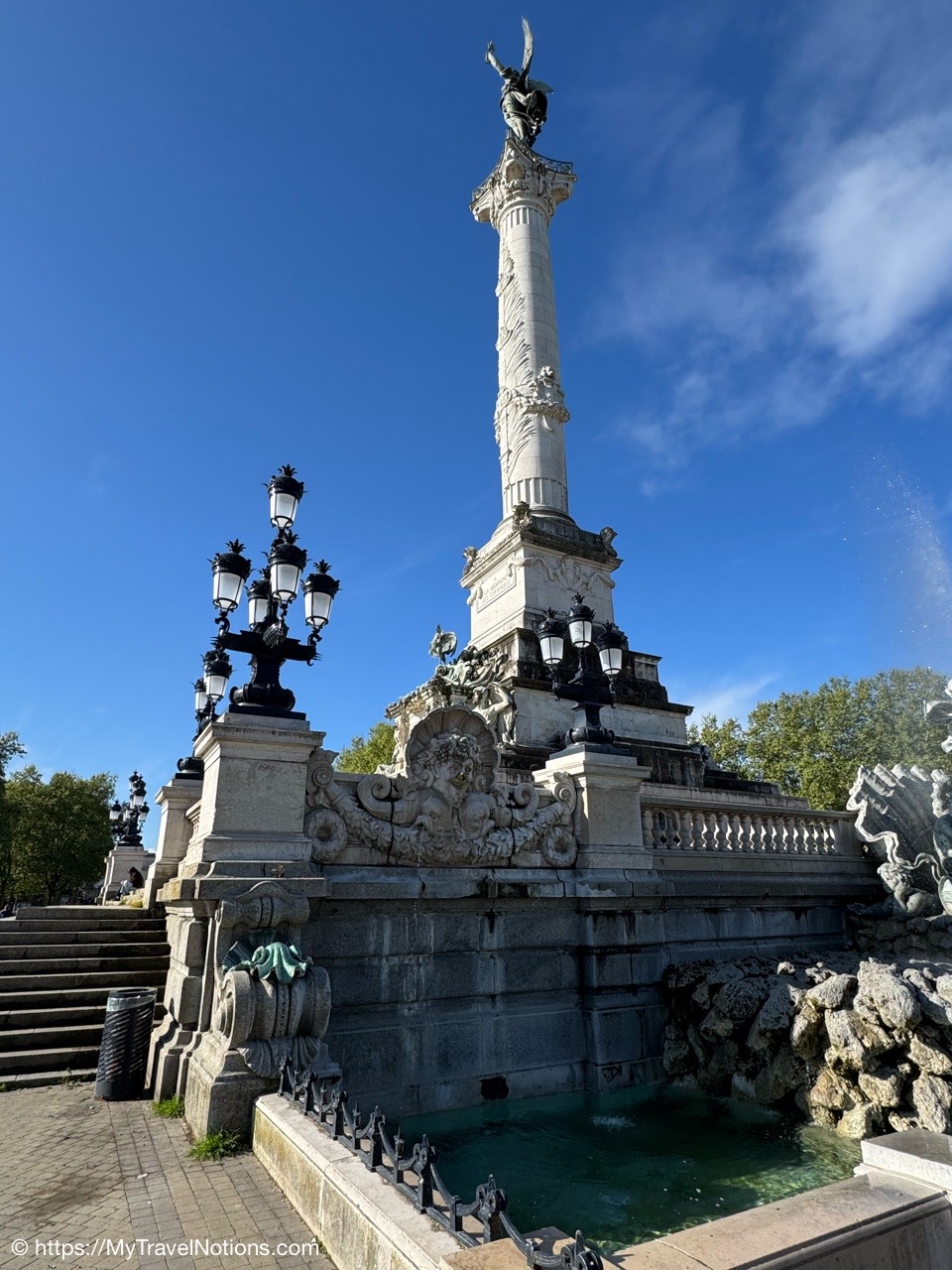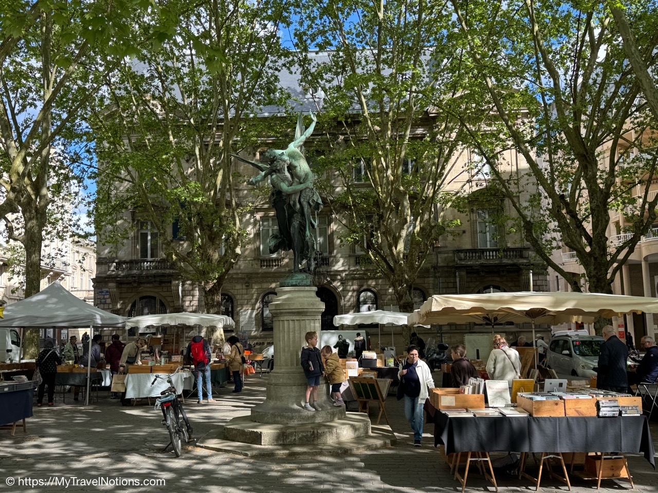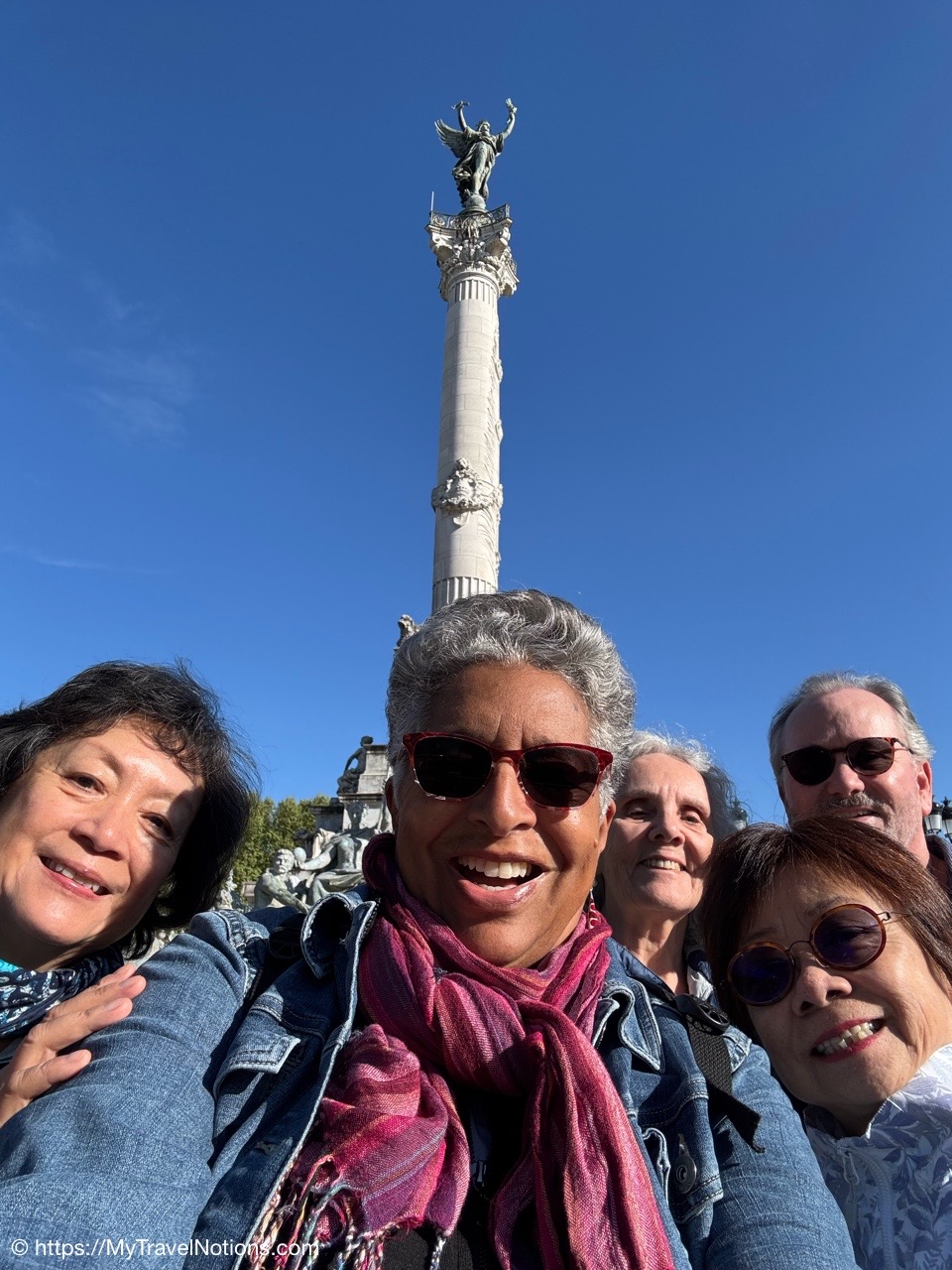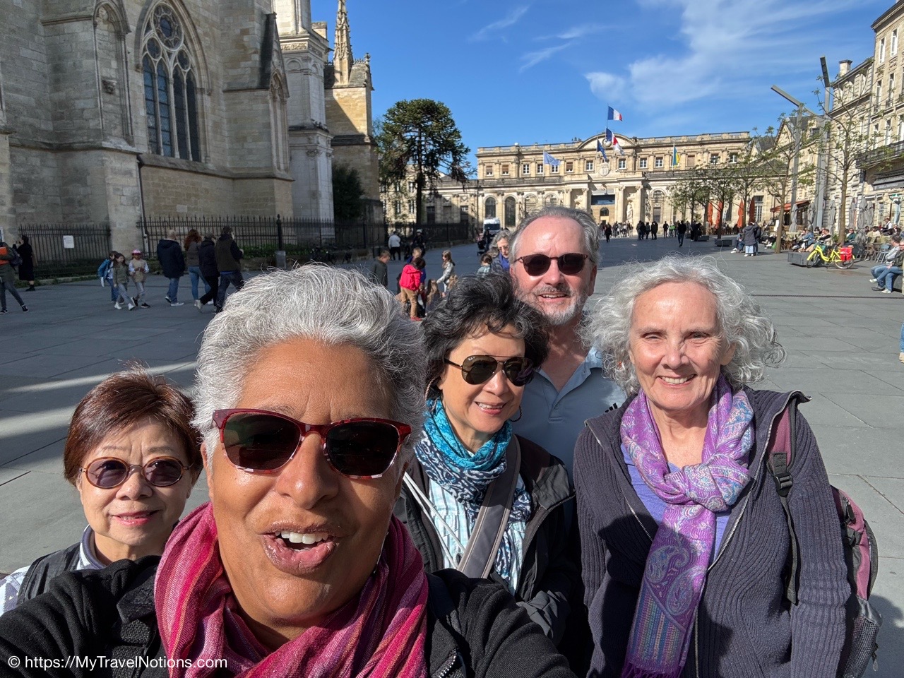 Here we are at the beginning of our morning free walking tour of Bordeaux with the stunning UNESCO World Heritage Monument aux Girondins behind us located in Place des Quinconces, one of the biggest square in Europe. From left: Alice, me, Rosie, Tammy and John. (April 16, 2025)The Monument aux Girondins in Bordeaux was built between 1894 and 1902 in memory of the Girondists who fell victim to the Reign of Terror during the French Revolution. The bronze figures on this size of the fountain symbolizing the Triumph of the Republic. (April 16, 2025)A close-up of the Triumph of the Republic fountain at the Monument aux Girondins in Bordeaux. (April 16, 2025)A close-up of the Triumph of the Republic fountain at the Monument aux Girondins in Bordeaux. (April 16, 2025)The Monument aux Girondins in Bordeaux was built between 1894 and 1902 in memory of the Girondists who fell victim to the Reign of Terror during the French Revolution. The bronze figures on this size of the fountain symbolizing the Triumph of the Republic. (April 16, 2025)At the top of the 177 feet or 54 meter tall Monument aux Girondins, erected between 1894 and 1902 in memory of the Girondists who were beheaded during the French Revolution, is this Statue of Liberty breaking its chains. (April 16, 2025)The Monument aux Girondins in Bordeaux was built between 1894 and 1902 in memory of the Girondists who fell victim to the Reign of Terror during the French Revolution. (April 16, 2025)A cast iron sculpture of a woman’s head, by Spanish artist Jaume Plensa, by the Opéra National de Bordeaux. (April 16, 2025)Walking by the Opéra National de Bordeaux in the heart of the city’s historic center in the Place de la Comédie. (April 16, 2025)Our free morning walking tour group of Bordeaux, standing across from the Opéra National de Bordeaux getting historical information from our wonderful guide, Ani. (April 16, 2025)And, across from the Opéra National de Bordeaux in the Place de la Comédie is the InterContinental Grand Hotel de Bordeaux. In 1789, some 10 years after building the Opera House, architect Victor Louis begins construction of this private hotel for M. Sacriste de Rolly. (April 16, 2025)Walking towards the Église Notre-Dame (also called Saint-Dominique) Baroque style church was constructed at the end of the 17th century (1684- 1707). (April 16, 2025)The Église Notre-Dame (also called Saint-Dominique) Baroque style church was constructed at the end of the 17th century (1684- 1707). (April 16, 2025)The Église Notre-Dame (also called Saint-Dominique) Baroque style church was constructed at the end of the 17th century (1684- 1707). (April 16, 2025)The altar inside the Église Notre-Dame (also called Saint-Dominique) Baroque style church in Bordeaux. (April 16, 2025)The altar inside the Église Notre-Dame (also called Saint-Dominique) Baroque style church in Bordeaux. (April 16, 2025)The pulpit and side chapels inside the Église Notre-Dame (also called Saint-Dominique) Baroque style church in Bordeaux. (April 16, 2025)The pulpit and side chapels inside the Église Notre-Dame (also called Saint-Dominique) Baroque style church in Bordeaux. (April 16, 2025)The side chapels inside the Église Notre-Dame (also called Saint-Dominique) Baroque style church in Bordeaux. (April 16, 2025)Dating from the 19th century, the beautiful stained glass windows at the Église Notre-Dame are attributed to the master Bordeaux glassmakers Villiet and Hutrel. (April 16, 2025)The Chapelle de Sainte Thérèse de l’Enfant-Jésus et de la Sainte Face inside the Église Notre-Dame in Bordeaux in honor of Saint Thérèse who became a Carmelite nun at the age of 15 in 1888 and died at the age of 24 in 1897. (April 16, 2025)Mass being held in the side chapels of the Église Notre-Dame in Bordeaux. (April 16, 2025)This bronze statue of Spanish painter Francisco de Goya (1746-1828) is located just outside the Eglise Notre Dame in the Place du Chapelet in Bordeaux. Although Goya was born in Spain and is considered the most important Spanish artist of the late 18th and early 19th centuries. In 1824 Goya emigrated to Bordeaux, France, where he lived until his death on April 16, 1828 at the age of 82. Goya lived under a cloud of suspicion by the authorities in Spain and in the shadow of the Inquisition. He lost his hearing after a serious illness in 1792, and his health steadily declined. That did, however, give him the pretext of fleeing Spain to seek medical treatment in Bordeaux. (April 16, 2025)Heading through the Passage Sarget in Bordeaux, named after Baron Sarget, a wealthy wine merchant and shipowner, who financed its construction. (April 16, 2025)Inside the Passage Sarget in Bordeaux, named after Baron Sarget, a wealthy wine merchant and shipowner, who financed its construction. (April 16, 2025)Inside the Passage Sarget in Bordeaux, named after Baron Sarget, a wealthy wine merchant and shipowner, who financed its construction. (April 16, 2025)This is one of a number of brass scallop shells on the streets of Bordeaux. It is the symbol of the Camino de Santiago, a pilgrimage since the Middle Ages. (April 16, 2025)Walking along the streets of Bordeaux. (April 16, 2025)Walking along the streets of Bordeaux. (April 16, 2025)Walking along the streets of Bordeaux. (April 16, 2025)A book selling market in the Place Jean-Moulin park across from the main entrance to the Saint André Cathedral in Bordeaux. (April 16, 2025)The bronze statue “Gloria Victis” or Glory to the Vanquished at the Place Jean-Moulin park across from the main entrance to the Cathédrale Saint-André de Bordeaux. The statue was created following the French military defeat in the Franco-Prussian War (1870-71) commemorating those who lost their lives in the conflict. (April 16, 2025)The Cathédrale Saint-André de Bordeaux is a Catholic church dedicated to Saint Andrew. The Cathedral was originally constructed in the 11th century, though little of this remains today. The current Cath