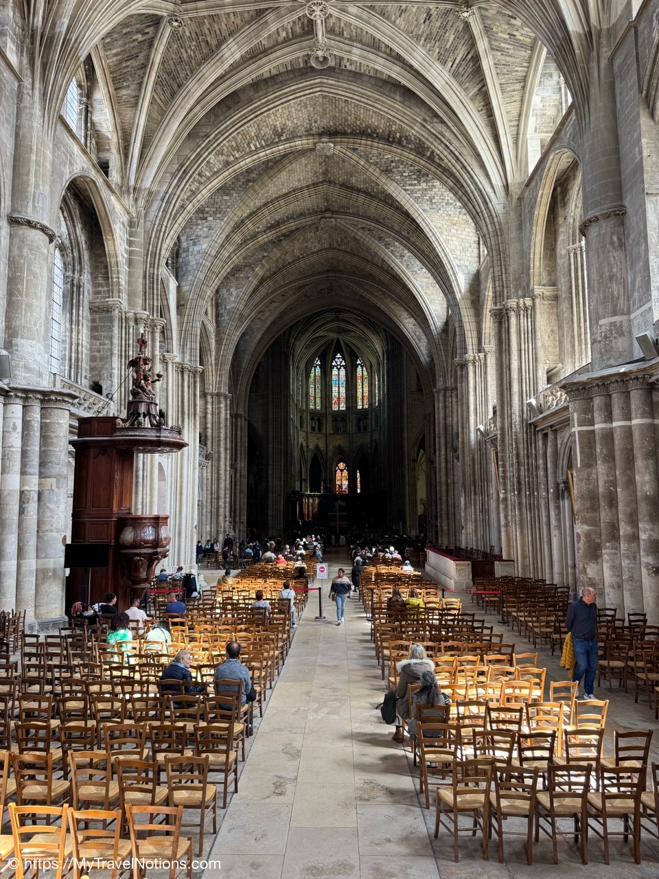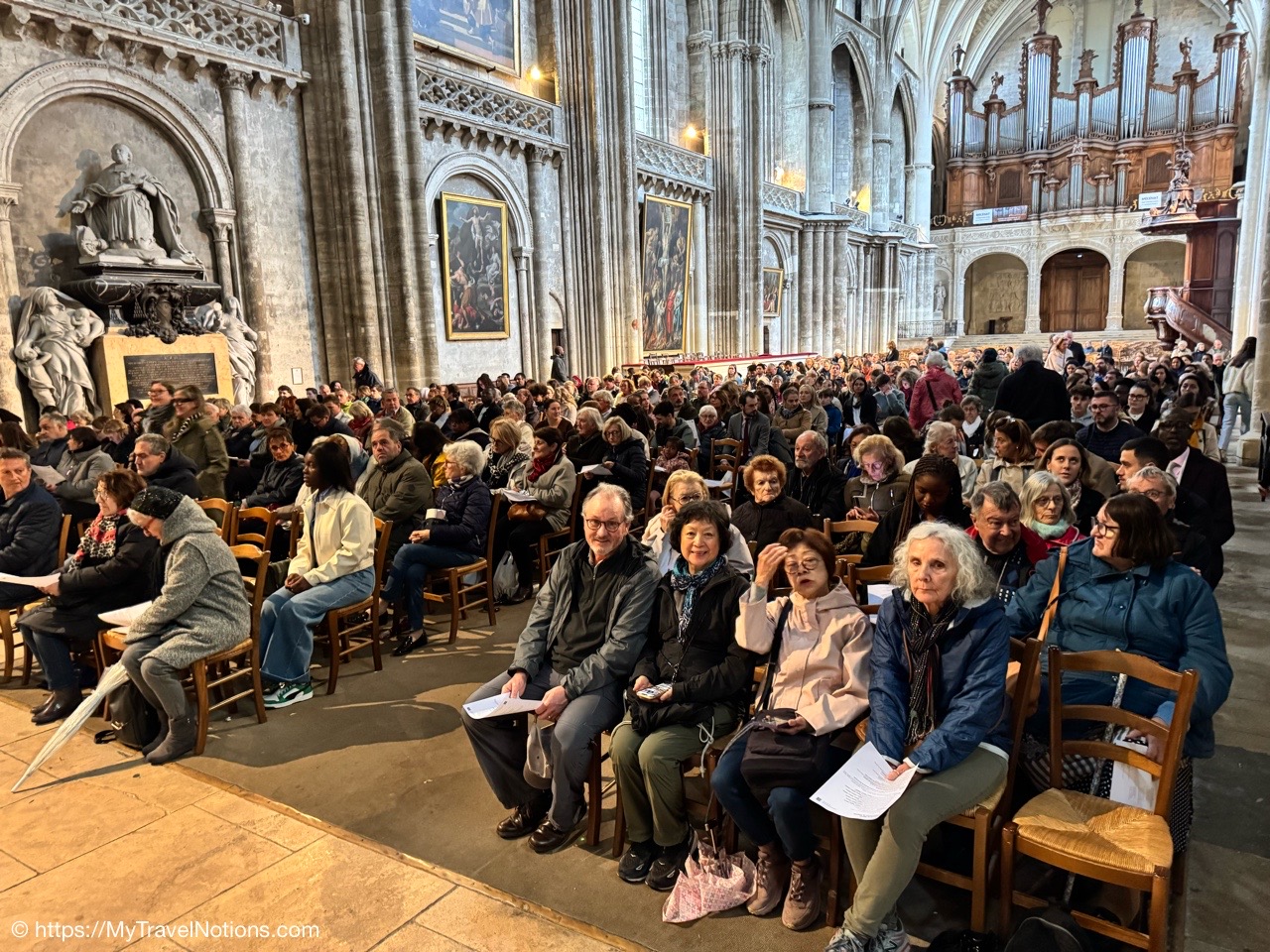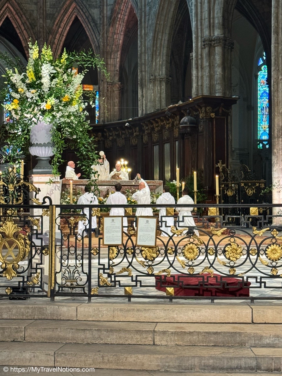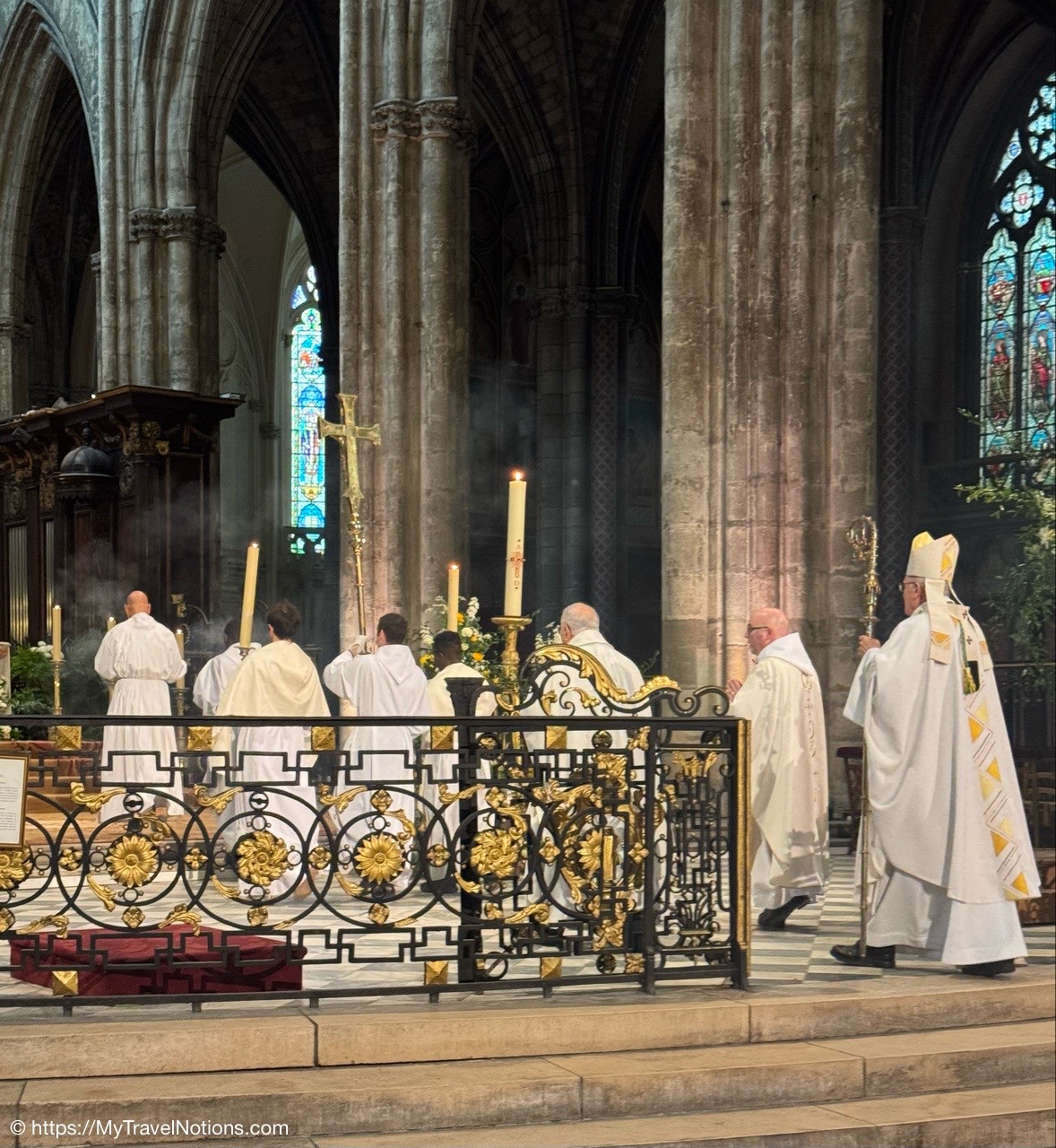 Celebrating Easter Sunday at the Cathédrale Saint-André de Bordeaux with my wonderful traveling friends. From left: John, Alice, Tammy, Rosie and me. (April 20, 2025)Mass at the Cathédrale Saint-André de Bordeaux began at 10:30 a.m. We arrived at the Cathedral early and were able to get these front row seats by the altar as the Cathedral continued to fill up. This is a view inside the nave looking towards the Grand Organ located on a tribune over the west front doorway. (April 20, 2025)The decorated high altar and choir stalls for the Easter Sunday mass at the Cathédrale Saint-André de Bordeaux. (April 20, 2025)The decorated high altar and choir stalls for the Easter Sunday mass at the Cathédrale Saint-André de Bordeaux. (April 20, 2025)The Bishop and priests walking to the high altar to begin the Easter Sunday mass at the Cathédrale Saint-André de Bordeaux. (April 20, 2025)Inside the Cathédrale Saint-André de Bordeaux as the Bishop prepares for Communion. (April 20, 2025)People beginning to come up to take communion at the Cathédrale Saint-André de Bordeaux. For the first time in many, many years, along with my group of friends, took communion. (April 20, 2025)We came back to Le Cafe Francais for our Easter Lunch in Bordeaux. It was still a cool and rainy day so it was nice to return to the restaurant since it is located just across the way from the Cathédrale Saint-André de Bordeaux. (April 20, 2025)This is the Cathédrale Saint-André de Bordeaux a couple of days before the Easter Sunday mass and rain on a beautiful sunny day during our stay in Bordeaux. We actually tried several times to see inside the Cathedral before Easter but it was closed and when it was open, only a small portion was available. (April 16, 2025)The altar inside the Cathédrale Saint-André de Bordeaux a day before the Easter Sunday service. (April 19, 2025)The altar inside the Cathédrale Saint-André de Bordeaux a day before the Easter Sunday service. (April 19, 2025)Looking through the choir to the main altar from the back of the Cathédrale Saint-André de Bordeaux a day before the Easter Sunday service. (April 19, 2025)The long side aisle of the Cathédrale Saint-André de Bordeaux a day before the Easter Sunday service. (April 19, 2025)The side Chapel of Mont-Carmel inside the Cathédrale Saint-André de Bordeaux. (April 19, 2025)The colorful columns in the side Chapel of Mont-Carmel inside the Cathédrale Saint-André de Bordeaux. (April 19, 2025)Another beautiful side chapel inside the Cathédrale Saint-André de Bordeaux, the Chapel of Sacré-Coeur. (April 19, 2025)The beautiful stained glass in the side Chapel of Sacré-Coeur in the Cathédrale Saint-André de Bordeaux. (April 19, 2025)Looking east from the nave to the altar and the choir area behind it inside the Cathédrale Saint-André de Bordeaux where just this portion of the Cathedral was open. (April 19, 2025)From the nave looking west inside the Cathédrale Saint-André de Bordeaux, with its Grand Organ located on a tribune over the west front doorway where just this portion of the Cathedral was open. (April 19, 2025)The beautiful wood pulpit inside the Cathédrale Saint-André de Bordeaux. (April 19, 2025)The Grand organ and its tribune inside the Cathédrale Saint-André de Bordeaux. (April 19, 2025)John, Rosie and me standing in the long line, of ticket holders, in the rain waiting for our turn to get into the Bassins des Lumières to see the Pharaohs of Egypt in Bordeaux’s former submarine base, Culturespaces, a digital art center housed in a former World War II submarine base. (April 20, 2025)In Bordeaux’s former submarine base built by the Germans during World War II, Culturespaces created a digital art center in 2020, the Bassins des Lumières. It is considered the largest digital arts centre in the world and presents monumental immersive digital exhibitions,dedicated to major artists in the history of art and to contemporary art. (April 20, 2025)In Bordeaux’s former submarine base built by the Germans during World War II, Culturespaces created a digital art center in 2020, the Bassins des Lumières. It is considered the largest digital arts centre in the world and presents monumental immersive digital exhibitions,dedicated to major artists in the history of art and to contemporary art. (April 20, 2025)We purchased our tickets in advance online with a timed entry hoping to miss standing in a long line, but that obviously was not the case at the Bassins des Lumières in Bordeaux. (April 20, 2025)Getting closer to entering the Bassins des Lumières in Bordeaux for the Egyptian Pharohs digital exhibition inside a former World War II submarine base built by the Germans. (April 20, 2025)And, look, there’s only one person checking tickets to enter the Bassins des Lumières in Bordeaux for the Egyptian Pharohs digital exhibition inside a former World War II submarine base built by the Germans. (April 20, 2025)The Egyptian Pharaohs digital exhibit at Bassins des Lumières in Bordeaux is an immersive journey through ancient Egypt, showcasing the history, culture, and art of the pharaohs through large-scale digital projections. The exhibit transforms the former submarine base into a vast canvas, displaying images of temples, tombs, hieroglyphs, and monumental statues, bringing the world of the pharaohs to life. In 2018, the city of Bordeaux handed over custody of four of the submarine bunker’s docks to Culturespaces, with the aim of creating a digital arts venue. (April 20, 2025)The Egyptian Pharaohs digital exhibit at Bassins des Lumières in Bordeaux is an immersive journey through ancient Egypt, showcasing the history, culture, and art of the pharaohs through large-scale digital projections. The exhibit transforms the former submarine base into a vast canvas, displaying images of temples, tombs, hieroglyphs, and monumental statues, bringing the world of the pharaohs to life. In 2018, the city of Bordeaux handed over cus