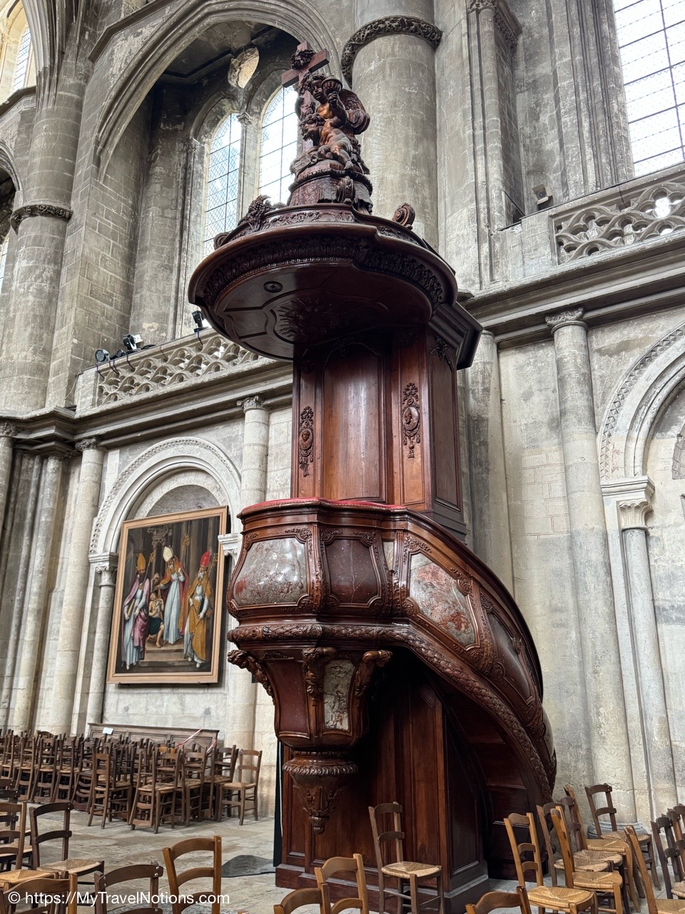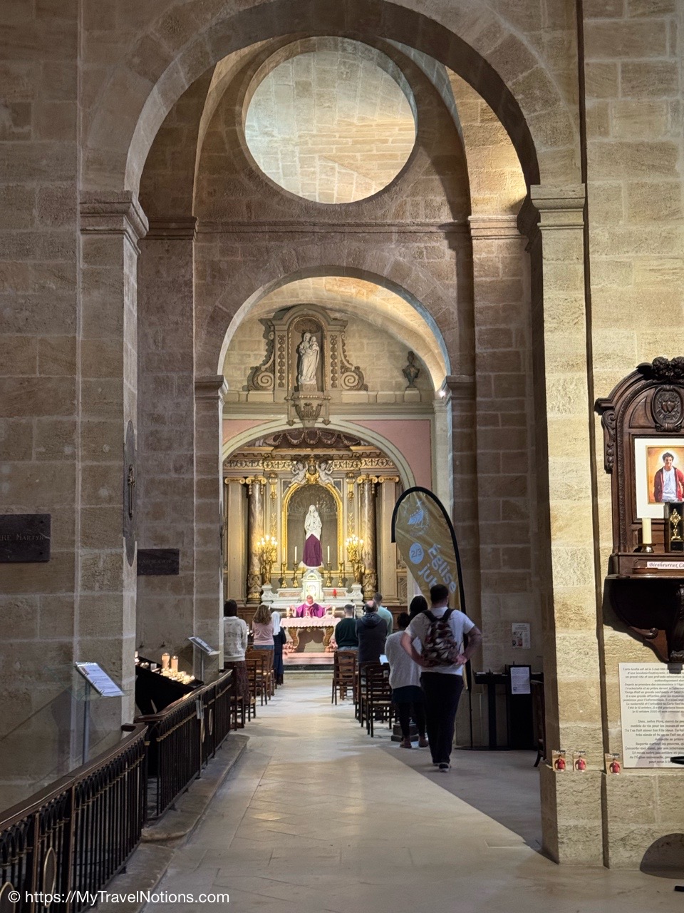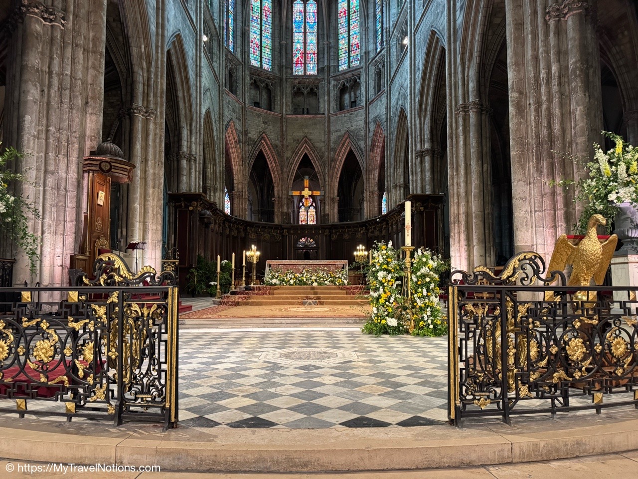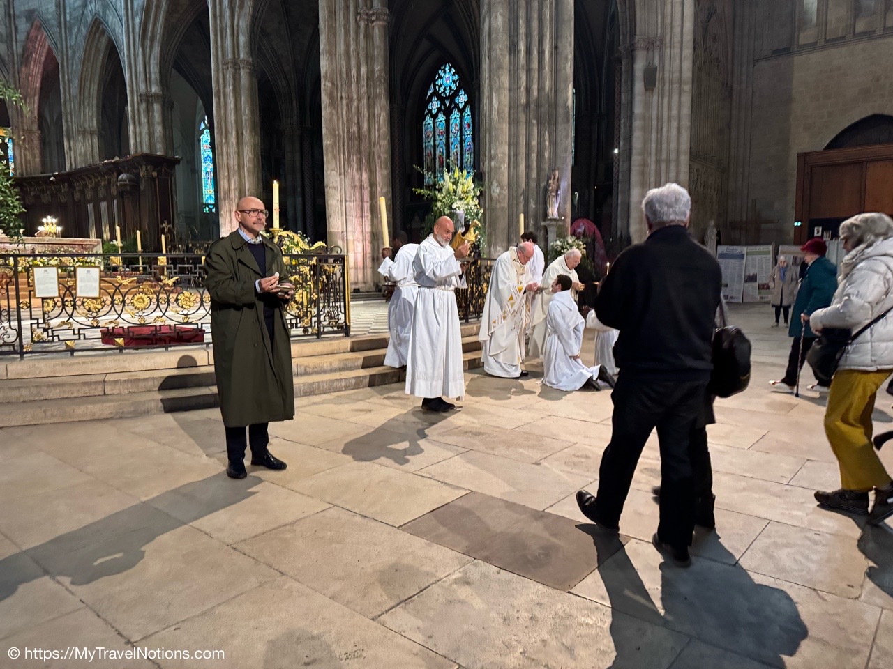 Celebrating Easter Sunday at the Cathédrale Saint-André de Bordeaux with my wonderful traveling friends. From left: John, Alice, Tammy, Rosie and me. (April 20, 2025)Mass at the Cathédrale Saint-André de Bordeaux began at 10:30 a.m. We arrived at the Cathedral early and were able to get these front row seats by the altar as the Cathedral continued to fill up. This is a view inside the nave looking towards the Grand Organ located on a tribune over the west front doorway. (April 20, 2025)The decorated high altar and choir stalls for the Easter Sunday mass at the Cathédrale Saint-André de Bordeaux. (April 20, 2025)The decorated high altar and choir stalls for the Easter Sunday mass at the Cathédrale Saint-André de Bordeaux. (April 20, 2025)The Bishop and priests walking to the high altar to begin the Easter Sunday mass at the Cathédrale Saint-André de Bordeaux. (April 20, 2025)Inside the Cathédrale Saint-André de Bordeaux as the Bishop prepares for Communion. (April 20, 2025)People beginning to come up to take communion at the Cathédrale Saint-André de Bordeaux. For the first time in many, many years, along with my group of friends, took communion. (April 20, 2025)We came back to Le Cafe Francais for our Easter Lunch in Bordeaux. It was still a cool and rainy day so it was nice to return to the restaurant since it is located just across the way from the Cathédrale Saint-André de Bordeaux. (April 20, 2025)This is the Cathédrale Saint-André de Bordeaux a couple of days before the Easter Sunday mass and rain on a beautiful sunny day during our stay in Bordeaux. We actually tried several times to see inside the Cathedral before Easter but it was closed and when it was open, only a small portion was available. (April 16, 2025)The altar inside the Cathédrale Saint-André de Bordeaux a day before the Easter Sunday service. (April 19, 2025)The altar inside the Cathédrale Saint-André de Bordeaux a day before the Easter Sunday service. (April 19, 2025)Looking through the choir to the main altar from the back of the Cathédrale Saint-André de Bordeaux a day before the Easter Sunday service. (April 19, 2025)The long side aisle of the Cathédrale Saint-André de Bordeaux a day before the Easter Sunday service. (April 19, 2025)The side Chapel of Mont-Carmel inside the Cathédrale Saint-André de Bordeaux. (April 19, 2025)The colorful columns in the side Chapel of Mont-Carmel inside the Cathédrale Saint-André de Bordeaux. (April 19, 2025)Another beautiful side chapel inside the Cathédrale Saint-André de Bordeaux, the Chapel of Sacré-Coeur. (April 19, 2025)The beautiful stained glass in the side Chapel of Sacré-Coeur in the Cathédrale Saint-André de Bordeaux. (April 19, 2025)Looking east from the nave to the altar and the choir area behind it inside the Cathédrale Saint-André de Bordeaux where just this portion of the Cathedral was open. (April 19, 2025)From the nave looking west inside the Cathédrale Saint-André de Bordeaux, with its Grand Organ located on a tribune over the west front doorway where just this portion of the Cathedral was open. (April 19, 2025)The beautiful wood pulpit inside the Cathédrale Saint-André de Bordeaux. (April 19, 2025)The Grand organ and its tribune inside the Cathédrale Saint-André de Bordeaux. (April 19, 2025)John, Rosie and me standing in the long line, of ticket holders, in the rain waiting for our turn to get into the Bassins des Lumières to see the Pharaohs of Egypt in Bordeaux’s former submarine base, Culturespaces, a digital art center housed in a former World War II submarine base. (April 20, 2025)In Bordeaux’s former submarine base built by the Germans during World War II, Culturespaces created a digital art center in 2020, the Bassins des Lumières. It is considered the largest digital arts centre in the world and presents monumental immersive digital exhibitions,dedicated to major artists in the history of art and to contemporary art. (April 20, 2025)In Bordeaux’s former submarine base built by the Germans during World War II, Culturespaces created a digital art center in 2020, the Bassins des Lumières. It is considered the largest digital arts centre in the world and presents monumental immersive digital exhibitions,dedicated to major artists in the history of art and to contemporary art. (April 20, 2025)We purchased our tickets in advance online with a timed entry hoping to miss standing in a long line, but that obviously was not the case at the Bassins des Lumières in Bordeaux. (April 20, 2025)Getting closer to entering the Bassins des Lumières in Bordeaux for the Egyptian Pharohs digital exhibition inside a former World War II submarine base built by the Germans. (April 20, 2025)And, look, there’s only one person checking tickets to enter the Bassins des Lumières in Bordeaux for the Egyptian Pharohs digital exhibition inside a former World War II submarine base built by the Germans. (April 20, 2025)The Egyptian Pharaohs digital exhibit at Bassins des Lumières in Bordeaux is an immersive journey through ancient Egypt, showcasing the history, culture, and art of the pharaohs through large-scale digital projections. The exhibit transforms the former submarine base into a vast canvas, displaying images of temples, tombs, hieroglyphs, and monumental statues, bringing the world of the pharaohs to life. In 2018, the city of Bordeaux handed over custody of four of the submarine bunker’s docks to Culturespaces, with the aim of creating a digital arts venue. (April 20, 2025)The Egyptian Pharaohs digital exhibit at Bassins des Lumières in Bordeaux is an immersive journey through ancient Egypt, showcasing the history, culture, and art of the pharaohs through large-scale digital projections. The exhibit transforms the former submarine base into a vast canvas, displaying images of temples, tombs, hieroglyphs, and monumental statues, bringing the world of the pharaohs to life. In 2018, the city of Bordeaux handed over cus