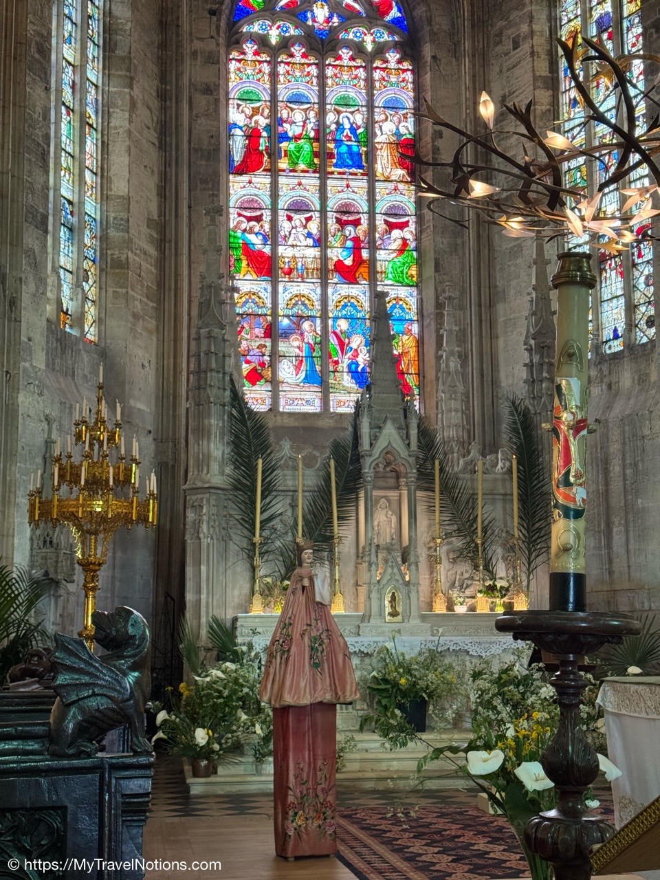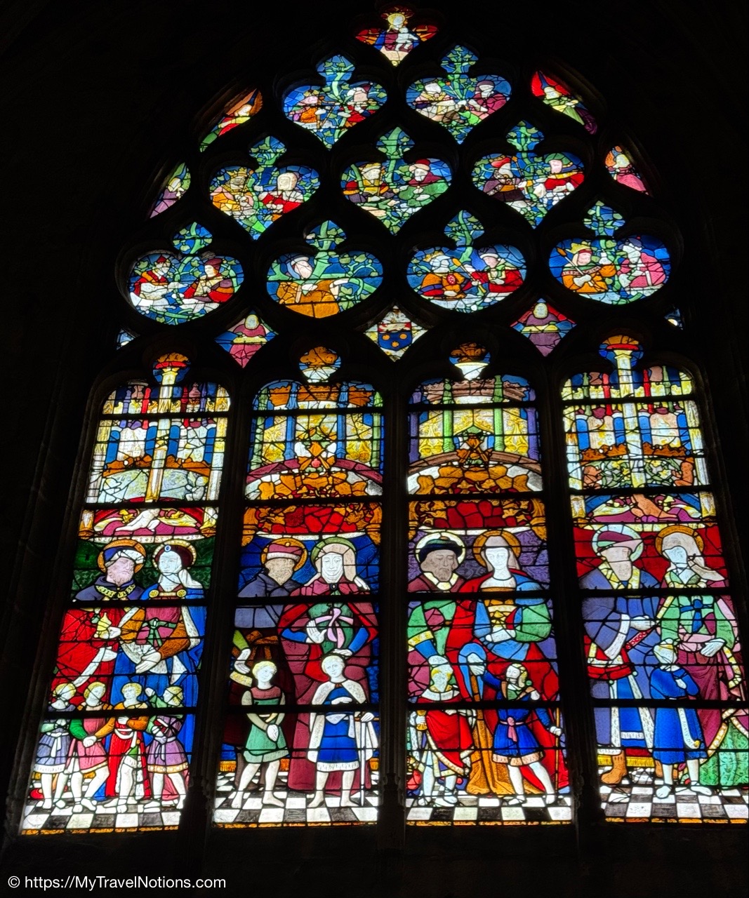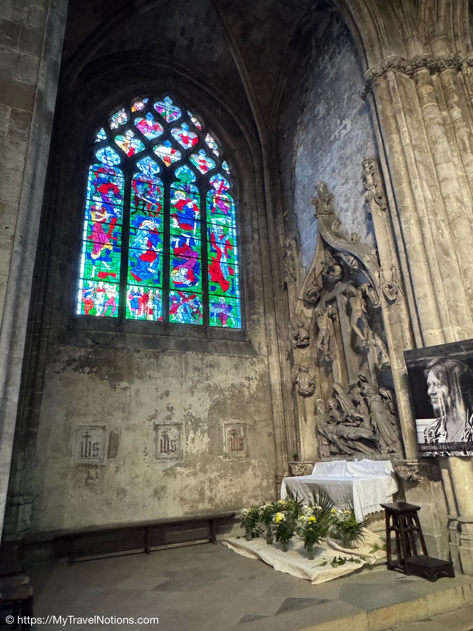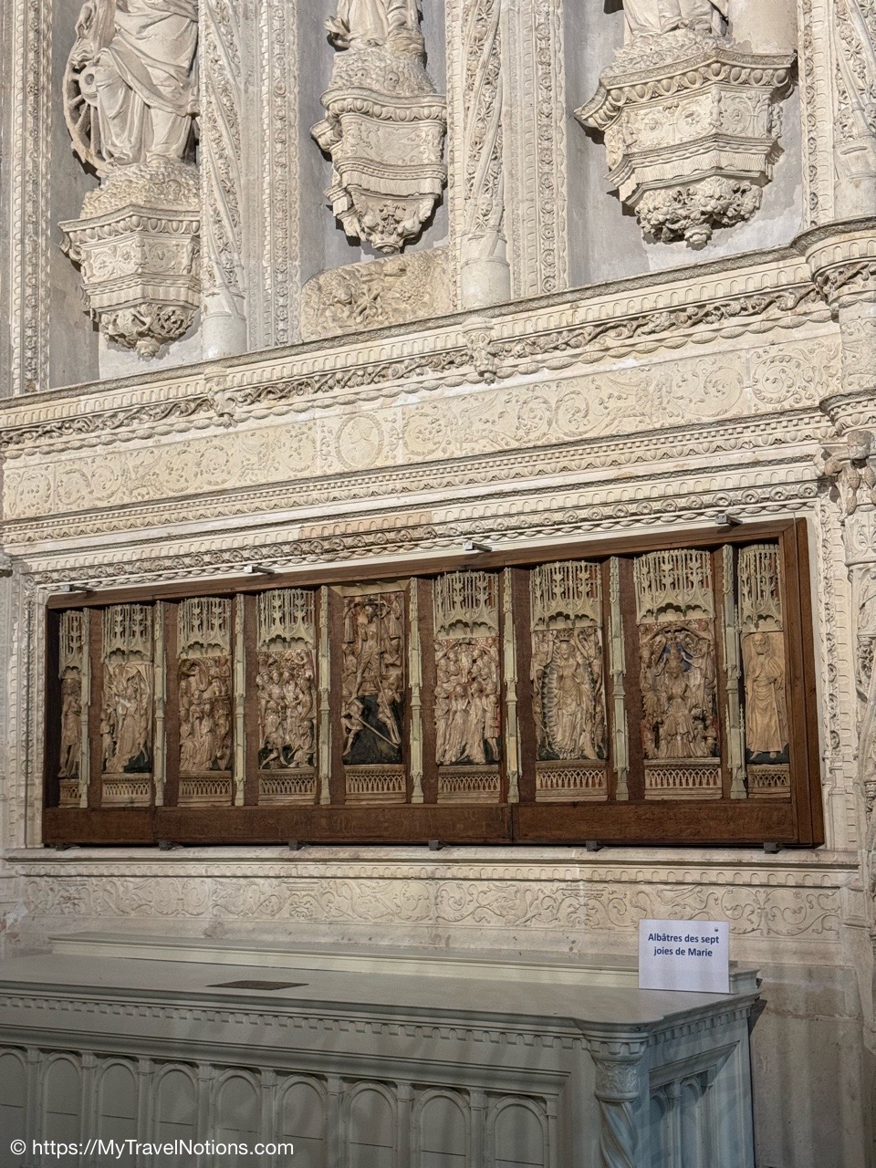Most of the original stained-glass windows at the Basilique Saint-Michel in Bordeaux were blown out by bombs in the Second World War and then replaced in the 50s and 60s by the current impressive stained glass. This stained glass depicts the Holy Kinship and the Tree of Jesse. (April 17, 2025)Inside the Chapel of Saint Joseph at the Basilique Saint-Michel in Bordeaux is this altarpiece of the “Seven Joys of the Virgin” by Thomas Macip which dates from about 1526. (April 17, 2025)The alabaster reliefs, Joys of the Virgin, which depict scenes from the Virgin Mary’s life, have been put back in the altarpiece at the Basilica Saint Michel in Bordeaux after being stolen in 1969 and finally returned back to the church. (April 17, 2025)The alabaster reliefs, Joys of the Virgin, which depict scenes from the Virgin Mary’s life, have been put back in the altarpiece at the Basilica Saint Michel in Bordeaux after being stolen in 1969 and finally returned back to the church. (April 17, 2025)
