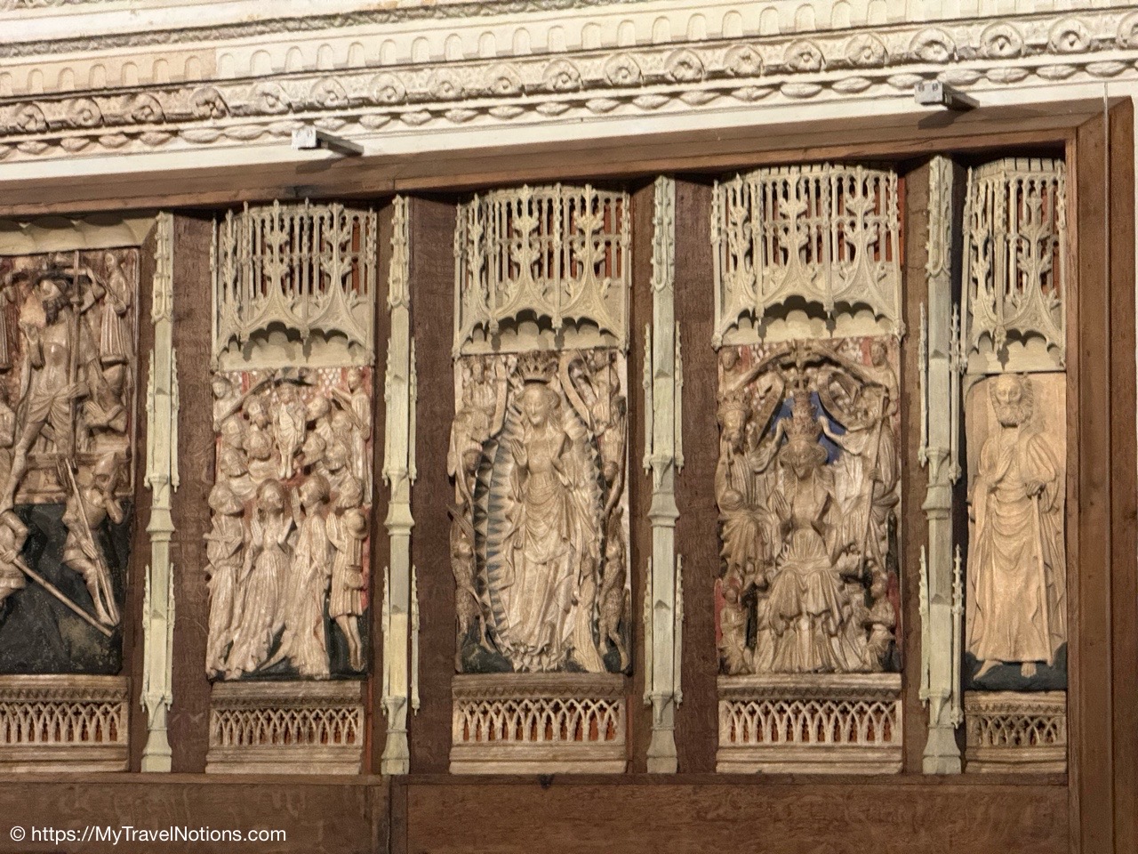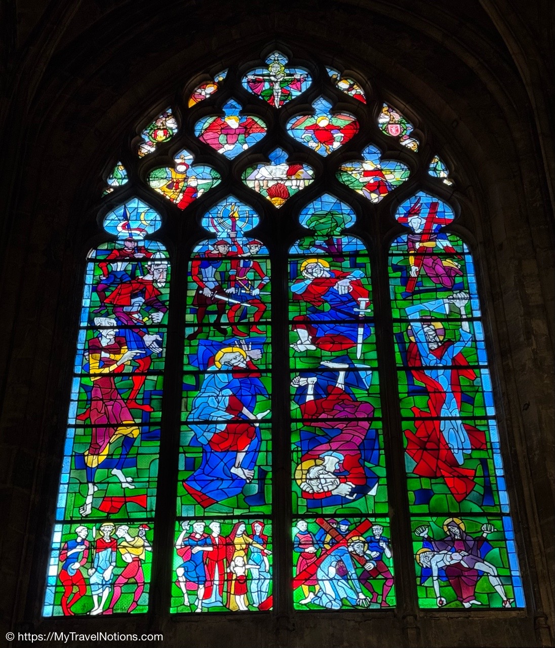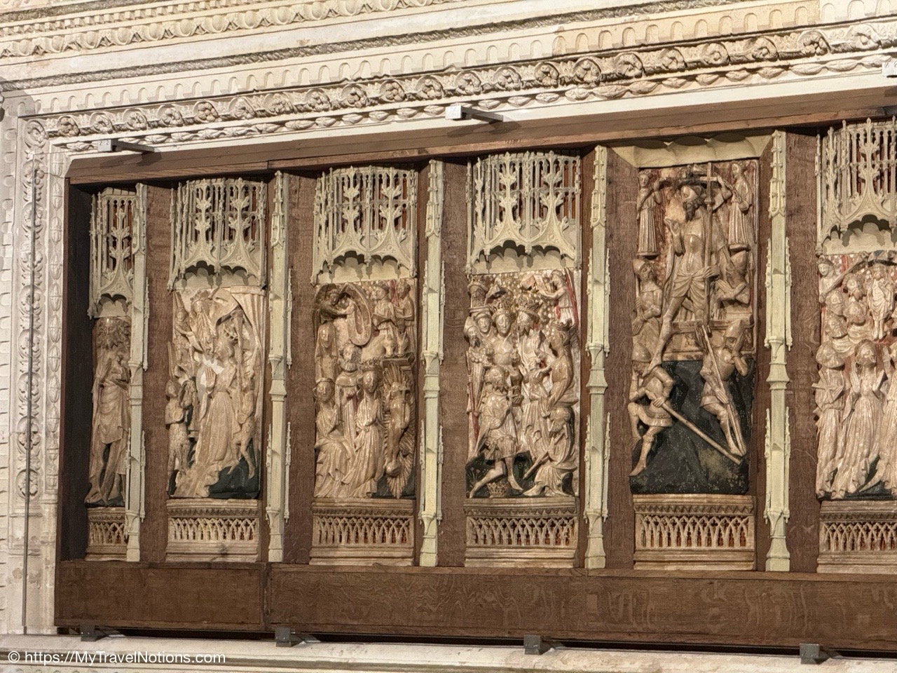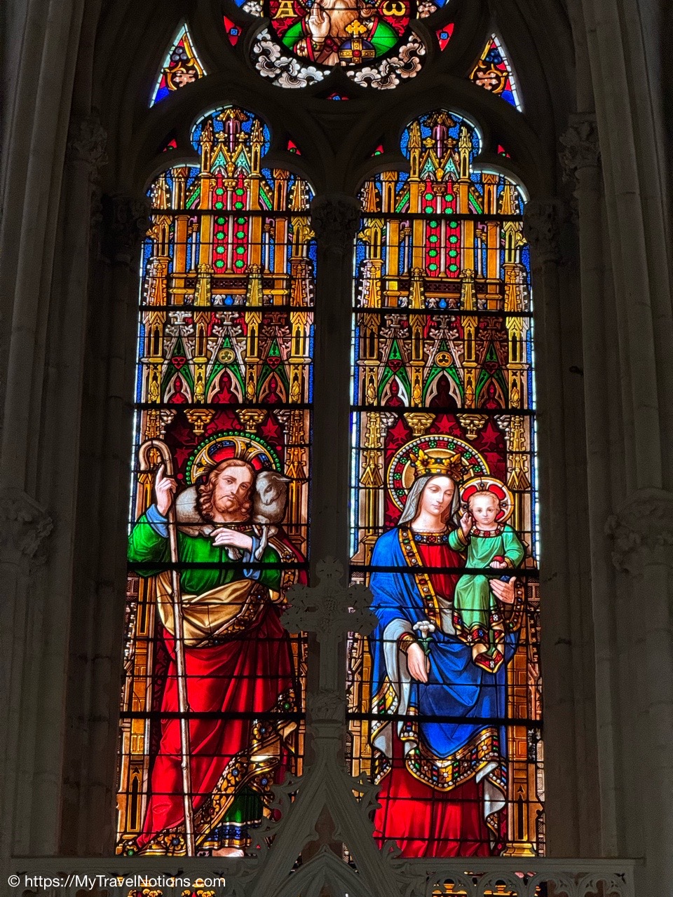 Most of the original stained-glass windows at the Basilique Saint-Michel in Bordeaux were blown out by bombs in the Second World War and then replaced in the 50s and 60s by the current impressive stained glass. This stained glass depicts the Holy Kinship and the Tree of Jesse. (April 17, 2025)Inside the Chapel of Saint Joseph at the Basilique Saint-Michel in Bordeaux is this altarpiece of the “Seven Joys of the Virgin” by Thomas Macip which dates from about 1526. (April 17, 2025)The alabaster reliefs, Joys of the Virgin, which depict scenes from the Virgin Mary’s life, have been put back in the altarpiece at the Basilica Saint Michel in Bordeaux after being stolen in 1969 and finally returned back to the church. (April 17, 2025)The alabaster reliefs, Joys of the Virgin, which depict scenes from the Virgin Mary’s life, have been put back in the altarpiece at the Basilica Saint Michel in Bordeaux after being stolen in 1969 and finally returned back to the church. (April 17, 2025)