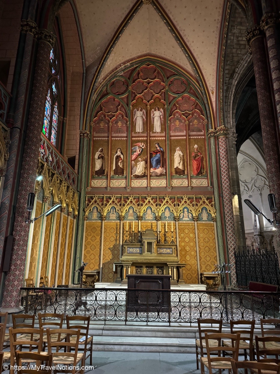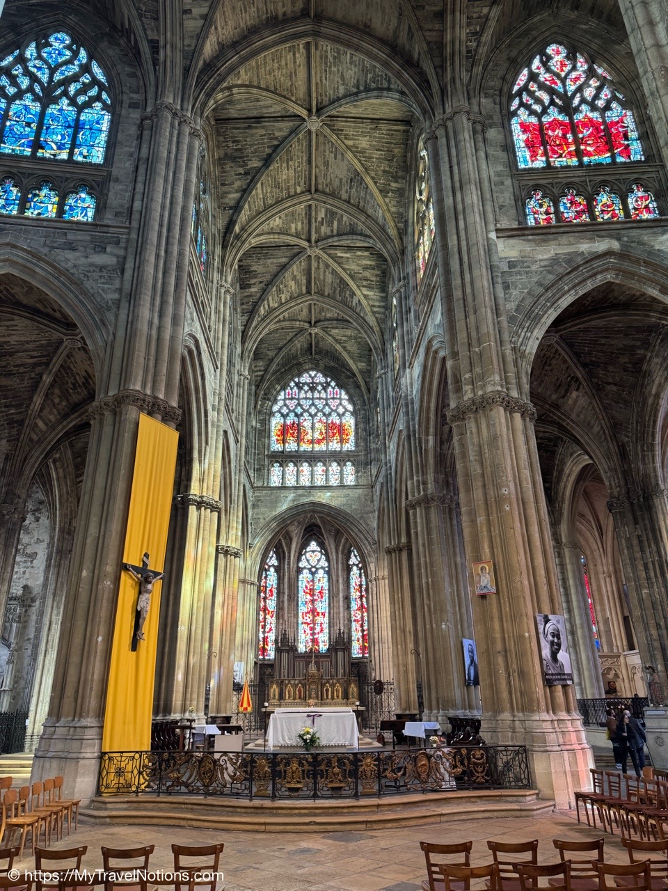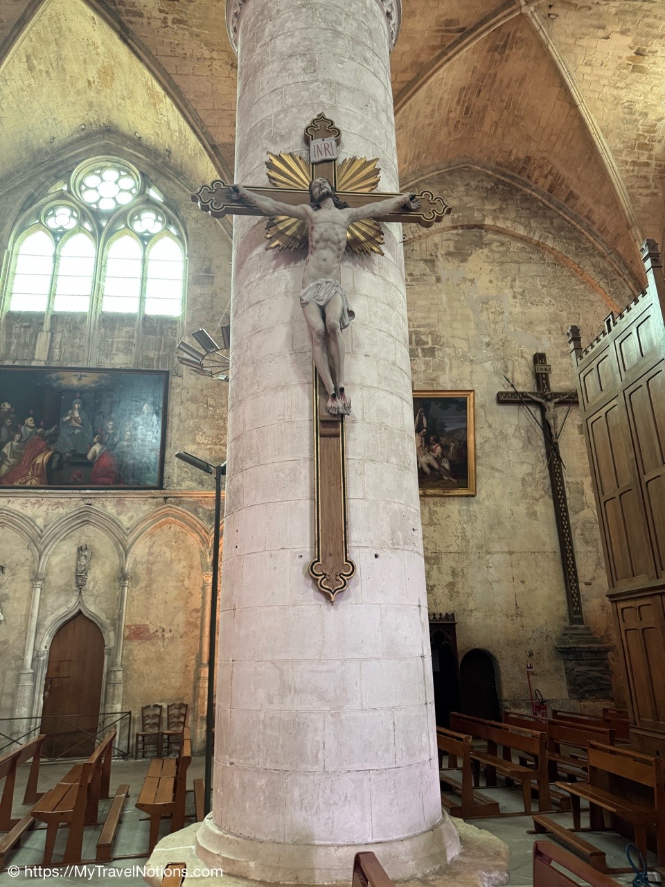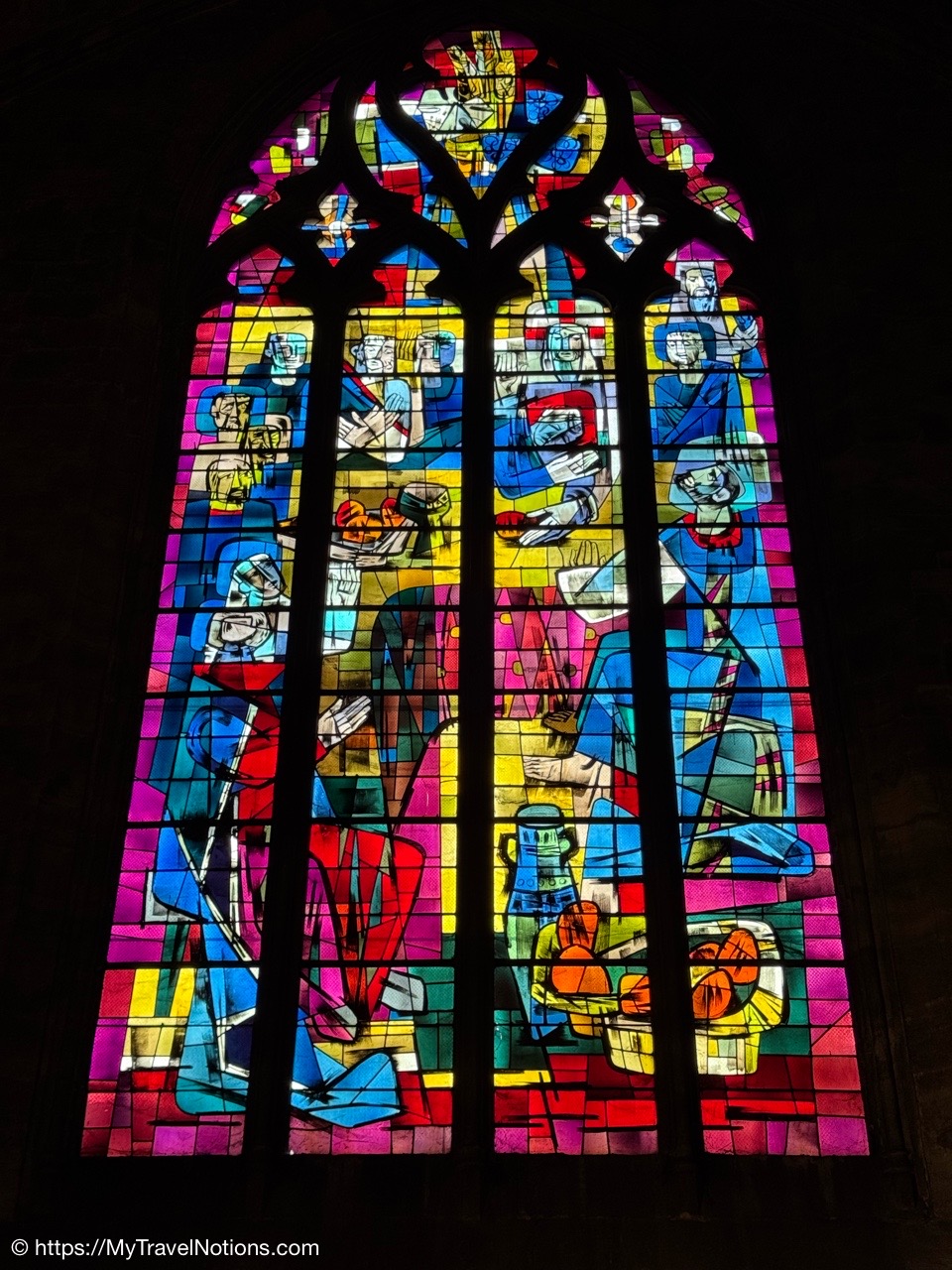 Most of the original stained-glass windows at the Basilique Saint-Michel in Bordeaux were blown out by bombs in the Second World War and then replaced in the 50s and 60s by the current impressive stained glass. This stained glass depicts the Holy Kinship and the Tree of Jesse. (April 17, 2025)Inside the Chapel of Saint Joseph at the Basilique Saint-Michel in Bordeaux is this altarpiece of the “Seven Joys of the Virgin” by Thomas Macip which dates from about 1526. (April 17, 2025)The alabaster reliefs, Joys of the Virgin, which depict scenes from the Virgin Mary’s life, have been put back in the altarpiece at the Basilica Saint Michel in Bordeaux after being stolen in 1969 and finally returned back to the church. (April 17, 2025)The alabaster reliefs, Joys of the Virgin, which depict scenes from the Virgin Mary’s life, have been put back in the altarpiece at the Basilica Saint Michel in Bordeaux after being stolen in 1969 and finally returned back to the church. (April 17, 2025)