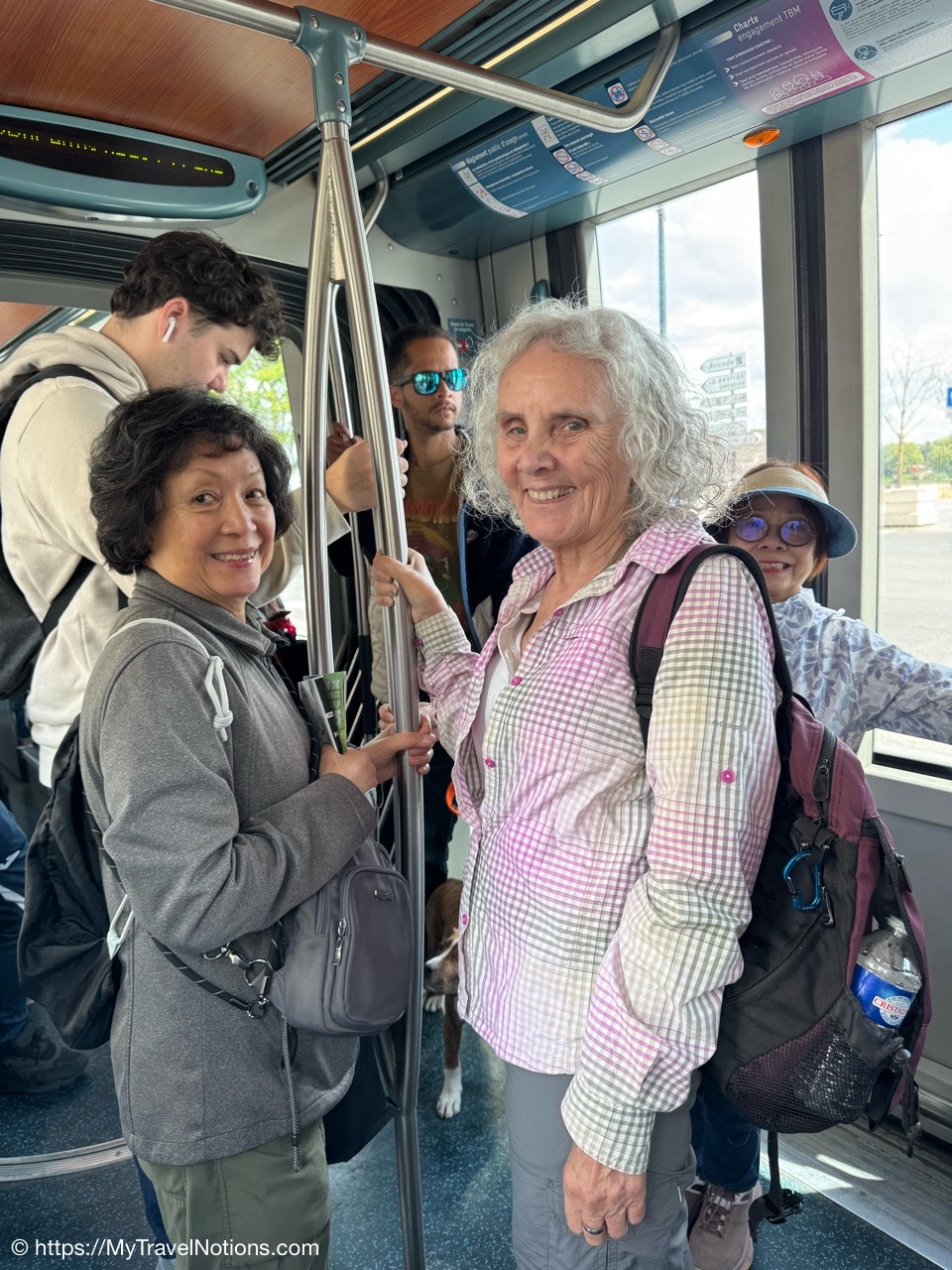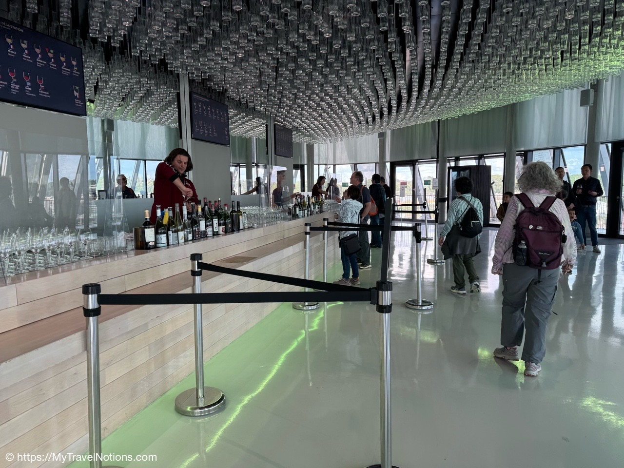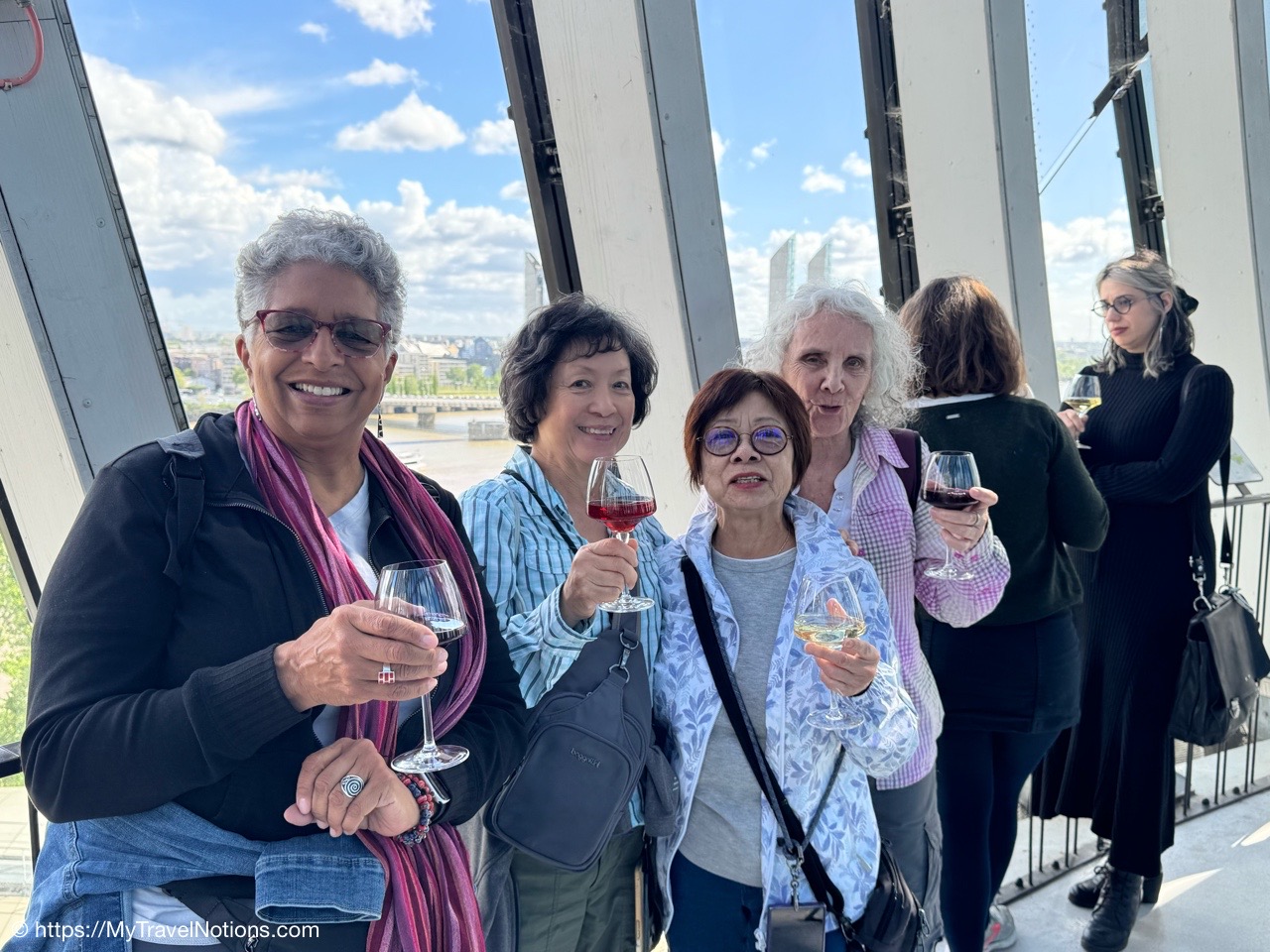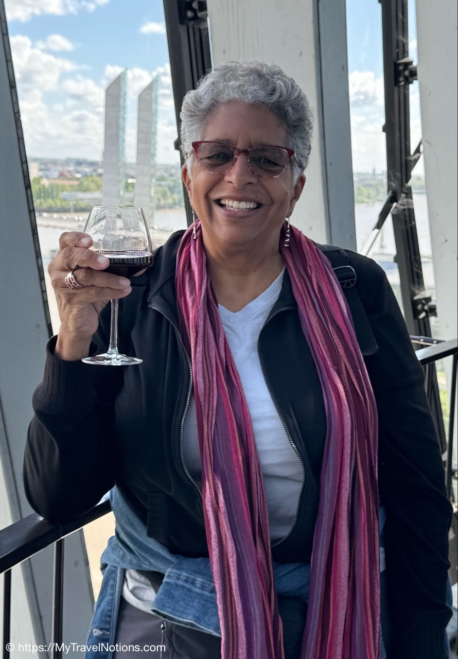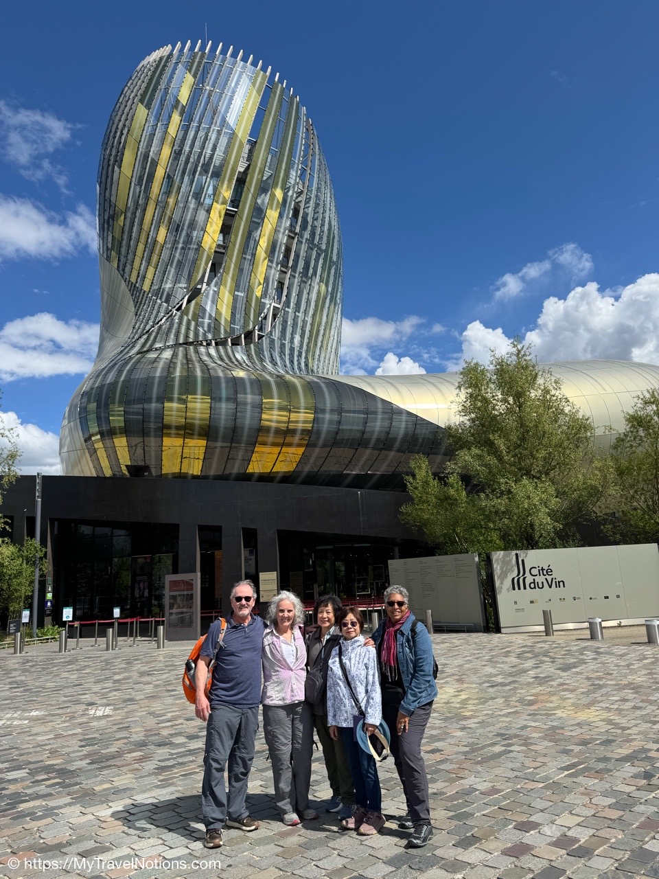 Our group taking the tram to the Cité du Vin wine museum in Bordeaux. The trams are an easy way to get around the city. Ticket machines are there at the stations. Ten rides can be purchased for 15 Euros, around 17.05 USD since the dollar dropped in value due to the tariffs and trade war. (April 16, 2025)Alice, Rosie and Tammy on the tram bound to our visit of the Cité du Vin wine museum in Bordeaux. (April 16, 2025)Getting off the tram at the Cité du Vin stop with views of unusual wine museum building in the distance. I’ve read interesting interpretations of what the architects, Anouk Legendre and Nicolas Desmazières, had designed. A building shaped by symbols of wine like gnarled vine stocks wine swirling in a glass and even a wine decanter all looking to evoke wine’s soul and liquid nature. (April 16, 2025)Getting in a group shot at the entrance of the Cité du Vin wine museum in Bordeaux. From left: John, Rosie, Alice, Tammy and me. (April 16, 2025)Entering the second floor Permanent Exhibition area of the Cité du Vin wine museum in Bordeaux where wine comes alive through a series of exhibitions, videos, projections, shows, audio exhibits and interactive displays. Headsets, in your language of choice, are programmed to come on when you sync it to the red bottoms available by each display. (April 16, 2025)The first exhibit, at the Cité du Vin wine museum in Bordeaux, was a beautiful video journey of vineyards around the world. (April 16, 2025)A vineyard at Saint-Emilion, France, from a video of wine vineyards throughout the world at the Cité du Vin wine museum in Bordeaux. (April 16, 2025)A vineyard at the Canary Islands in Spain from a video of wine vineyards throughout the world at the Cité du Vin wine museum in Bordeaux. (April 16, 2025)An opportunity to listen to wine growers from a display at the Cité du Vin wine museum in Bordeaux talk about their terroirs, the unique environmental factors shaping a wine’s character. (April 16, 2025)A world map at the Cité du Vin wine museum in Bordeaux of where the vines grown. (April 16, 2025)Wine through the civilizations exhibit at the Cité du Vin wine museum in Bordeaux of Egypt, Greece, Rome, the Middle Ages through the 20th century. (April 16, 2025)In Egyptian mythology, Osiris was closely associated with wine as explained at the civilizations exhibit at the Cité du Vin wine museum in Bordeaux. He was considered the inventor of viticulture and taught the Egyptians how to make wine. Osiris was also linked to resurrection and rebirth, and the red color of wine was associated with his blood, which was believed to have reddened the Nile during the annual flood. (April 16, 2025)In Ancient Greece, symposiums were formal social gatherings, particularly for men, where wine was a central element according to the civilizations exhibit at the Cité du Vin wine museum in Bordeaux. Symposiums involved conversation, music, and sometimes other entertainment, with the wine acting as a social lubricant and a catalyst for discussion. The wine was always mixed with water, typically in a krater. (April 16, 2025)A look into an Ancient Greek symposium of the civilizations exhibit at the Cité du Vin wine museum in Bordeaux. It’s where formal social gatherings, particularly for men, where wine was a central element. Symposiums involved conversation, music, and sometimes other entertainment, with the wine acting as a social lubricant and a catalyst for discussion. Wine was a key part of Greek culture, seen as a gift from the gods and a symbol of hospitality and social connection. (April 16, 2025)France is estimated to have over 38,000 wine-producing chateaus as shown examples of at the civilizations exhibit at the Cité du Vin wine museum in Bordeaux. A significant portion of these chateaus, including many prestigious ones, are located in the Bordeaux region, with over 8,650 producers. (April 16, 2025)The vine itself on display at the Cité du Vin wine museum in Bordeaux. (April 16, 2025)A display of a variety wine grapes shown at the Cité du Vin wine museum in Bordeaux. There are over 10,000 different varieties of wine grapes in the world today. (April 16, 2025)Checking out “The Epic Tale of Bordeaux” video documenting more than 2,000 years of wine-making history at the Cité du Vin wine museum in Bordeaux. (April 16, 2025)The Romans are credited with bringing wine grape vines to the Bordeaux region as discussed during this 2,000 years “Epic Tale of Bordeaux” at the Cité du Vin wine museum in Bordeaux. The Romans took over the area around 60 BC and began cultivating vineyards and producing wine. (April 16, 2025)La Cave, the wine cellar shop, on the ground floor of the Cité du Vin wine museum in Bordeaux. (April 16, 2025)La Cave, the wine cellar shop, on the ground floor of the Cité du Vin wine museum in Bordeaux. (April 16, 2025)And, yes, there’s also a gift shot on the ground floor of the Cité du Vin wine museum in Bordeaux. (April 16, 2025)Inside the Belvédère bar on the eighth floor, where we were served our glasses of wine at the Cité du Vin wine museum in Bordeaux. (April 16, 2025)Me enjoying my glass of Bordeaux rouge wine outside of the Belvédère bar on the eighth floor open-air balcony-style viewing area of the Cité du Vin wine museum in Bordeaux. (April 16, 2025)Our visit at the Cité du Vin wine museum ended with a glass of wine at the Belvédère bar on the eighth floor of the museum. This lofty bar is encircled by an open-air balcony-style viewing area, which gives you incredible views of Bordeaux. (April 16, 2025)Views of the Pont Jacques Chaban-Delmas bridge over the Garonne River as seen from the Cité du Vin wine museum’s eight floor Belvédère bar with its open-air balcony-style viewing area of Bordeaux. Constructed between 2009 and 2012, it was named after Jacques Chaban-Delmas, a French politician who served as Mayor of Bordeaux for nearly 50 years. Its central span rises to allow large ships to pass