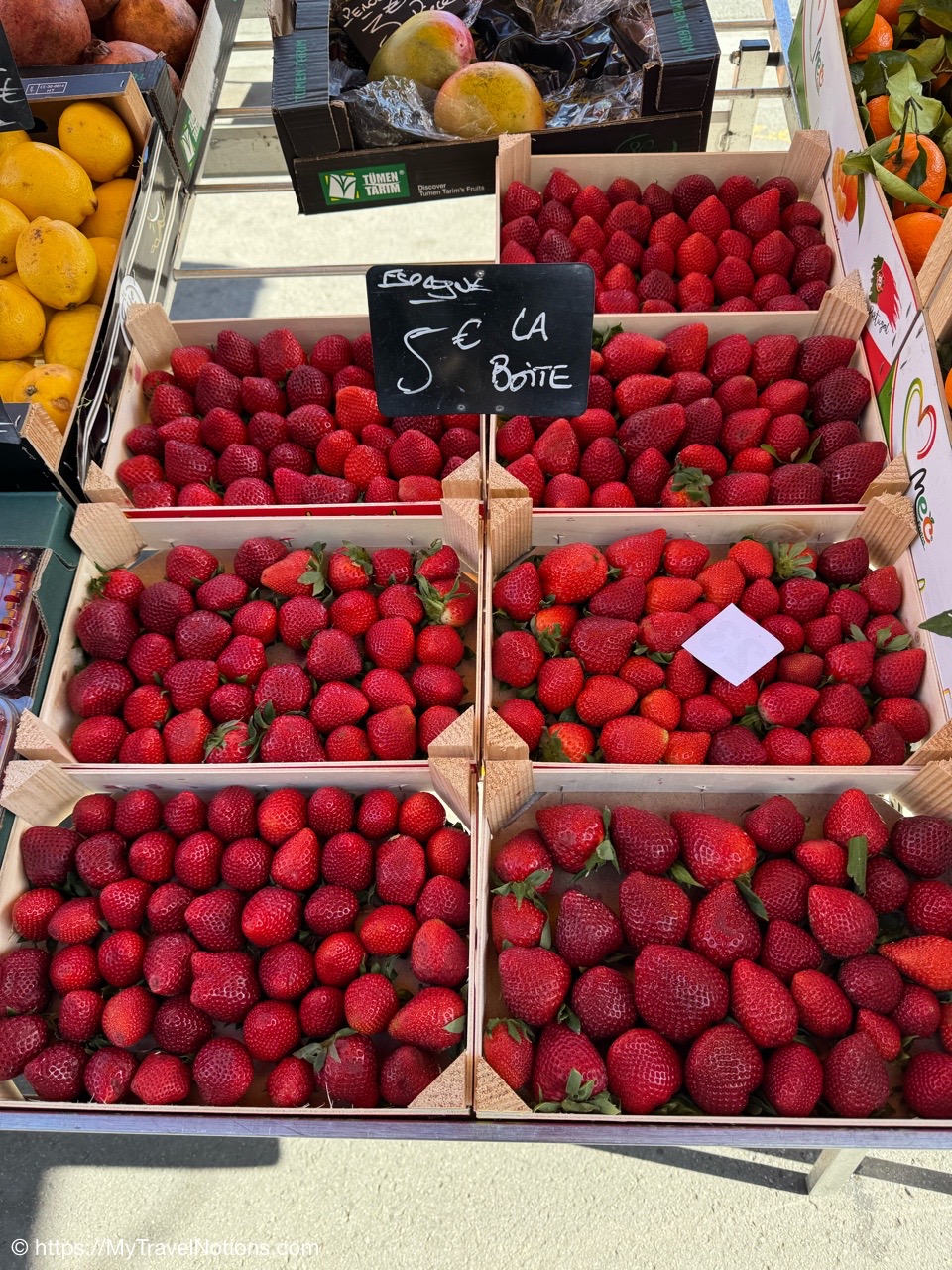 At the Marché des Capucins or Capuchins Market in the Saint-Michel district of Bordeaux. It’s a long-established market, which began in the offering local produce, cheese & wine, plus prepared foods & coffee. From left: John, Rosie, me Kim, Alice and Tammy. (April 17, 2025)The beautiful fresh fruits at the Marché des Capucins in Bordeaux. (April 17, 2025)Look at those delicious strawberries, which we ended up buying at the Marché des Capucins in Bordeaux and having as a tasty desert, with cream for our lunch. (April 17, 2025)Rabbit, but duck is the meat of southwest of France, at a market vendor at the Marché des Capucins in Bordeaux. (April 17, 2025)Getting in a quick group selfie at the Marché des Capucins in Bordeaux while buying shrimp and sea snails at a seafood vendor. (April 17, 2025)This is just a small portion of the varieties of seafood available at the Marché des Capucins in Bordeaux. We bought the shrimp and the sea snails in the upper right hand corner. (April 17, 2025)Kim (center) discussing the variety of breads (with Tammy and Alice) at the a bulangerie vendor who sells their baked and cakes at the Marché des Capucins in Bordeaux. (April 17, 2025)A plethora of olives from Turkey at the Marché des Capucins in Bordeaux. (April 17, 2025)Fresh vegetables at the Marché des Capucins in Bordeaux. (April 17, 2025)I’m not much for cheese, but in France is an important staple so several of our group members wanted cheese from this cheese vendor at the Marché des Capucins in Bordeaux. (April 17, 2025)