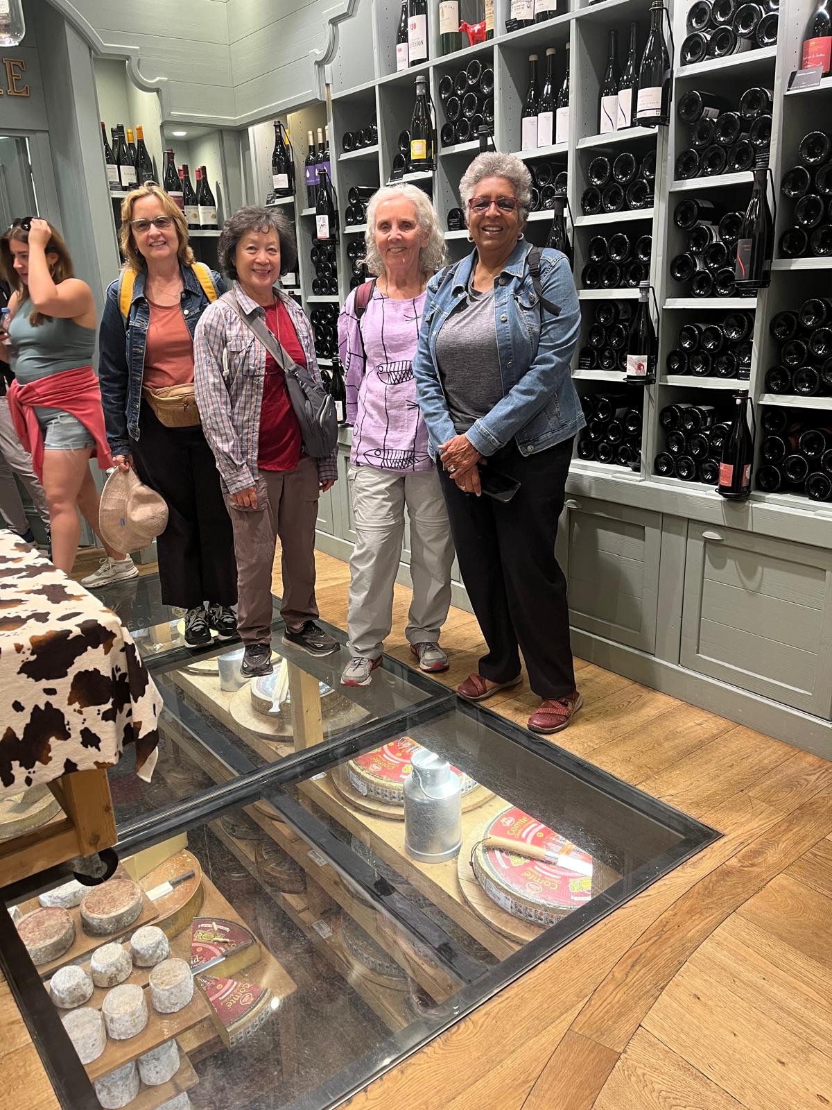 Our little group inside the Pierre Gay in Annecy, our 1st food walking tour stop, standing by the wine rack and glass floor showing the cheese cellar. (May 19, 2025)