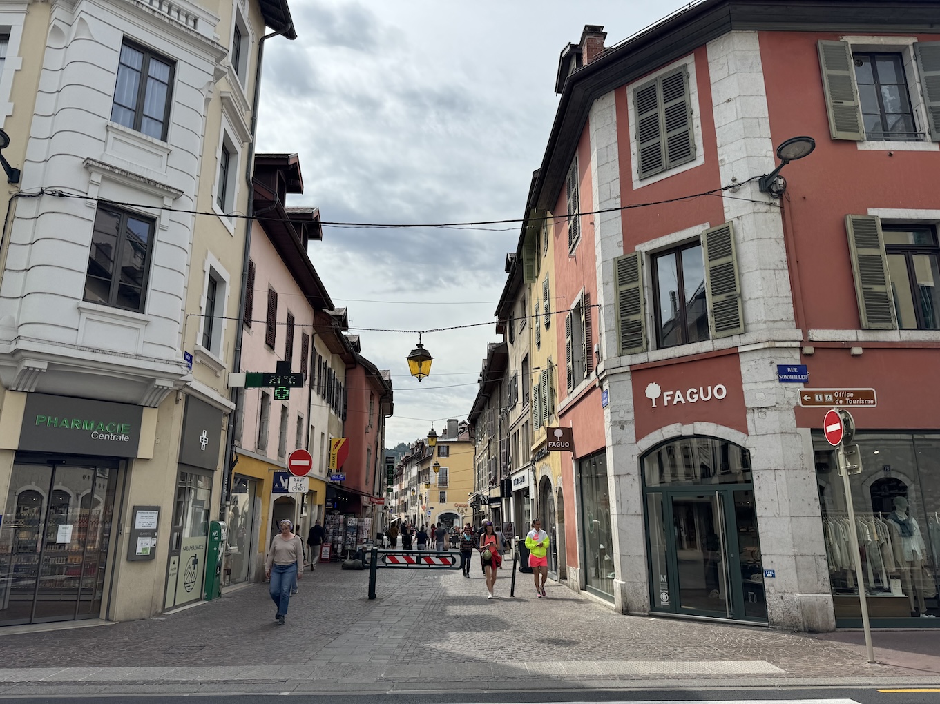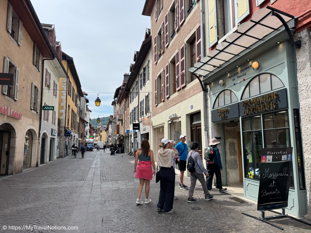 Walking back into old town Annecy for our 1st food walking tour stop for cheese and wine at Pierre Gay in Annecy. (May 19, 2025)