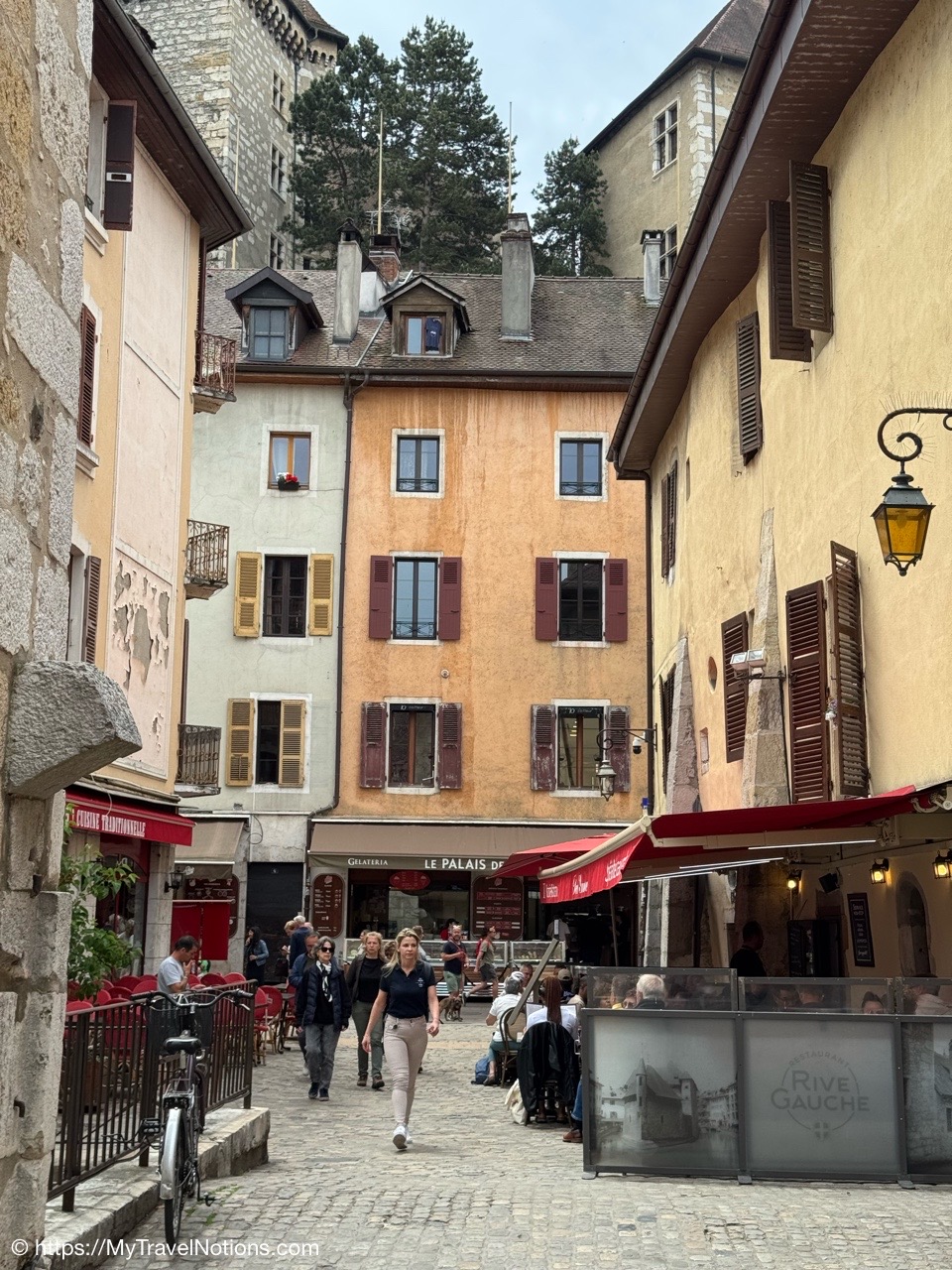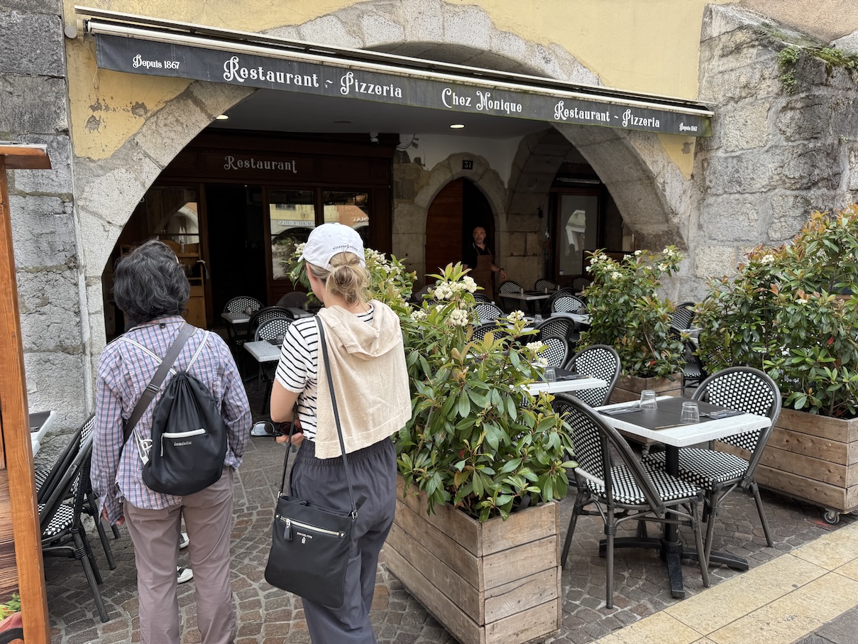 Heading to our 2nd food walking tour stop for a meal at the Restaurant Chez Monique in Annecy. (May 19, 2025)