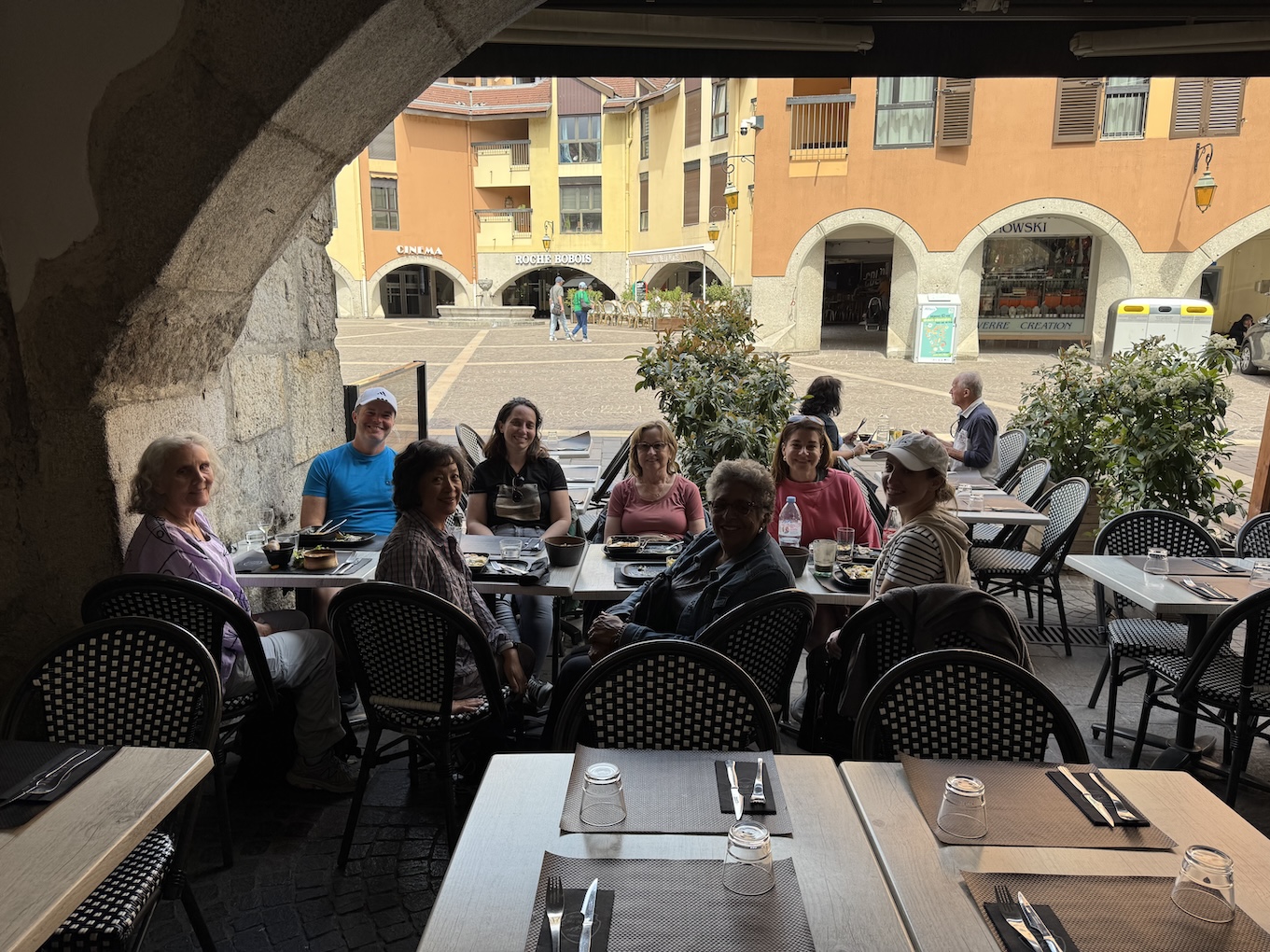 Our tour group at the 2nd stop of our food walking tour at Restaurant Chez Monique, an Italian restaurant in old town Annecy. Interestingly enough, Rosie, Janet and I ate here last night for dinner where I had spaghetti bolognese. (May 19, 2025)