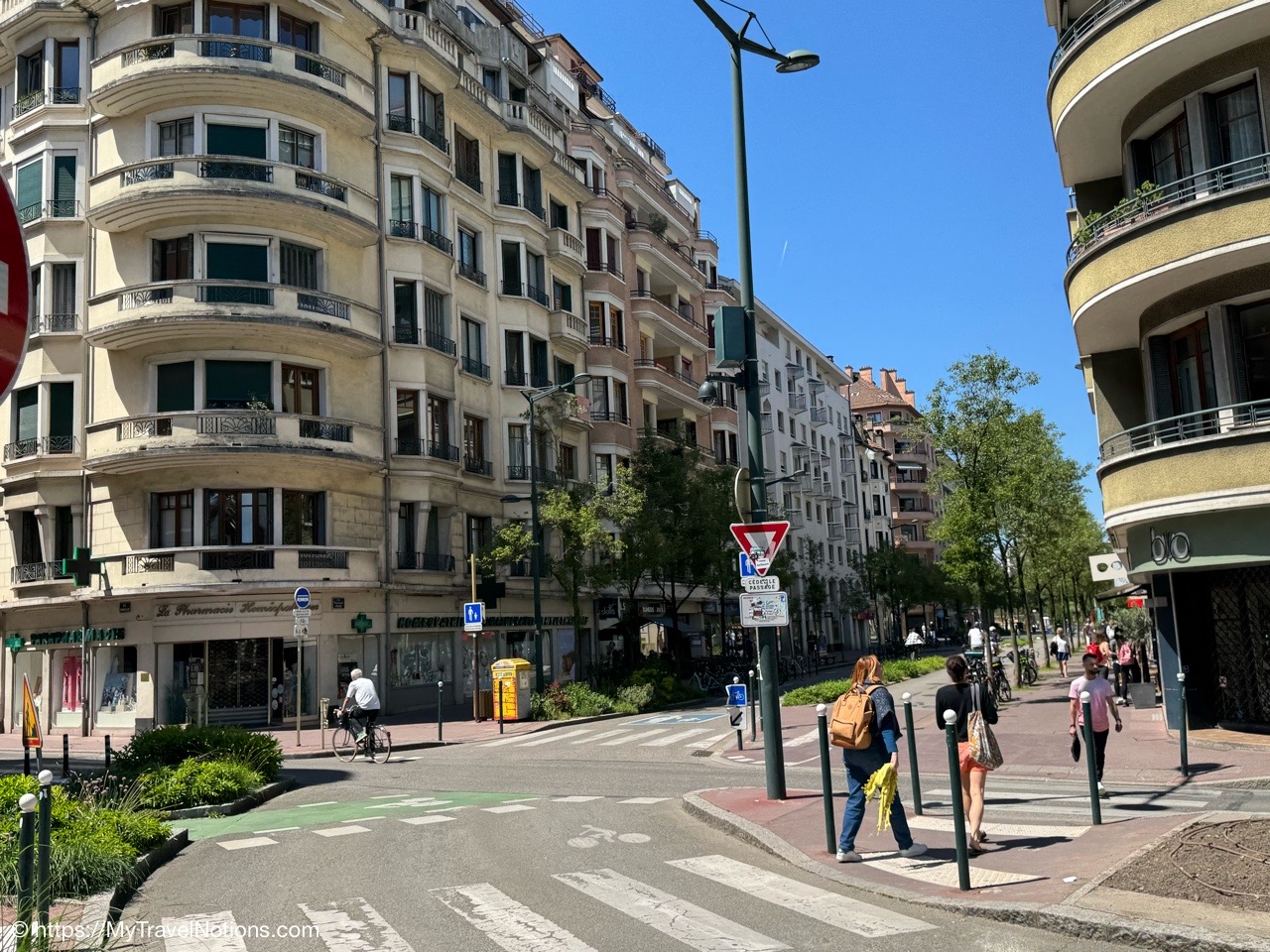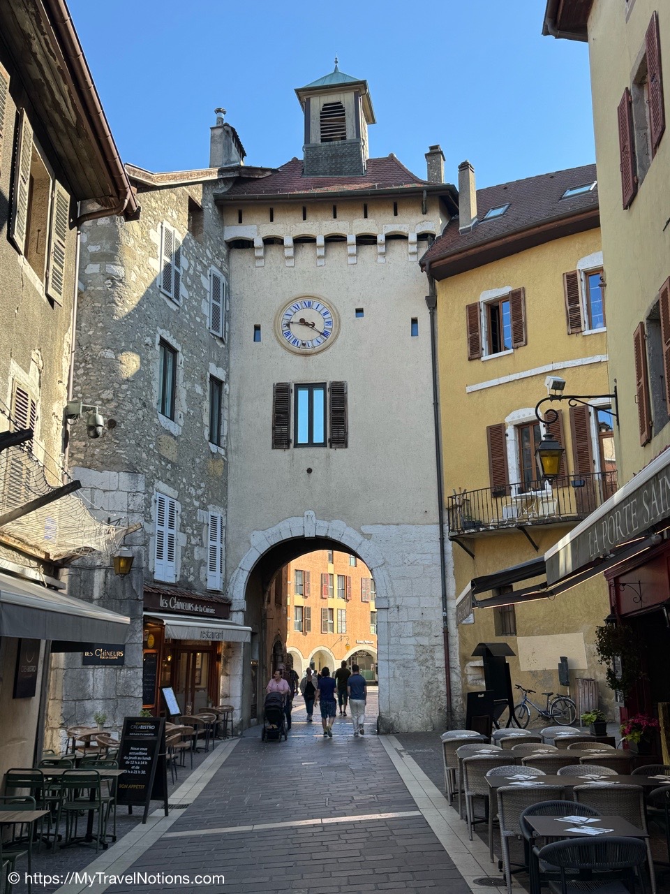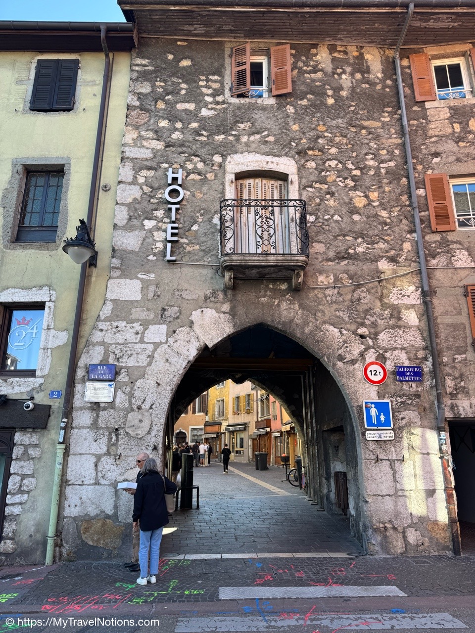 The entrance into the old town of Anncey along the Faubourg des Balmettes. Very little remains of the old city wall, which surrounded the city and remained almost intact until the early 19th century. However, Old Annecy has been able to preserve the most typical elements of the fortified town, namely the gates. (May 17, 2025)