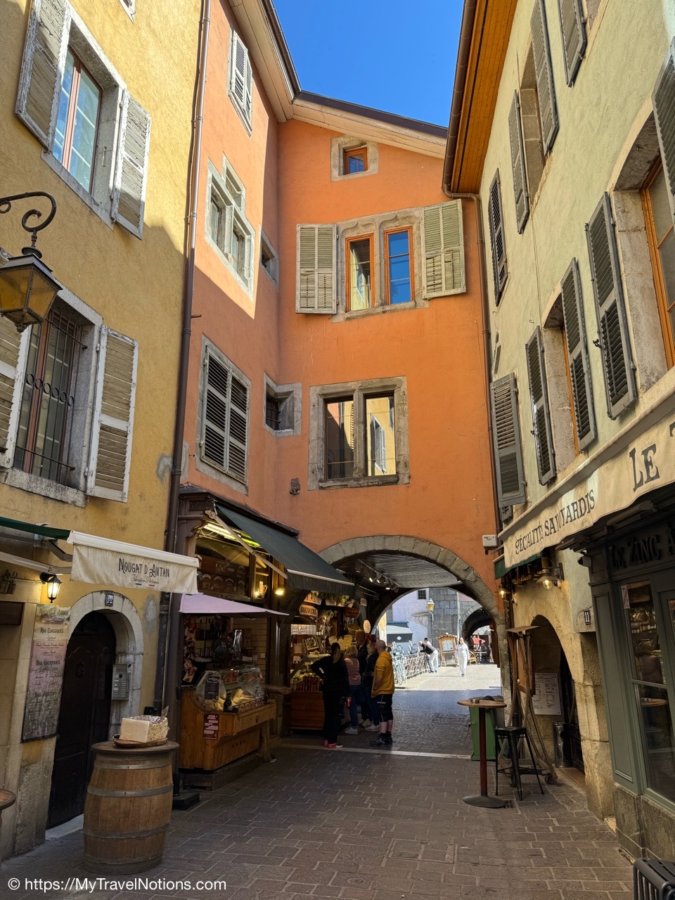 Walking past the archways along Rue Filaterie to our 3rd food walking tour stop in old town Annecy. (May 19, 2025)