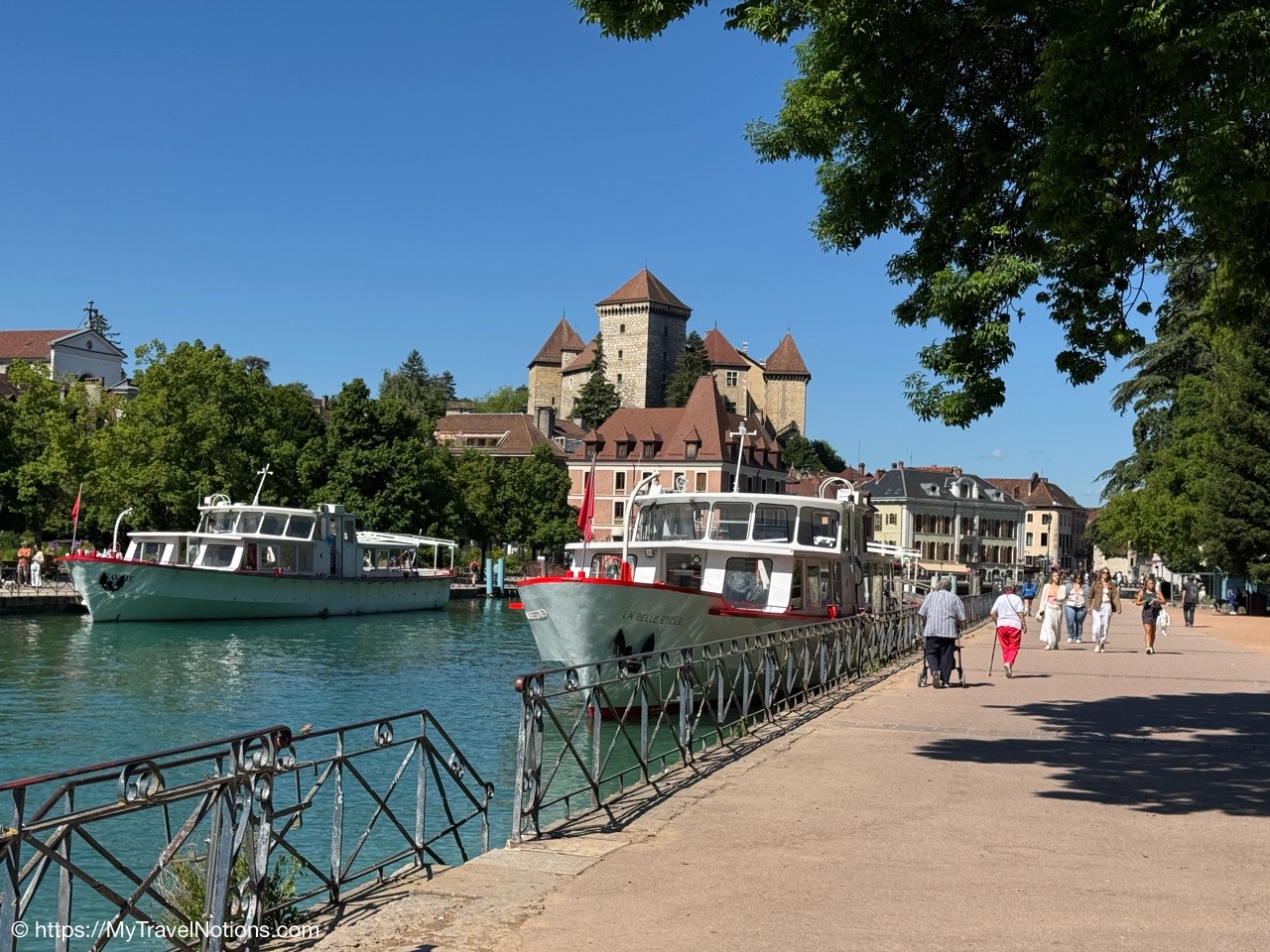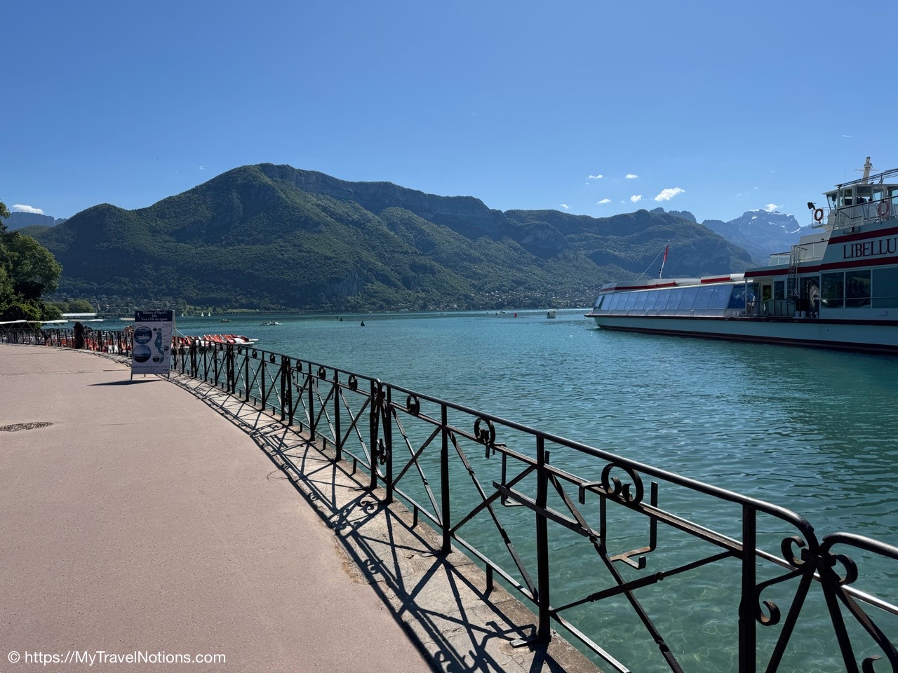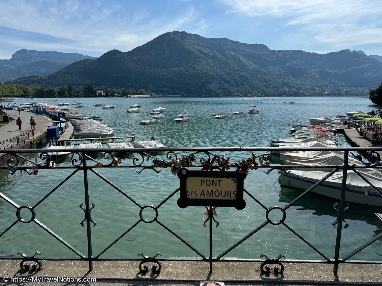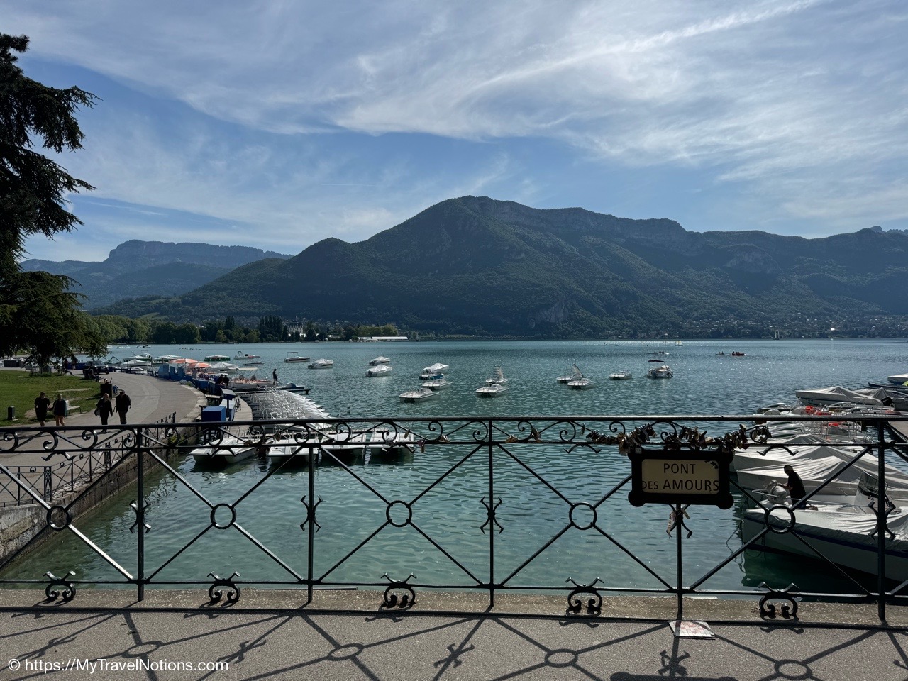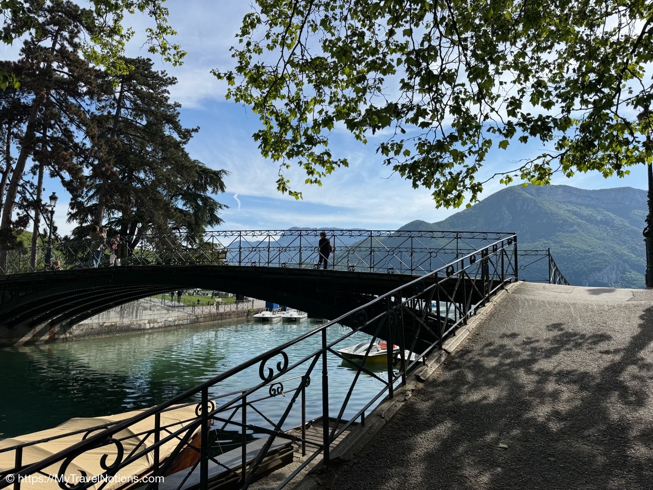 The Pont des Amours or Lovers’ Bridge, a beautiful iron bridge by the Lac d’Annecy, which joins the Jardins de l’Europe and Pâquier Esplanade – two open gardens on the shores of the lake. Legend has it that if two lovers kiss on the bridge, they will stay together forever. You don’t need someone to kiss to enjoy the incredible lake and Mountain View’s. (May 19, 2025)