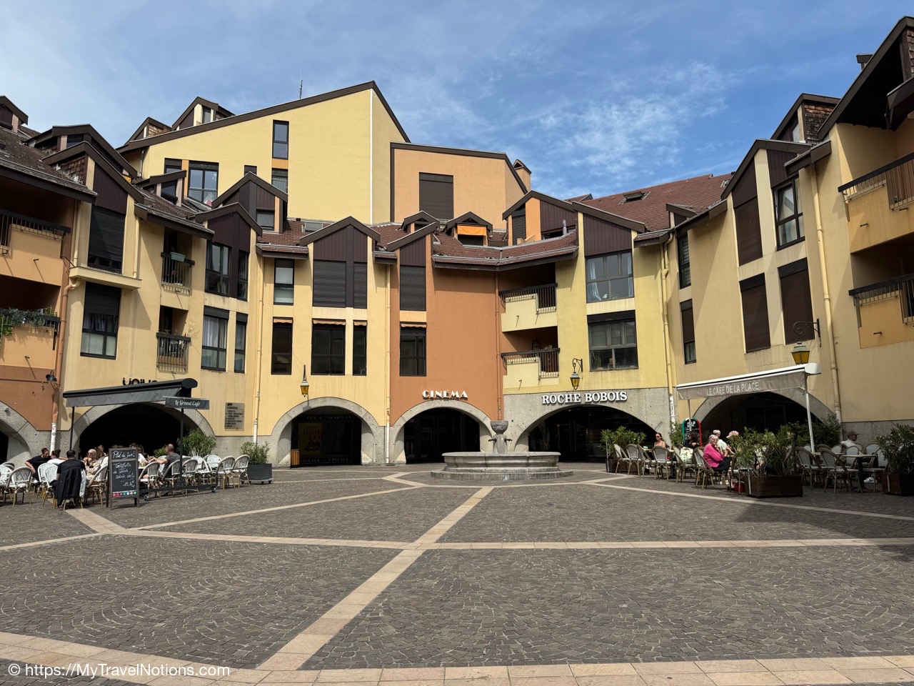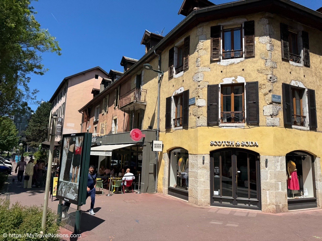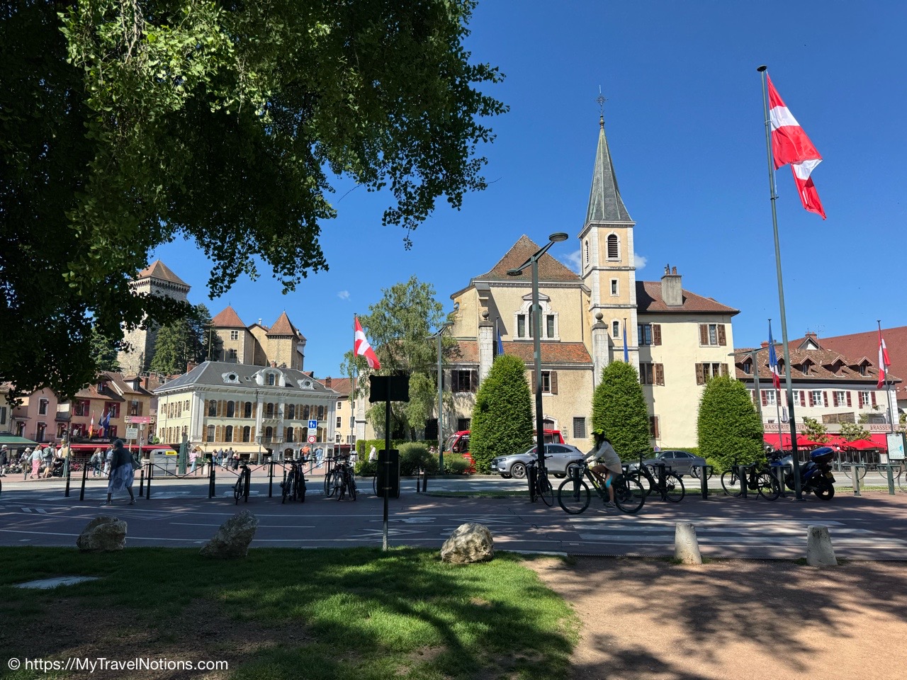 This small square, in the heart of Annecy’s old town, the Place Notre-Dame features the Église Notre Dame de Liesse or Church of Notre Dame de Liesse and to the left is the elegant four-story former Town Hall initially built as a hospital and repurposed for municipal use in 1770. (May 17, 2025)