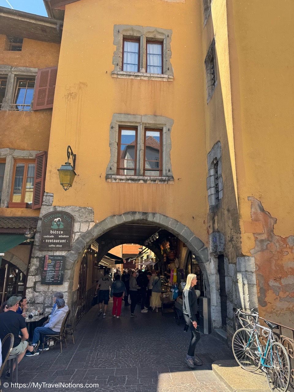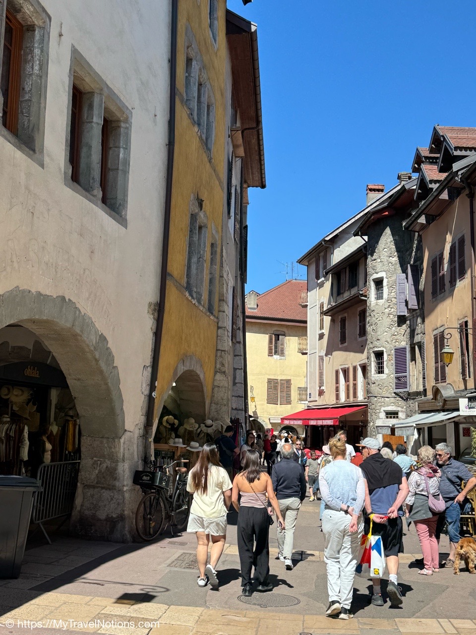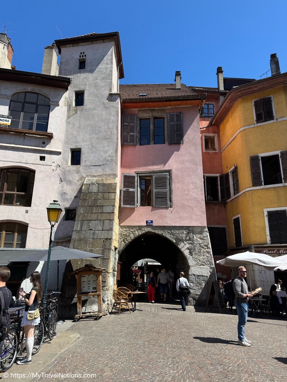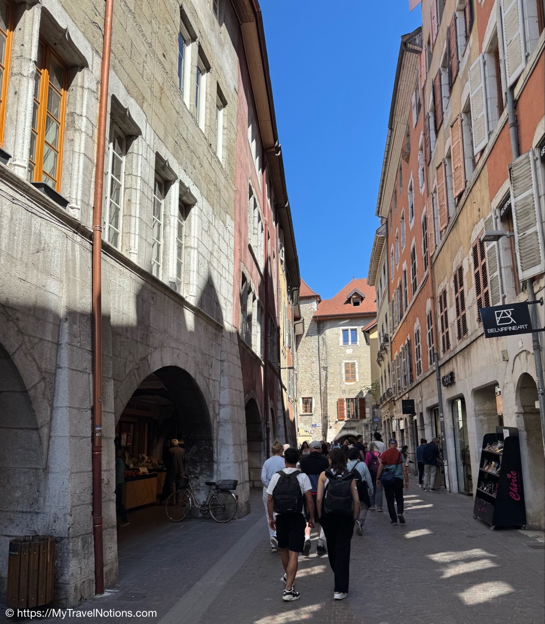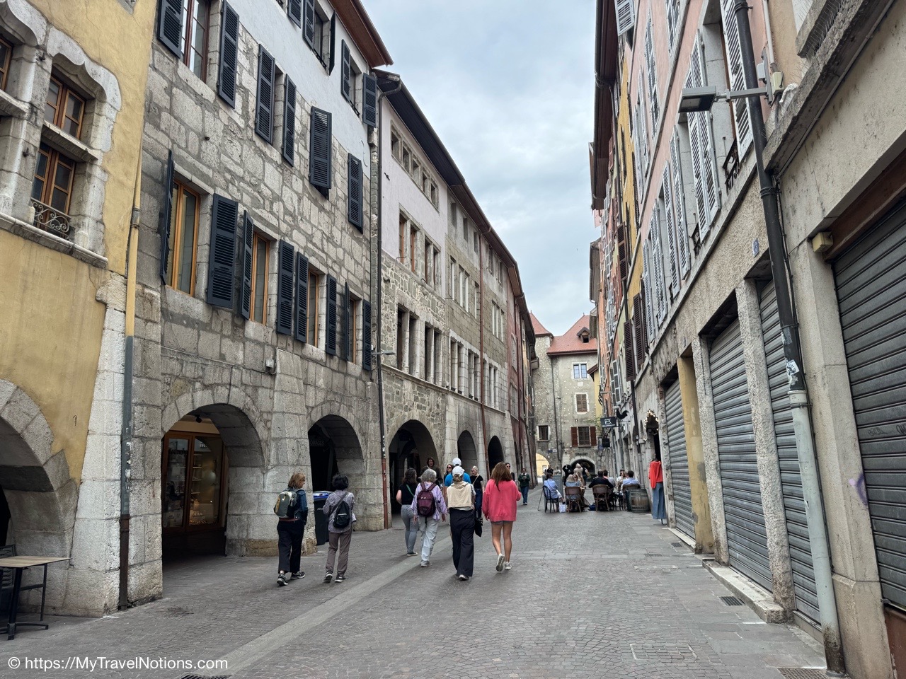 Walking past the archways along Rue Filaterie in old town Annecy. (May 17, 2025)