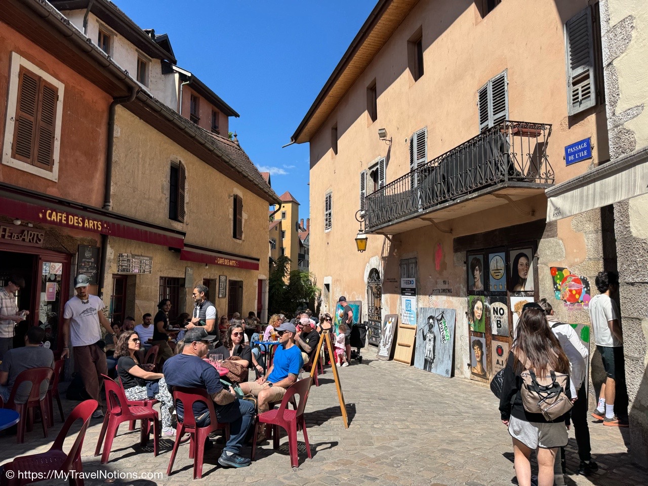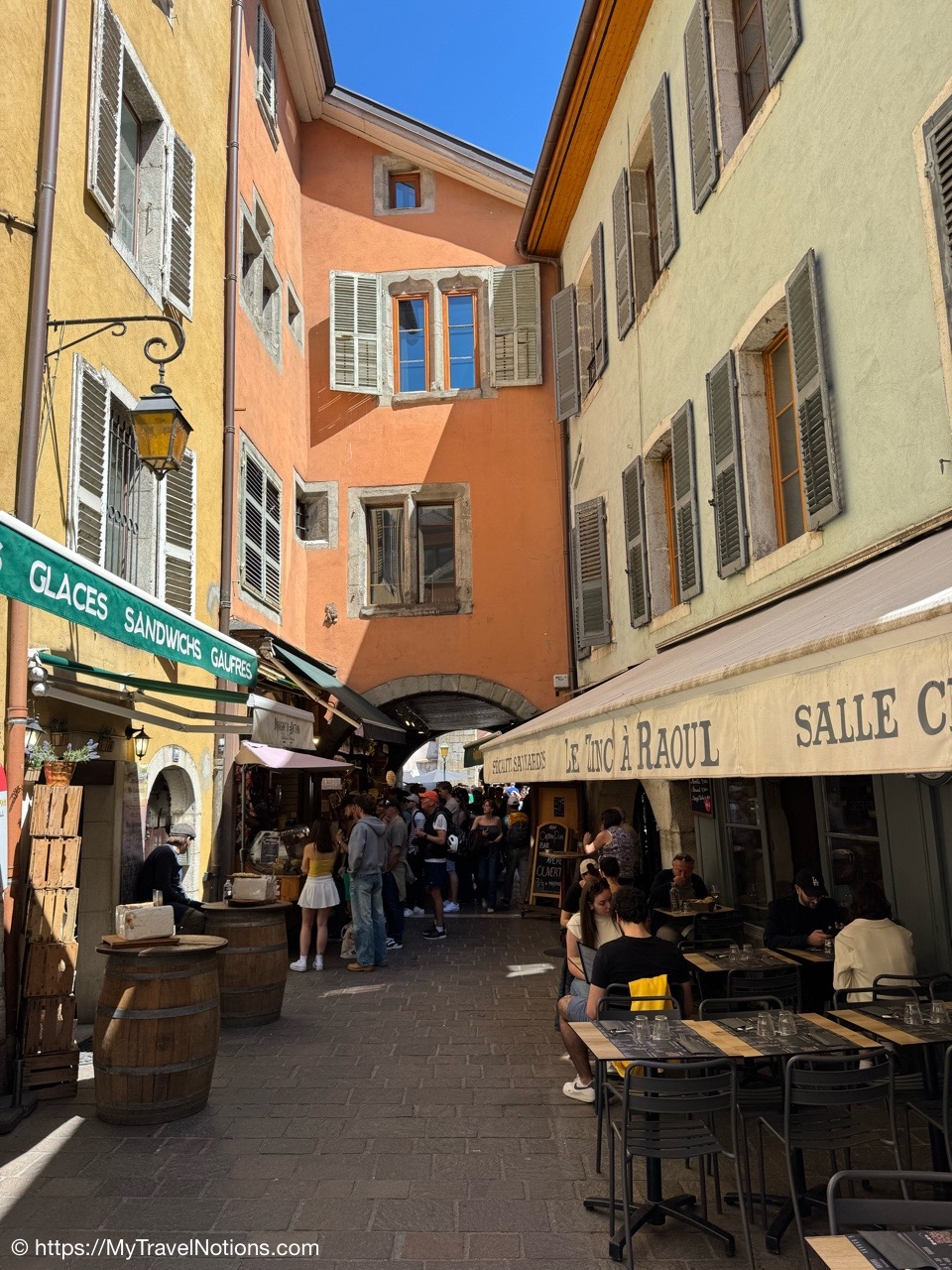 Walking through a passageway onto Rue Perrière in old town Annecy. (May 17, 2025)