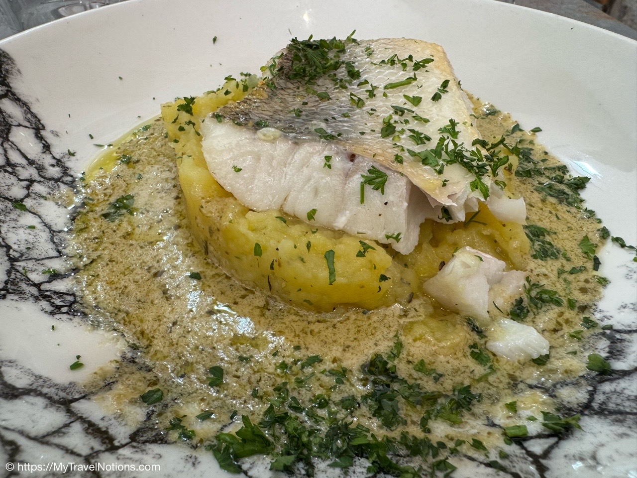 My seafood lunch at Kelsa in old town Annecy was Zander fillet and crushed potatoes with a white butter and wild garlic sauce. It was rich and filling. (May 17, 2025)