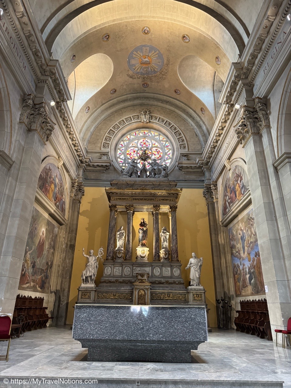 The main altar inside the Église Notre Dame de Liesse or Church of Notre Dame de Liesse in old town Annecy. The impressive main altar dates from 1855. The Duvernay brothers, two master masons from the Giffre valley, were behind the design. (May 17, 2025)