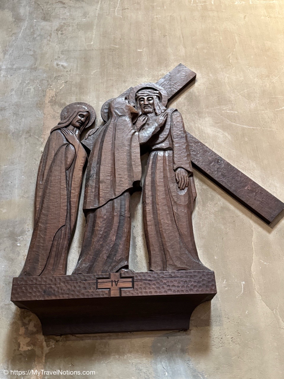 The wood carved stations of the cross inside the Église Notre Dame de Liesse or Church of Notre Dame de Liesse in old town Annecy. The IV or 4th Station of the Cross is where Jesus meets his mother, Mary on his way to be crucified. (May 17, 2025)