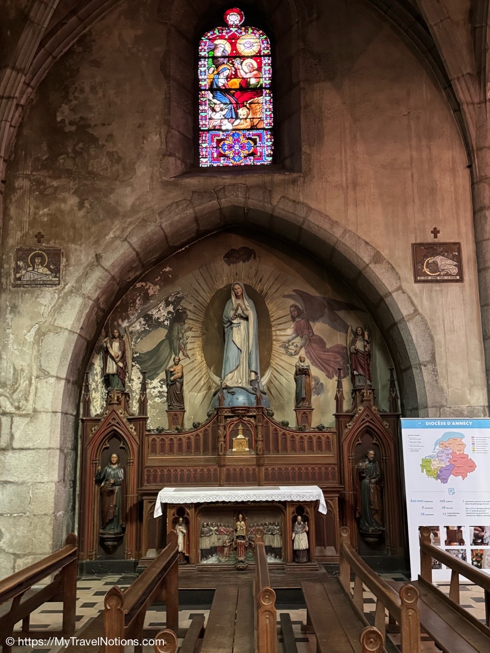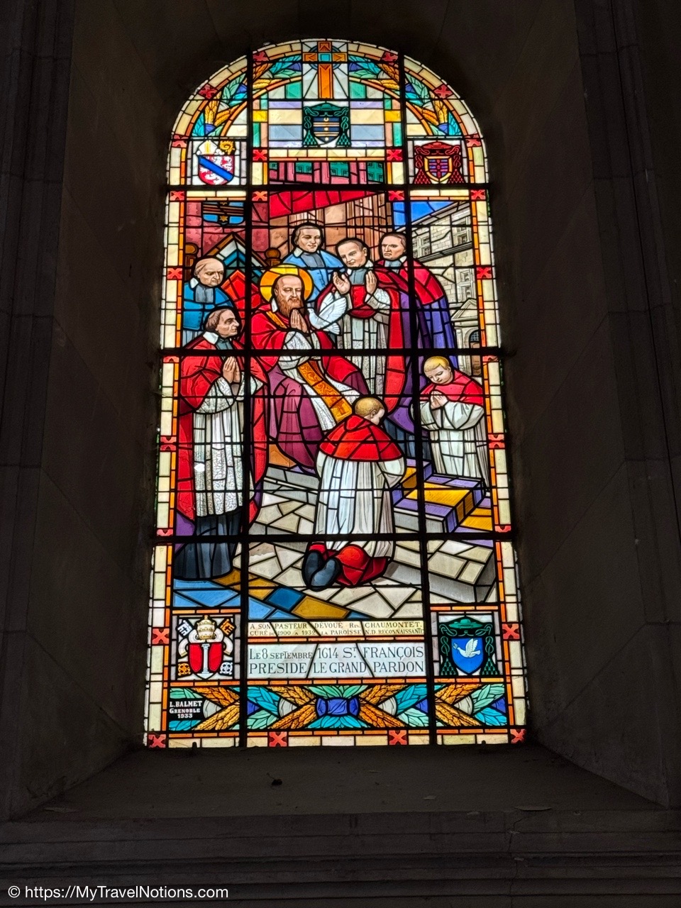 One of several stained glass inside the Église Notre Dame de Liesse or Church of Notre Dame de Liesse in old town Annecy. (May 17, 2025)