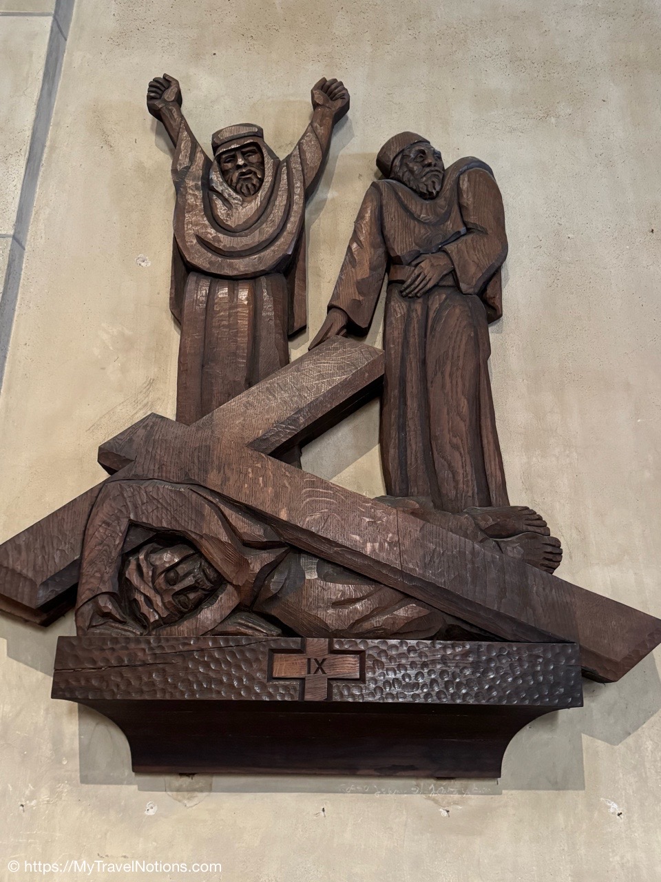 The wood carved stations of the cross inside the Église Notre Dame de Liesse or Church of Notre Dame de Liesse in old town Annecy. The IV or 9th Station of the Cross is when Jesus falls for the 3rd time under the weight of the cross, a moment of profound exhaustion and suffering near the end of his journey to Calvary. (May 17, 2025)