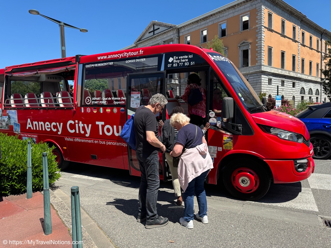 ust a few people lining up at the red convertible bus to take the afternoon Annecy City Tour of the city and lake views along with a stop at the Basilique de la Visitation or Basilica of the Visitation on the hill in Annecy. (May 18, 2025)