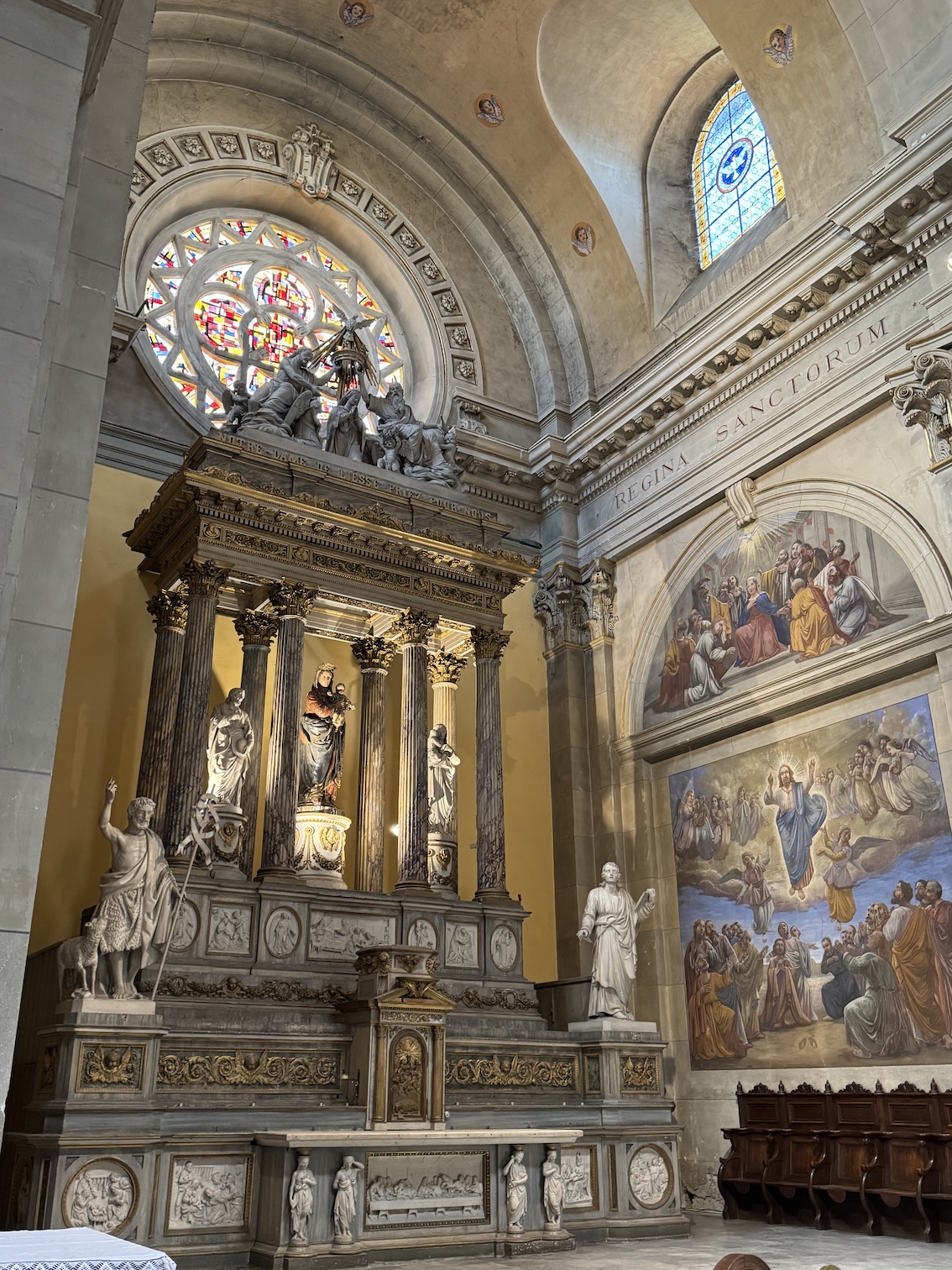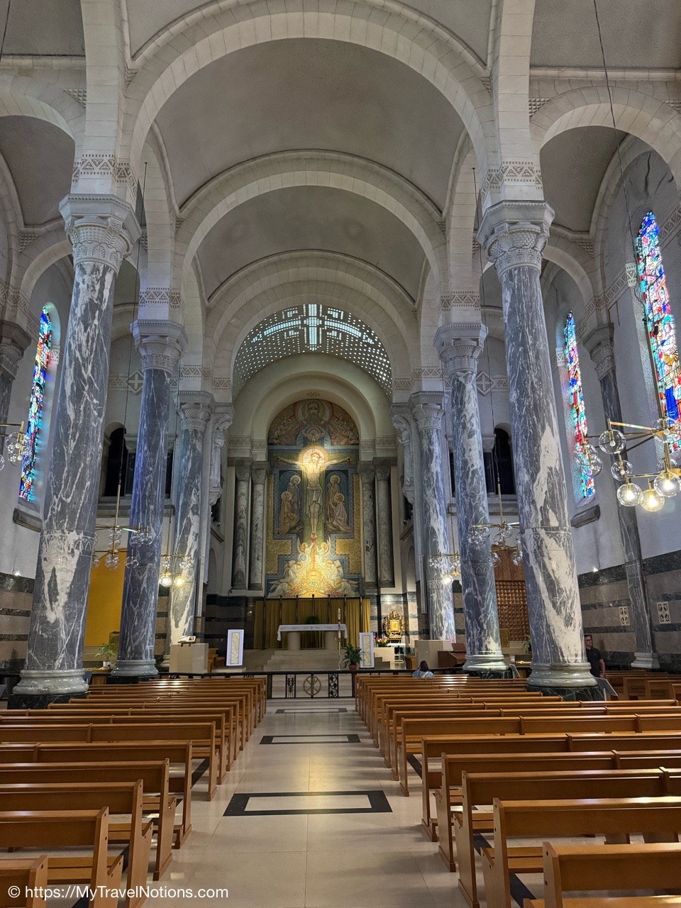Inside the Basilica of the Visitation in Annecy with its blue Savoy marble columns, magnificent mosaic and stained glass windows that tells the stories of the lives of Saint François de Sales and Saint Jane de Chantal, whose gilded bronze sarcophagi are on display. (May 18, 2025)