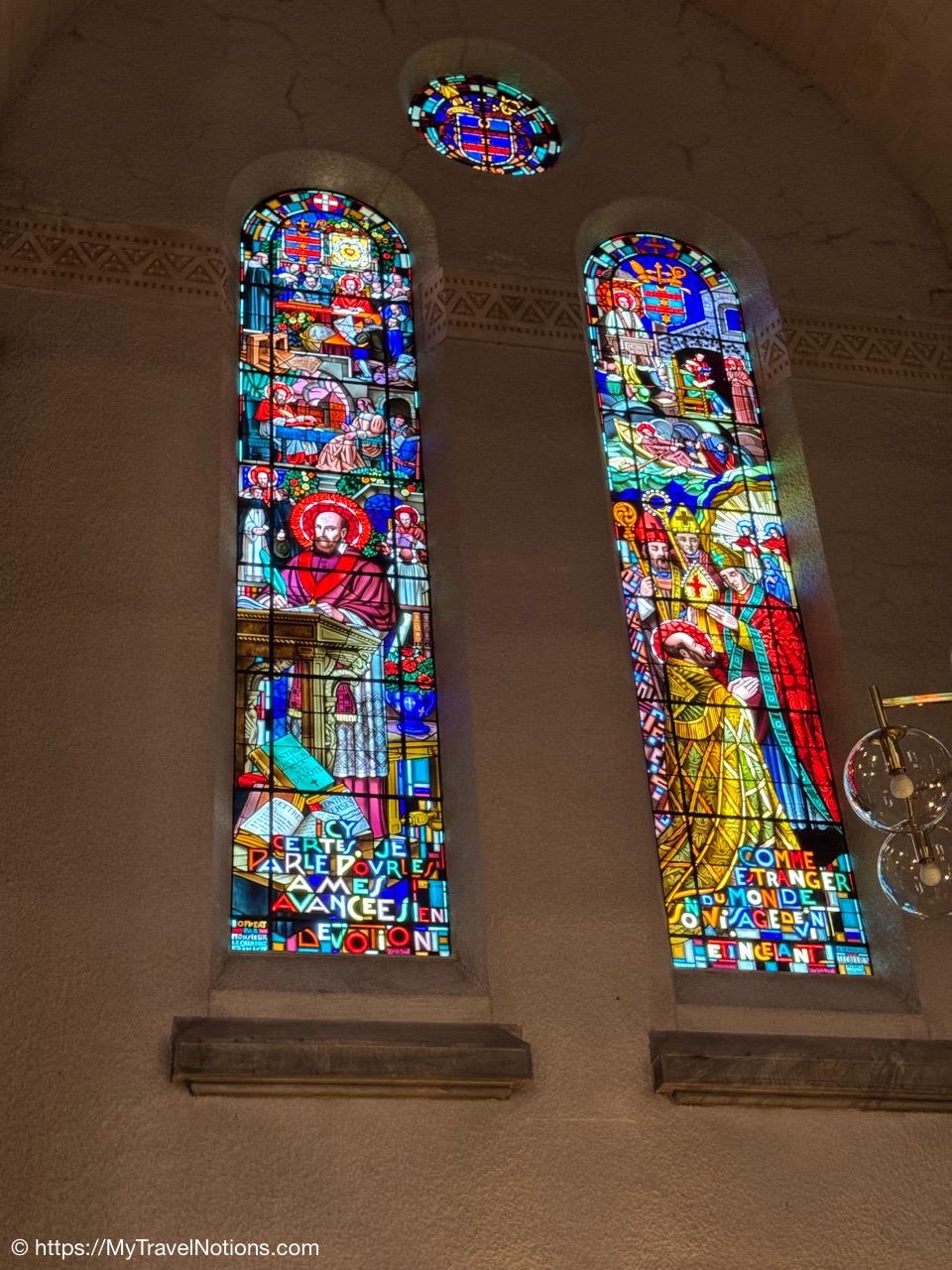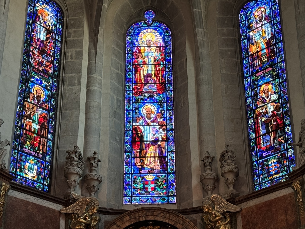 The stained glass windows inside the Basilica of the Visitation in Annecy that tells the stories of the lives of Saint François de Sales and Saint Jane de Chantal, whose gilded bronze sarcophagi are on display. (May 18, 2025)