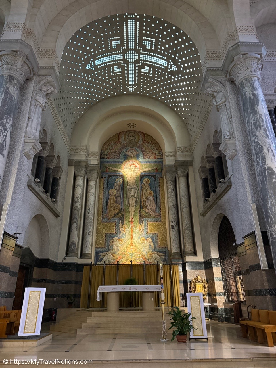 The altar inside the Basilica of the Visitation in Annecy with its blue Savoy marble columns and magnificent mosaic depicting the Holy Trinity and the Crucifixion. (May 18, 2025)