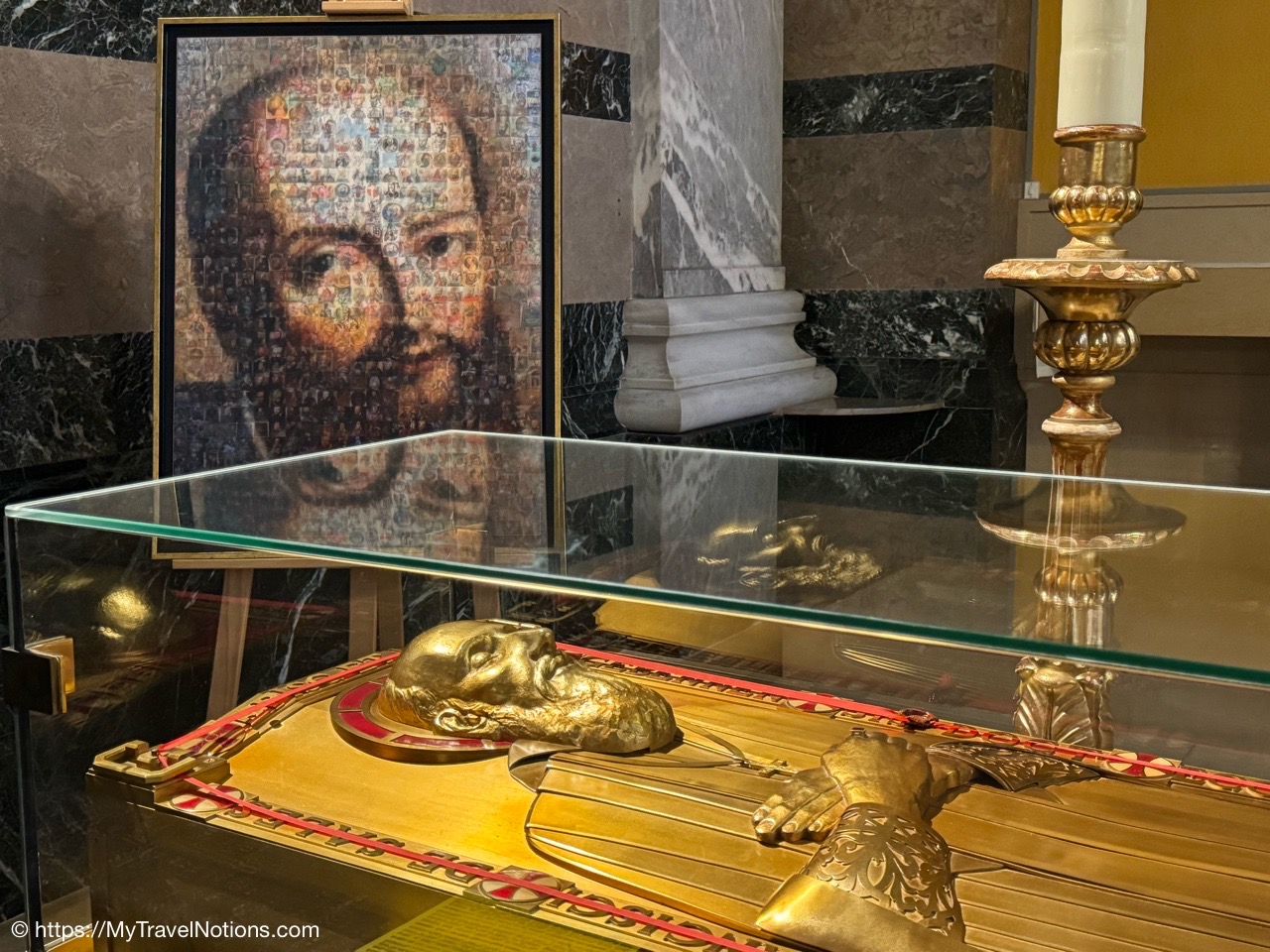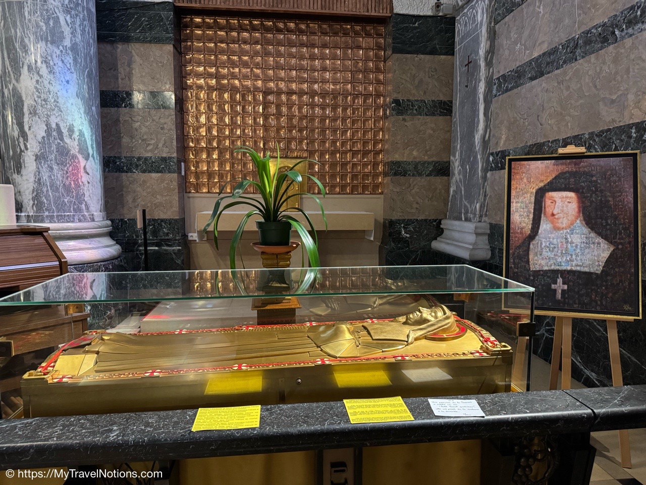The gilded bronze sarcophagi of Saint Jane de Chantal on display near the altar inside the Basilica of the Visitation in Annecy. She founded the Order of the Visitation of Holy Mary in Annecy in 1610, alongside her spiritual director St. Francis de Sales. She was a French noblewoman, wife, and mother who, after being widowed, dedicated her life to serving the poor and founding the new religious order to assist women who were rejected by other orders. (May 18, 2025)