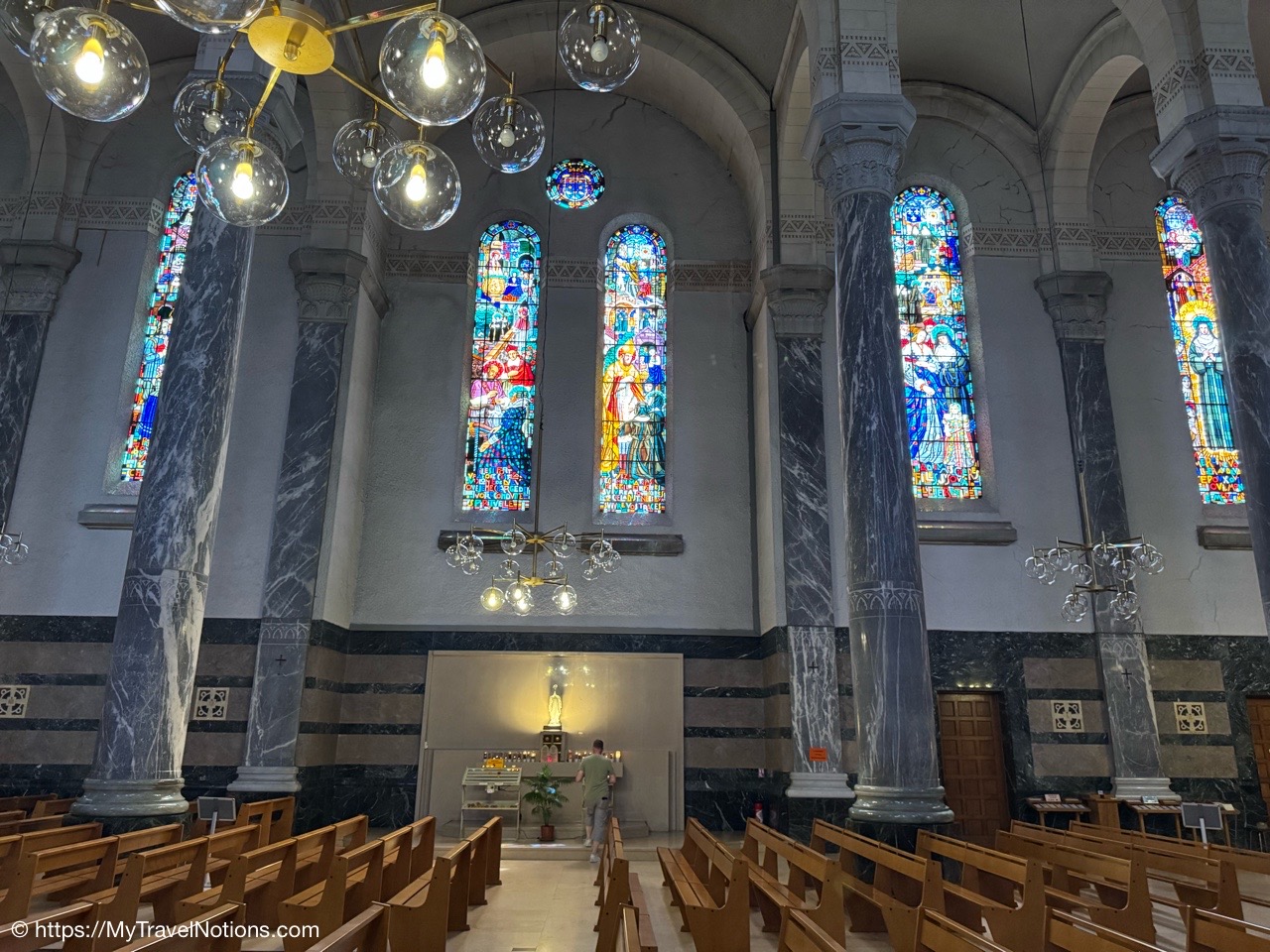 A side view inside the Basilica of the Visitation in Annecy with its blue Savoy marble columns and stained glass windows that tells the stories of the lives of Saint François de Sales and Saint Jane de Chantal, whose gilded bronze sarcophagi are on display. (May 18, 2025)