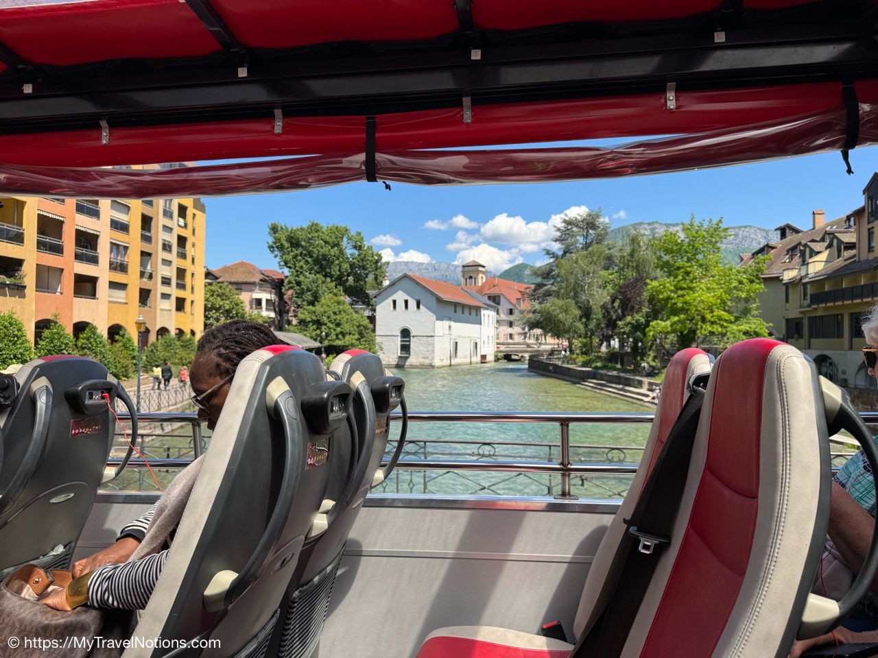 Back on the red Annecy City Tour bus with views of Annecy. (May 18, 2025)