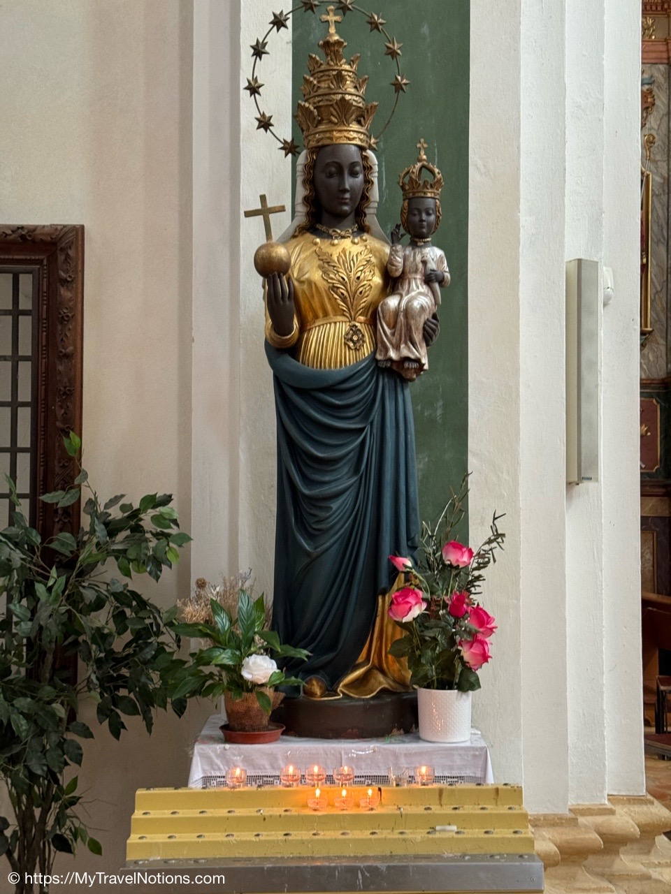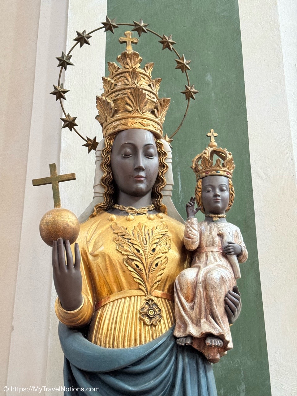 The Black Madonna holding the baby Jesus in one arm and a globe in her other hand inside the Église Saint-François de Sales or Church of St. Francis de Sales in old town Annecy. The statue symbolizes Mary’s authority as the Queen of Heaven and her dominion over the entire universe, acting as the “Mother of the World”. (May 18, 2025)