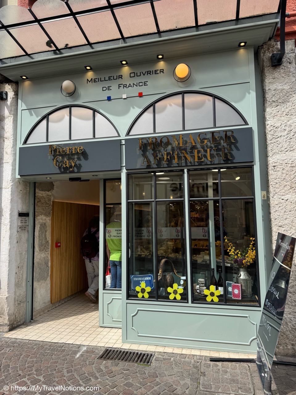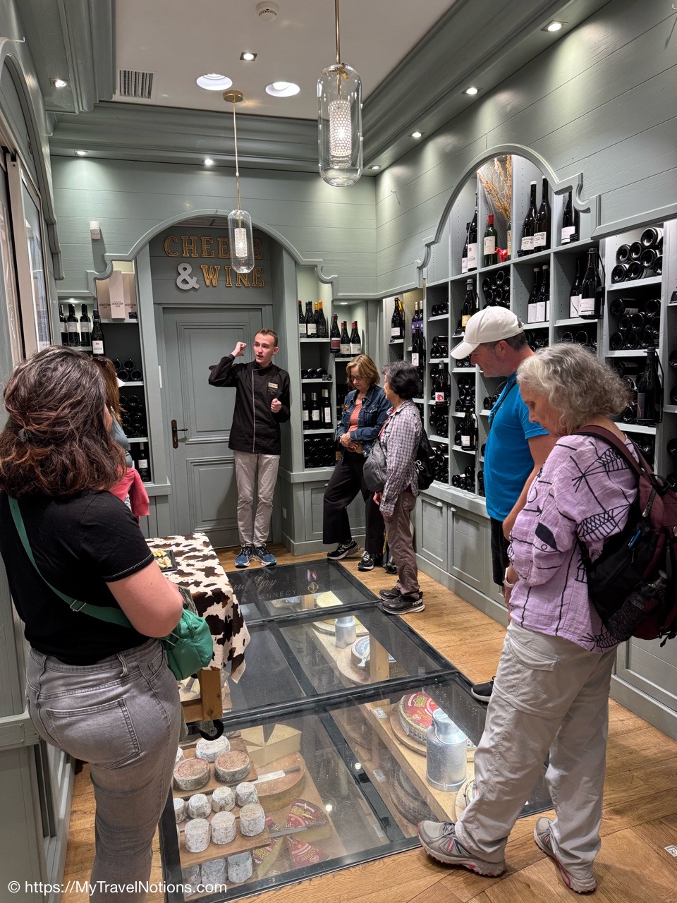 Inside the cheese and wine store of Pierre Gay in Annecy, our 1st food walking tour stop in Annecy. (May 19, 2025)