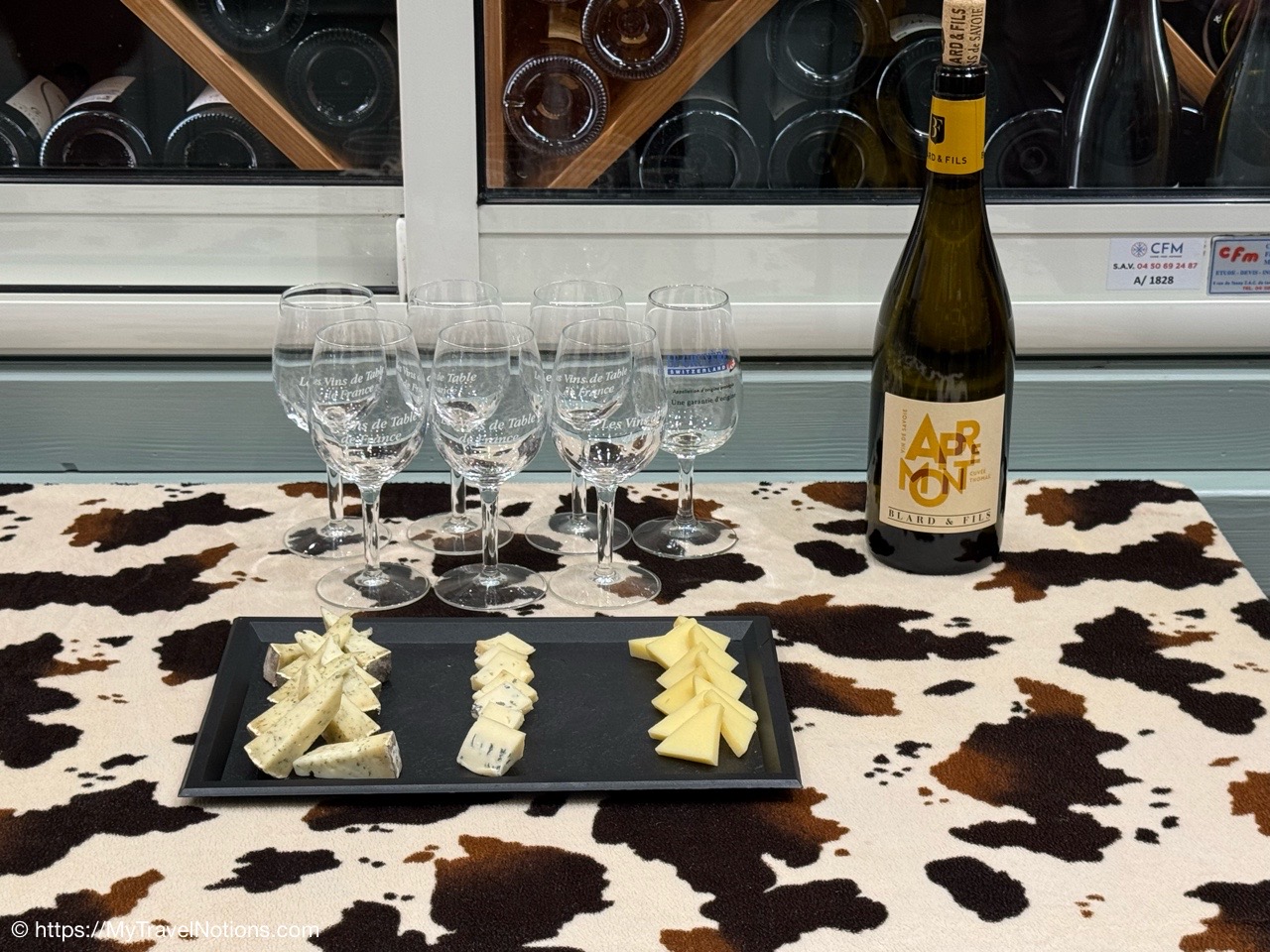 Our cheese and wine tasting lineup at Pierre Gay, the fromager or cheese shop, in Annecy, our 1st food walking tour stop. (May 19, 2025)