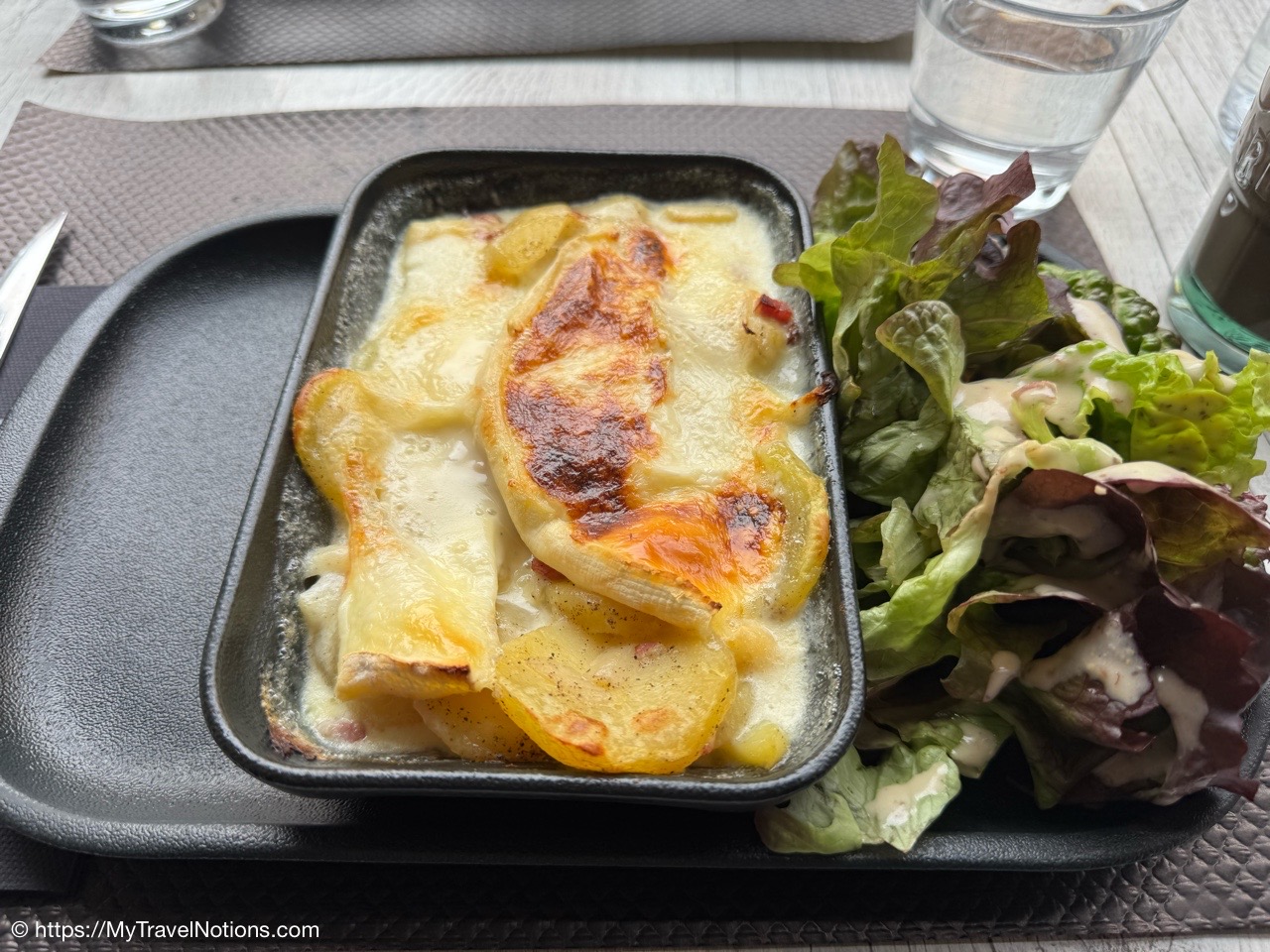 The menu for our 2nd food walking tour stop at the Restaurant Chez Monique in Annecy was this robust, regional dish of France called Tartiflette. It’s made with potatoes, bacon (lardon), onions, and the local Reblochon cheese, baked into a casserole. (May 19, 2025)