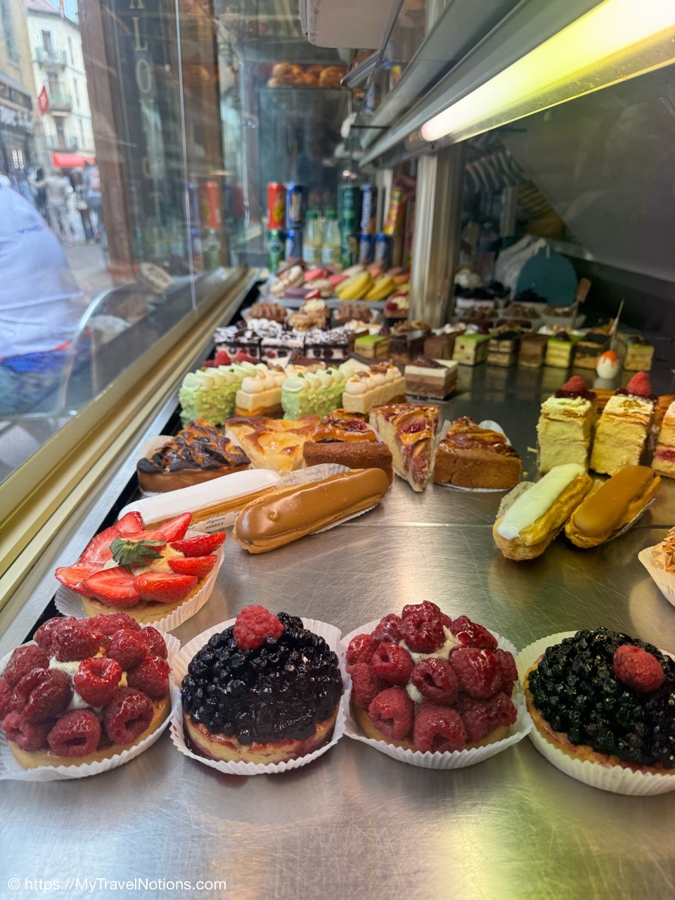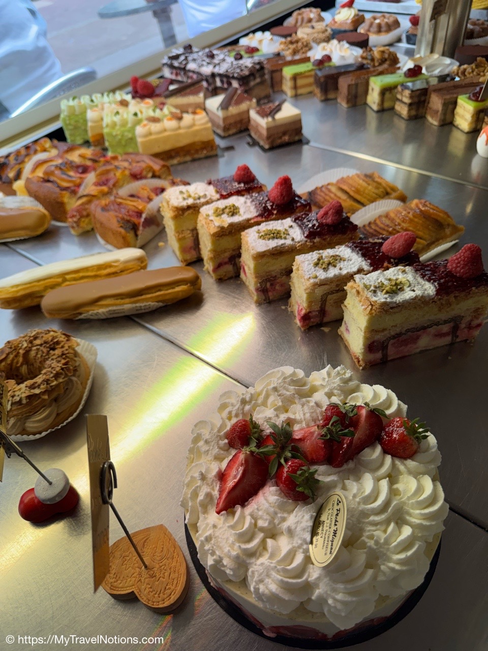 Some of the amazing pastry we got to choose from during our 4th food walking tour stop, the Le Péché Mignon, a quaint little pastry shop in old town Annecy. (May 19, 2025)