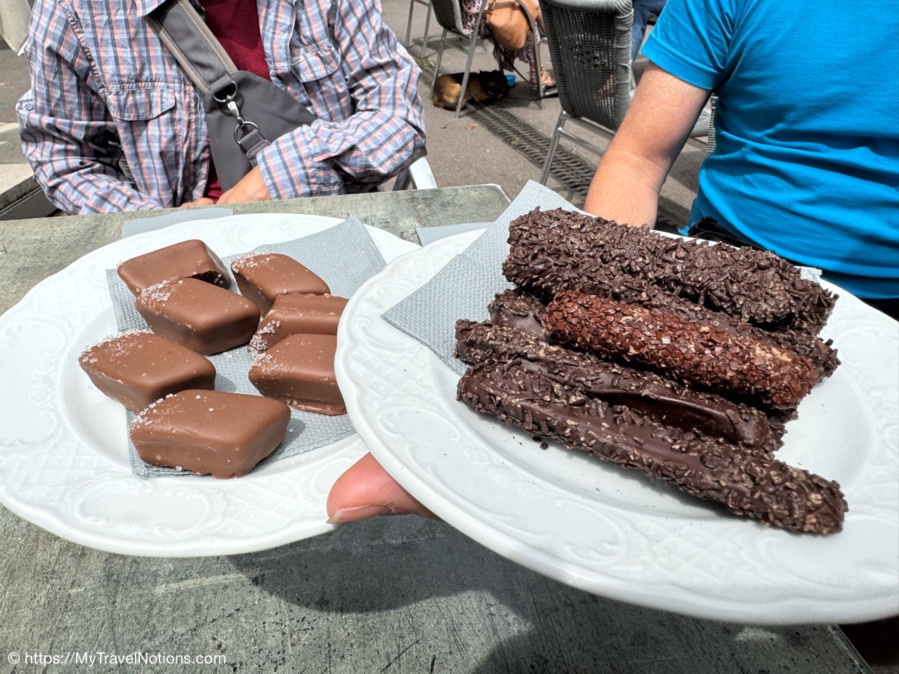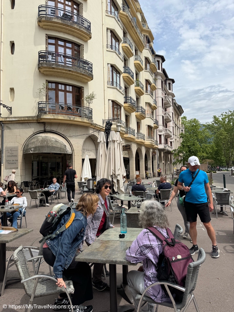 Waiting for our chocolate at the patio area of “Roseaux du Lac” in Annecy, our 5th and final food walking tour stop, where master pastry chef Christophe Aréchavala took over the reins of this local Annecy institution 23 years ago and continues to carry on the tradition of chocolate sticks infused with coffee, created in Annecy in 1924. (May 19, 2025)