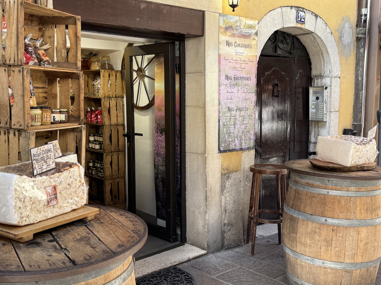 A nougat shop in an archway of old town Annecy. It became one of my favorite sweet things to eat. In France, “nougat” generally refers to the soft, white variety known as Nougat de Montélimar, made from honey, egg whites, almonds, and pistachios. It’s characterized by its smooth, soft, and chewy texture, contrasting with other nougat varieties. (May 17, 2025)