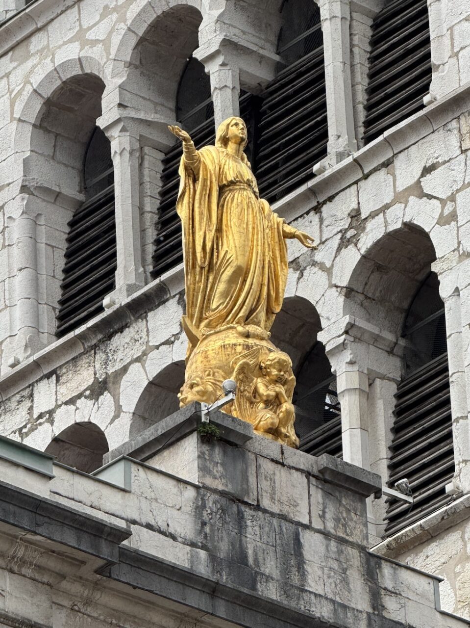 The golden statue of the Virgin Mary standing with open arms on the rooftop of the Église Notre Dame de Liesse or Church of Notre Dame de Liesse in old town Annecy. (May 17, 2025)