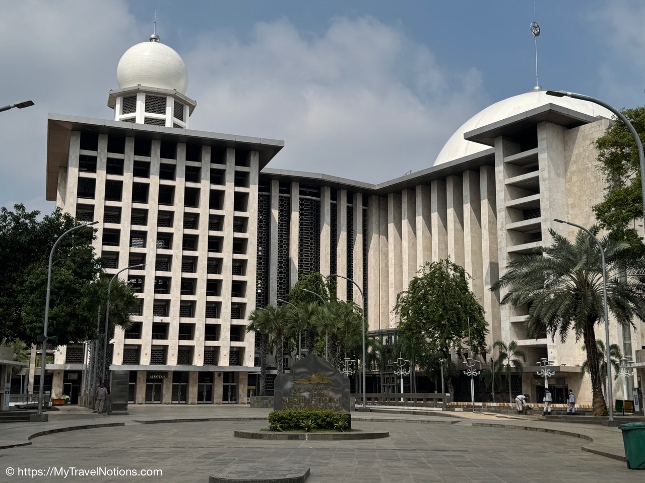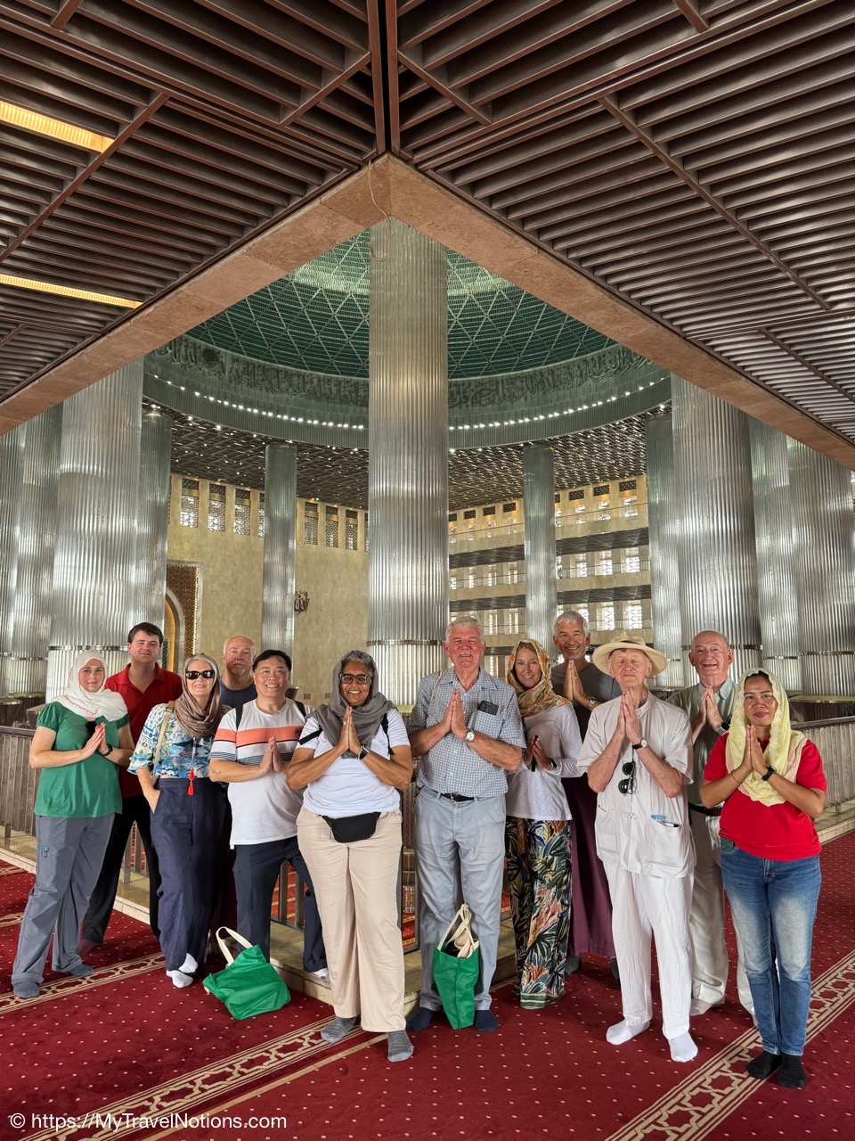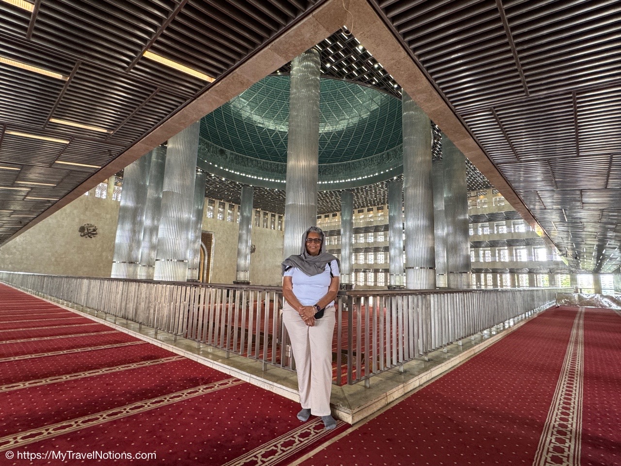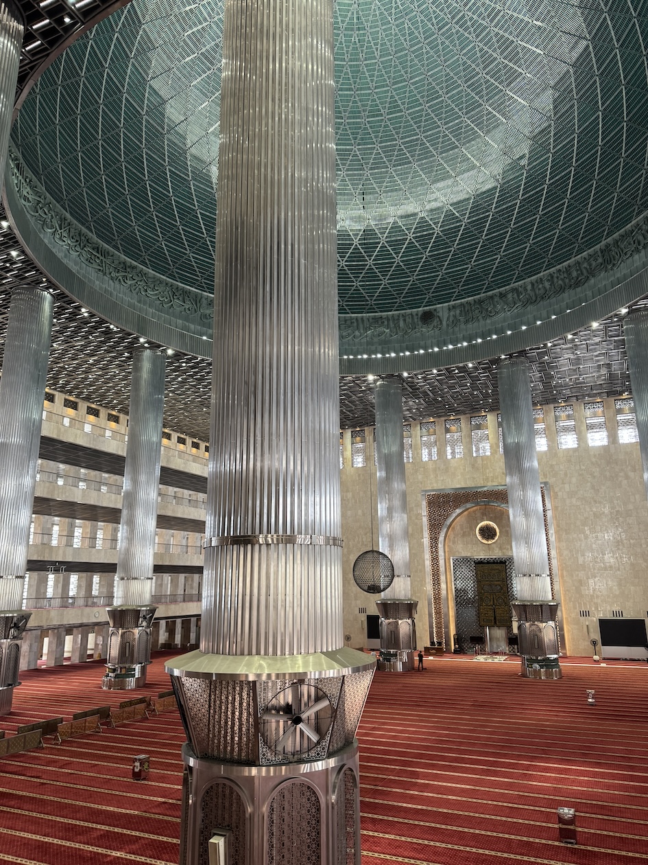 Me inside the Masjid Istiqlal in Jakarta with views of the grand domed prayer hall, supported by 12 concrete columns with stainless steel designs. The concrete mosque was completed in 1978. Its Arabic name “Istiqlal” means “independence”. Located next to the Jakarta Cathedral, the mosque is a national landmark and a significant cultural and architectural treasure, capable of holding about 120,000 worshippers. (Sept. 22, 2025)Views of Jakarta while inside Intrepid’s compact van for a day tour around the sights of Jarkarta where motorcycles are an important form of transportation around the city. (Sept. 22, 2025)We made a quick stop to see the Monas National Monument symbolizing the nation’s struggle for independence and unity was built between 1961 and 1975 to commemorate the long fight against colonial rule. Located in Merdeka Square, it features a golden flame at its apex and houses a historical museum and observation deck offering panoramic city views. (sept. 22, 2025)The ceremonial cavalry unit of the Indonesian Presidential Security Force (Paspampres) performing their duties during a state event at the Istana Merdeka Merdeka or Merdeka Palace in Jakarta. Indonesia has a presidential system where the president is both the head of state and head of government, directly elected by the people for a maximum of two five-year terms. (Sept. 22, 2025)The Masjid Istiqlal in Jakarta, which oddly enough looks like the exterior of a concrete office building with open-looking spaces for ventilation, is a modern, minimalist style mosque with clean lines, contrasting with traditional mosque designs. (Sept. 22, 2025)Inside the grand domed prayer hall, supported by 12 concrete columns with stainless interior, of the Masjid Istiqlal in Jakarta. Designed by Christian architect Frederich Silaban and built between 1961-1978, the mosque symbolizes unity with its grand scale, able to hold about 120,000 people. (Sept. 22, 2025)Inside the grand domed prayer hall, supported by 12 concrete columns with stainless interior, of the Masjid Istiqlal in Jakarta. Designed by Christian architect Frederich Silaban and built between 1961-1978, the mosque symbolizes unity with its grand scale, able to hold about 120,000 people. (Sept. 22, 2025)Inside the grand domed prayer hall, supported by 12 concrete columns with stainless interior, of the Masjid Istiqlal in Jakarta. Designed by Christian architect Frederich Silaban and built between 1961-1978, the mosque symbolizes unity with its grand scale, able to hold about 120,000 people. (Sept. 22, 2025)A close-up of the Mihrab inside the grand domed prayer hall of the Masjid Istiqlal in Jakarta. (Sept. 22, 2025)Inside the grand domed prayer hall, supported by 12 concrete columns with stainless interior, of the Masjid Istiqlal in Jakarta. Designed by Christian architect Frederich Silaban and built between 1961-1978, the mosque symbolizes unity with its grand scale, able to hold about 120,000 people. (Sept. 22, 2025)The large concrete columns with stainless designed inside the grand domed prayer hall of the Masjid Istiqlal in Jakarta. (Sept. 22, 2025)My Intrepid Tour group and myself inside the Masjid Istiqlal in Jakarta. From left: Victoria, Alex, Nicole, Clive, Glen, me, Bill, Frances, Rob, Mike, David and our Intrepid Travel tour group leader, Sherly. (Sept. 22, 2025)Me inside the Masjid Istiqlal in Jakarta. (Sept. 22, 2025)Views of the Masjid Istiqlal in Jakarta from inside the courtyard. (Sept. 22, 2025)The Jakarta Cathedral, officially the Cathedral of Our Lady of the Assumption just across from the and the Masjid Istiqlal, or Istiqlal Mosque in Jakarta. The close proximity showcases religious harmony, a key tenet of the Muslim-majority country’s national identity. A tunnel connecting the Cathedral and the Mosque was constructed between 2020 and 2021. (Sept. 22, 2025)The Jakarta Cathedral, officially the Cathedral of Our Lady of the Assumption, was built between 1891 and 1901. The spirals (spires) on top of Jakarta Cathedral are neo-Gothic iron structures representing religious symbolism. (Sept. 22, 2025)The main entrance of the Church of Our Lady of the Assumption or the Jakarta Cathedral was consecrated in 1901 and built between 1891 and 1901 in the Neo-Gothic style. The spirals (spires) on top of Jakarta Cathedral are neo-Gothic iron structures representing religious symbolism. (Sept. 22, 2025)Inside the Jakarta Cathedral, officially the Cathedral of Our Lady of the Assumption, in Jakarta, Indonesia. (Sept. 22, 2025)The Altar inside the Jakarta Cathedral, officially the Cathedral of Our Lady of the Assumption. (Sept. 22, 2025)Inside the Jakarta Cathedral, officially the Cathedral of Our Lady of the Assumption. (Sept. 22, 2025)Inside the Jakarta Cathedral, officially the Cathedral of Our Lady of the Assumption. (Sept. 22, 2025)Inside the Jakarta Cathedral, officially the Cathedral of Our Lady of the Assumption. (Sept. 22, 2025)The Stations of the Cross in the Jakarta Cathedral are depicted through a series of paintings arranged around the interior walls. This is number V, Simon of Cyrene helps Jesus carry the Cross. (Sept. 22, 2025)The Stations of the Cross in the Jakarta Cathedral are depicted through a series of paintings arranged around the interior walls. This is number X, Jesus is stripped of His garments. (Sept. 22, 2025)The Pietà inside the Jakarta Cathedral. (Sept. 22, 2025)The “Homeless Jesus” sculpture by Canadian sculptor Timothy Paul Schmalz outside a side entrance into the Jakarta Cathedral in Jakarta. The sculpture shoes Jesus sleeping on this concrete slab covered by a blanket, with only the stigmata (nail wounds) on his feet visible. The translated inscription reads: WHAT DID YOU DO WHEN I WAS SICK, HOMELESS, HUNGRY AND THIRSTY, HAD NO CLOTHES, AND WAS IN PRISON…? That powerful question comes from the Gospel of Matthew 25:35-46, specifically Jesus’s teaching on the Final Judgment, where He says serving the needy (hungry, thirsty, str