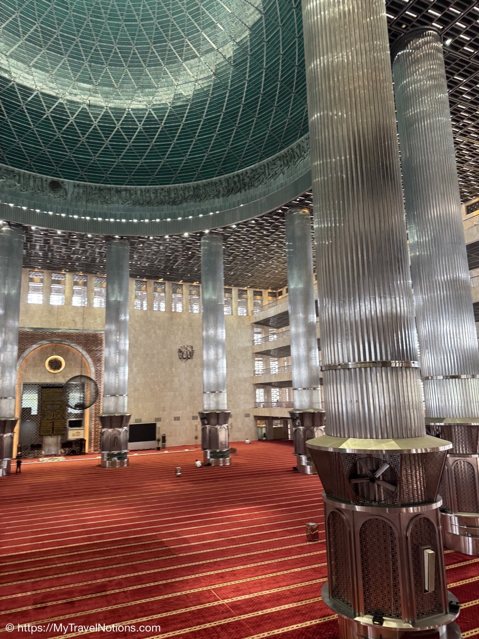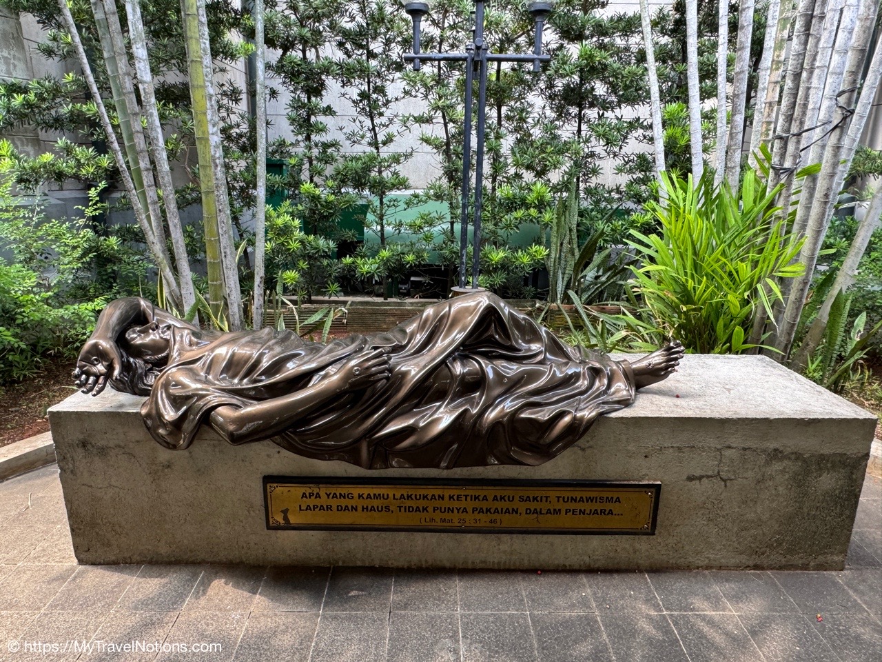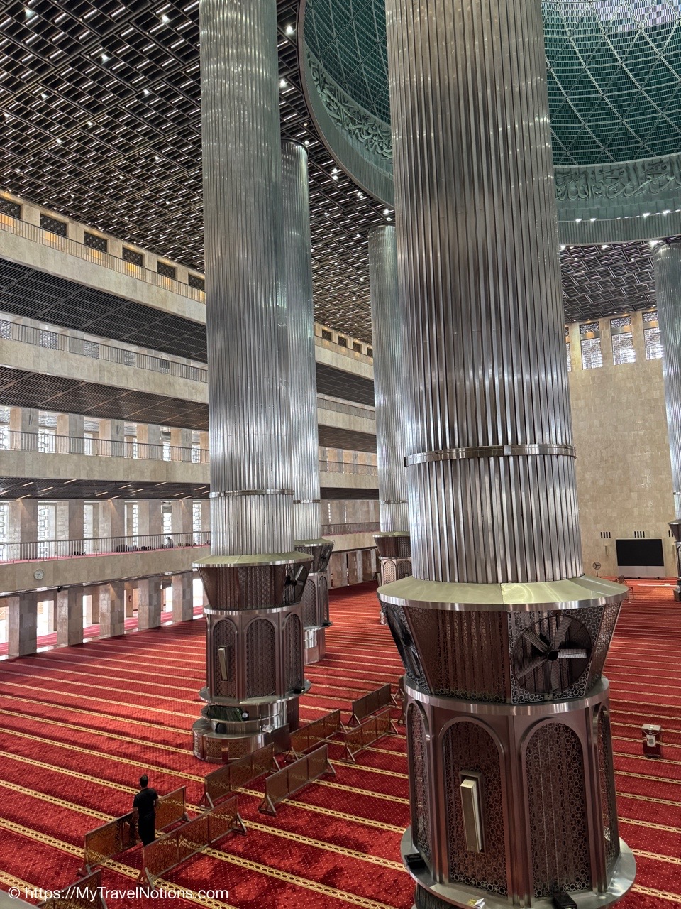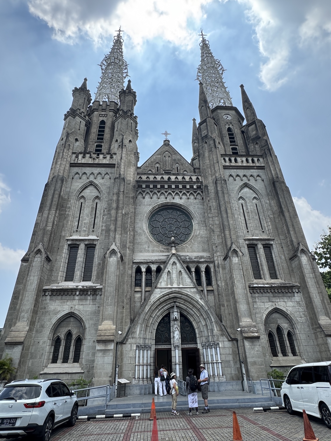 Me inside the Masjid Istiqlal in Jakarta with views of the grand domed prayer hall, supported by 12 concrete columns with stainless steel designs. The concrete mosque was completed in 1978. Its Arabic name “Istiqlal” means “independence”. Located next to the Jakarta Cathedral, the mosque is a national landmark and a significant cultural and architectural treasure, capable of holding about 120,000 worshippers. (Sept. 22, 2025)Views of Jakarta while inside Intrepid’s compact van for a day tour around the sights of Jarkarta where motorcycles are an important form of transportation around the city. (Sept. 22, 2025)We made a quick stop to see the Monas National Monument symbolizing the nation’s struggle for independence and unity was built between 1961 and 1975 to commemorate the long fight against colonial rule. Located in Merdeka Square, it features a golden flame at its apex and houses a historical museum and observation deck offering panoramic city views. (sept. 22, 2025)The ceremonial cavalry unit of the Indonesian Presidential Security Force (Paspampres) performing their duties during a state event at the Istana Merdeka Merdeka or Merdeka Palace in Jakarta. Indonesia has a presidential system where the president is both the head of state and head of government, directly elected by the people for a maximum of two five-year terms. (Sept. 22, 2025)The Masjid Istiqlal in Jakarta, which oddly enough looks like the exterior of a concrete office building with open-looking spaces for ventilation, is a modern, minimalist style mosque with clean lines, contrasting with traditional mosque designs. (Sept. 22, 2025)Inside the grand domed prayer hall, supported by 12 concrete columns with stainless interior, of the Masjid Istiqlal in Jakarta. Designed by Christian architect Frederich Silaban and built between 1961-1978, the mosque symbolizes unity with its grand scale, able to hold about 120,000 people. (Sept. 22, 2025)Inside the grand domed prayer hall, supported by 12 concrete columns with stainless interior, of the Masjid Istiqlal in Jakarta. Designed by Christian architect Frederich Silaban and built between 1961-1978, the mosque symbolizes unity with its grand scale, able to hold about 120,000 people. (Sept. 22, 2025)Inside the grand domed prayer hall, supported by 12 concrete columns with stainless interior, of the Masjid Istiqlal in Jakarta. Designed by Christian architect Frederich Silaban and built between 1961-1978, the mosque symbolizes unity with its grand scale, able to hold about 120,000 people. (Sept. 22, 2025)A close-up of the Mihrab inside the grand domed prayer hall of the Masjid Istiqlal in Jakarta. (Sept. 22, 2025)Inside the grand domed prayer hall, supported by 12 concrete columns with stainless interior, of the Masjid Istiqlal in Jakarta. Designed by Christian architect Frederich Silaban and built between 1961-1978, the mosque symbolizes unity with its grand scale, able to hold about 120,000 people. (Sept. 22, 2025)The large concrete columns with stainless designed inside the grand domed prayer hall of the Masjid Istiqlal in Jakarta. (Sept. 22, 2025)My Intrepid Tour group and myself inside the Masjid Istiqlal in Jakarta. From left: Victoria, Alex, Nicole, Clive, Glen, me, Bill, Frances, Rob, Mike, David and our Intrepid Travel tour group leader, Sherly. (Sept. 22, 2025)Me inside the Masjid Istiqlal in Jakarta. (Sept. 22, 2025)Views of the Masjid Istiqlal in Jakarta from inside the courtyard. (Sept. 22, 2025)The Jakarta Cathedral, officially the Cathedral of Our Lady of the Assumption just across from the and the Masjid Istiqlal, or Istiqlal Mosque in Jakarta. The close proximity showcases religious harmony, a key tenet of the Muslim-majority country’s national identity. A tunnel connecting the Cathedral and the Mosque was constructed between 2020 and 2021. (Sept. 22, 2025)The Jakarta Cathedral, officially the Cathedral of Our Lady of the Assumption, was built between 1891 and 1901. The spirals (spires) on top of Jakarta Cathedral are neo-Gothic iron structures representing religious symbolism. (Sept. 22, 2025)The main entrance of the Church of Our Lady of the Assumption or the Jakarta Cathedral was consecrated in 1901 and built between 1891 and 1901 in the Neo-Gothic style. The spirals (spires) on top of Jakarta Cathedral are neo-Gothic iron structures representing religious symbolism. (Sept. 22, 2025)Inside the Jakarta Cathedral, officially the Cathedral of Our Lady of the Assumption, in Jakarta, Indonesia. (Sept. 22, 2025)The Altar inside the Jakarta Cathedral, officially the Cathedral of Our Lady of the Assumption. (Sept. 22, 2025)Inside the Jakarta Cathedral, officially the Cathedral of Our Lady of the Assumption. (Sept. 22, 2025)Inside the Jakarta Cathedral, officially the Cathedral of Our Lady of the Assumption. (Sept. 22, 2025)Inside the Jakarta Cathedral, officially the Cathedral of Our Lady of the Assumption. (Sept. 22, 2025)The Stations of the Cross in the Jakarta Cathedral are depicted through a series of paintings arranged around the interior walls. This is number V, Simon of Cyrene helps Jesus carry the Cross. (Sept. 22, 2025)The Stations of the Cross in the Jakarta Cathedral are depicted through a series of paintings arranged around the interior walls. This is number X, Jesus is stripped of His garments. (Sept. 22, 2025)The Pietà inside the Jakarta Cathedral. (Sept. 22, 2025)The “Homeless Jesus” sculpture by Canadian sculptor Timothy Paul Schmalz outside a side entrance into the Jakarta Cathedral in Jakarta. The sculpture shoes Jesus sleeping on this concrete slab covered by a blanket, with only the stigmata (nail wounds) on his feet visible. The translated inscription reads: WHAT DID YOU DO WHEN I WAS SICK, HOMELESS, HUNGRY AND THIRSTY, HAD NO CLOTHES, AND WAS IN PRISON…? That powerful question comes from the Gospel of Matthew 25:35-46, specifically Jesus’s teaching on the Final Judgment, where He says serving the needy (hungry, thirsty, str