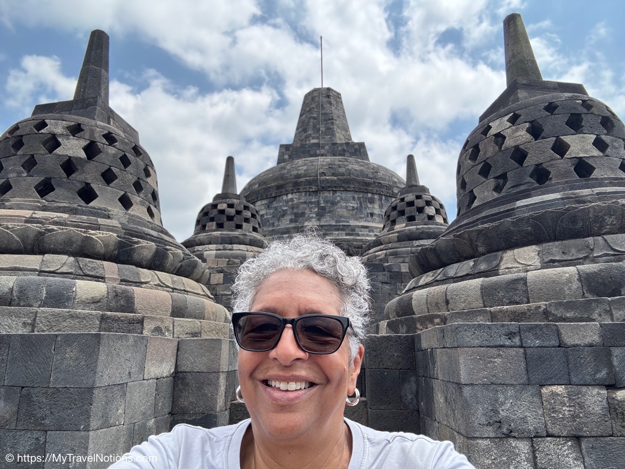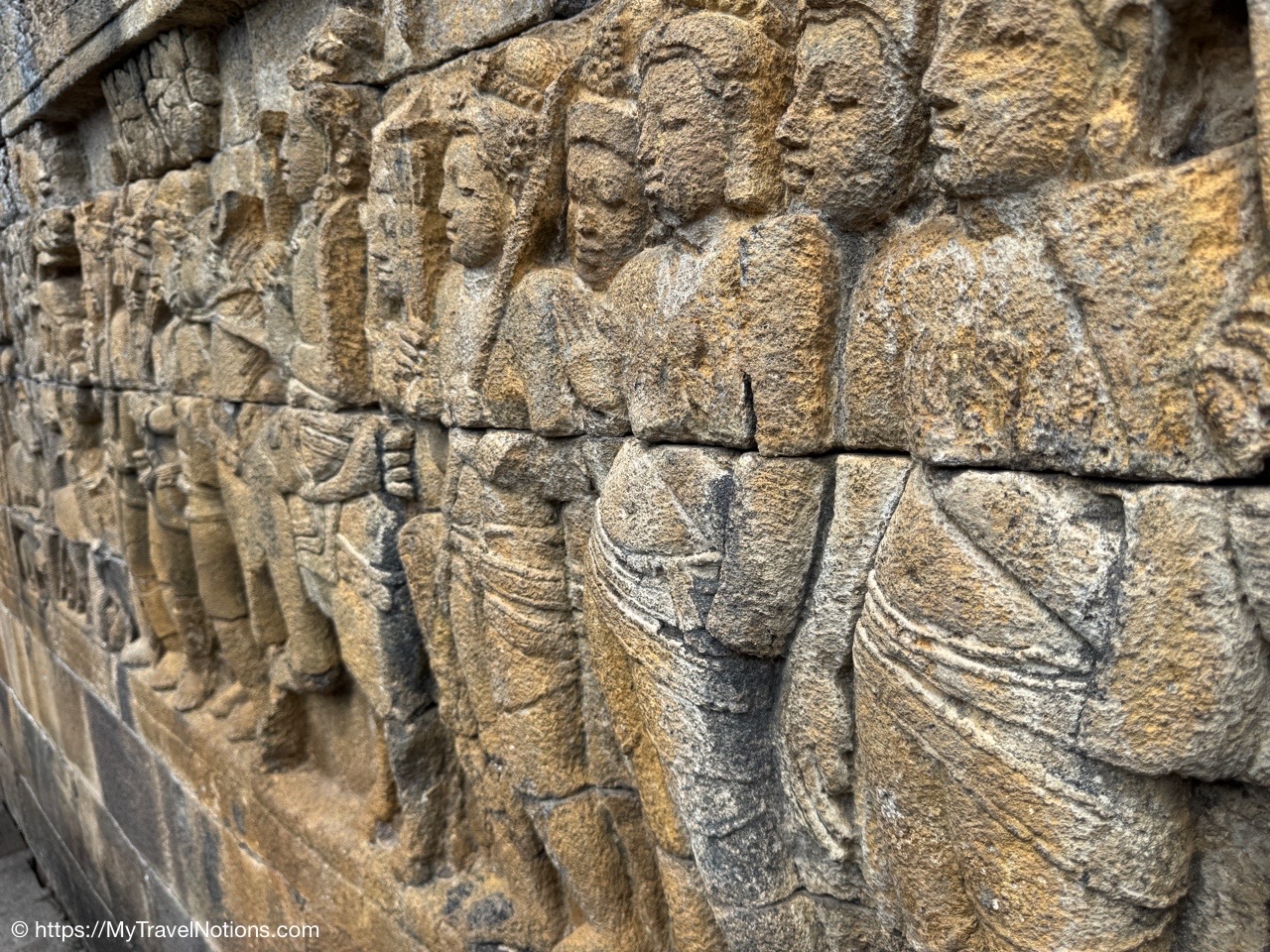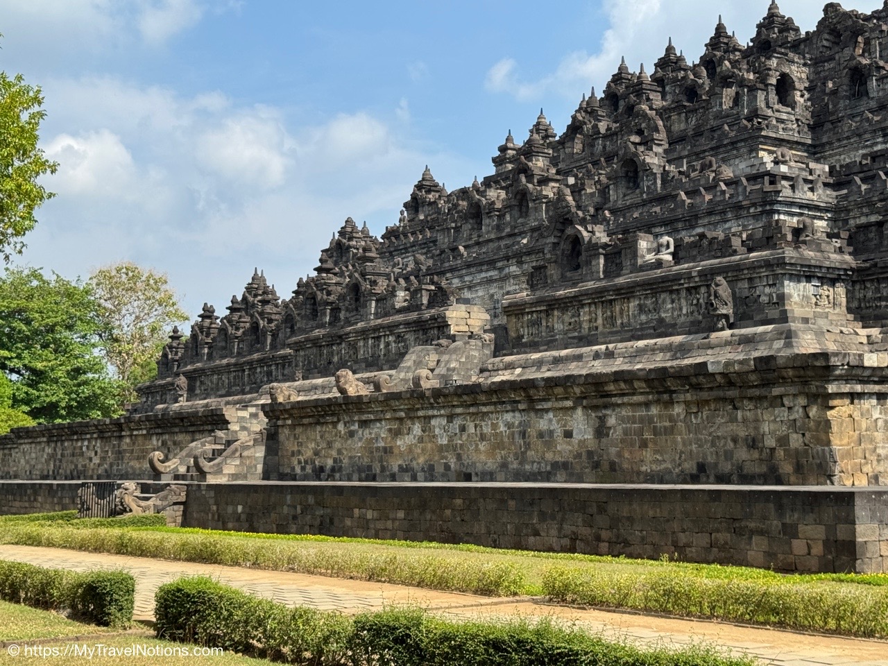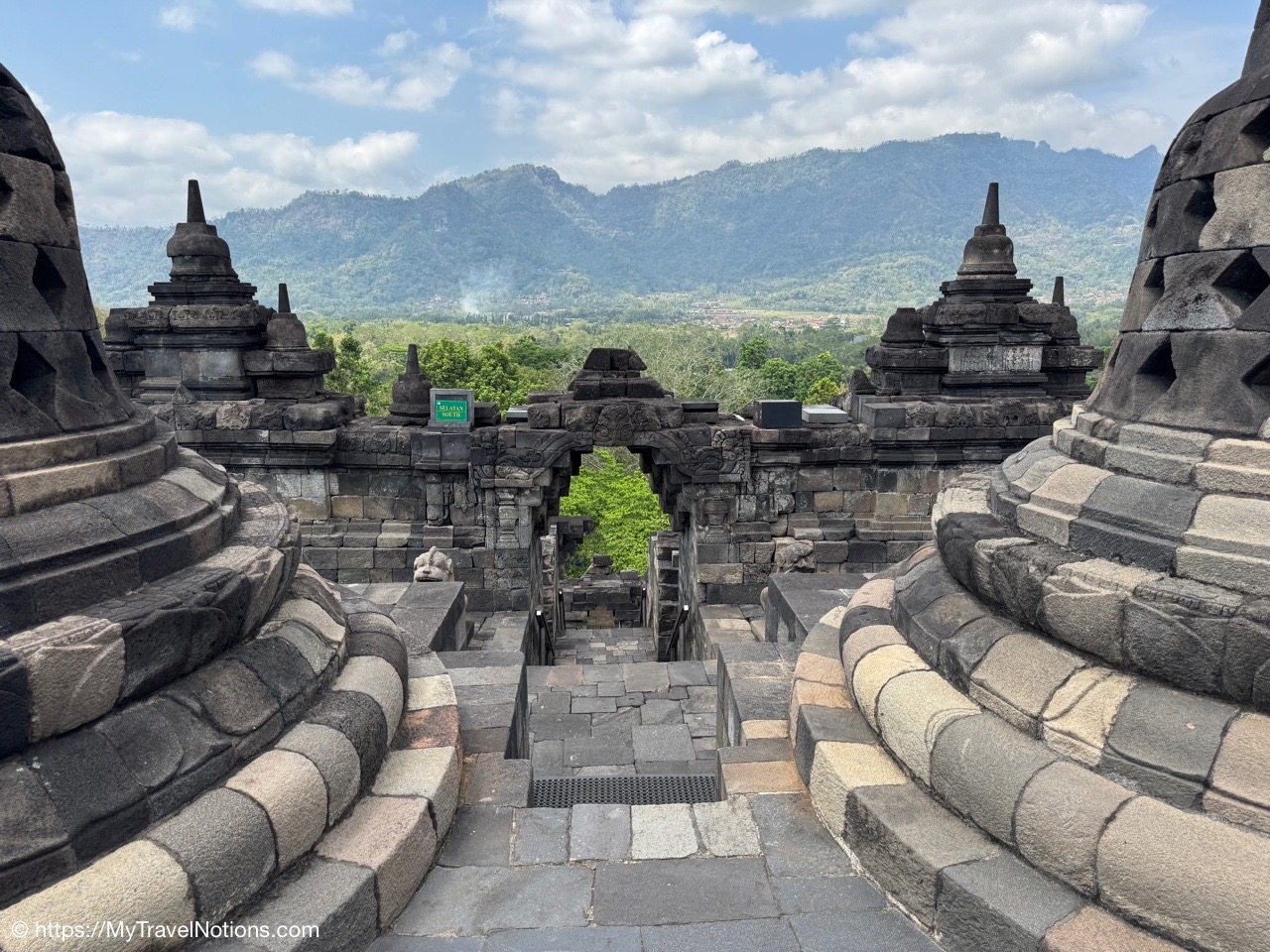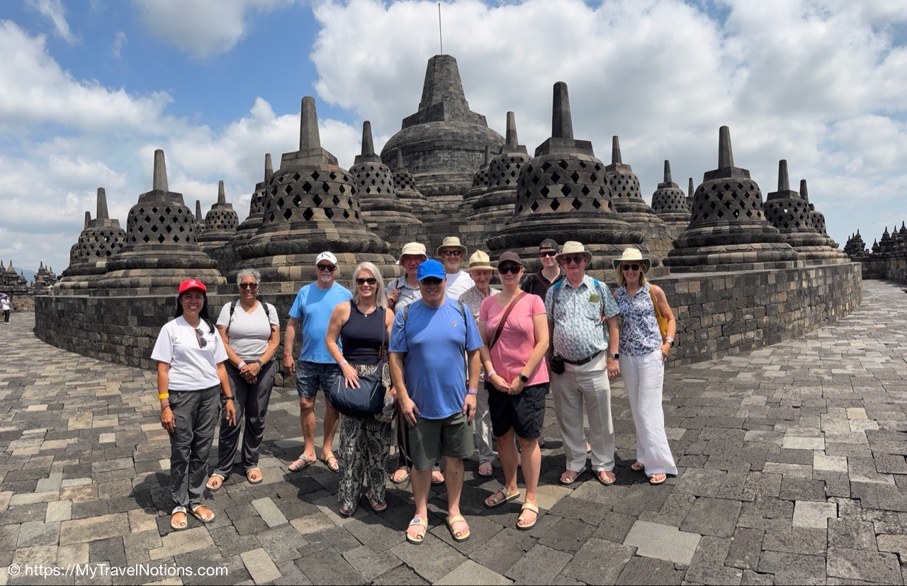 Me at the bell-shaped perforated stupas at the very top of the Borobudur Temple. (Sept. 24, 2025)The entrance of the Borobudur Temple, the world’s largest Buddhist temple is a massive 9th-century stone monument built as a three-dimensional mandala representing the path to enlightenment. It features nine stacked platforms (six square, three circular) adorned with thousands of intricate narrative relief, serving as both a major pilgrimage site and a UNESCO World Heritage Site. (Sept. 24, 2025)Me with a view of the entrance to the Borobudur Temple with my upanat sandals, required wearing to protect the ancient stone steps when climbing the monument near Yogyakarta. The slippers come with the entrance ticket and can be taken home as a souvenir and required to protect the ancient stone steps while climbing the monument. The disadvantage is that I had to carry around my actual shoes inside the provided red tote bag. I found them to be uncomfortable and ended up leaving them in my hotel room. (Sept. 24, 2025)Climbing the initial stairs to access the base of the Borobudur Temple near Yogyakarta. (Sept. 24, 2025)The base level where we began our assent up the steep stone steps to the different upper levels or terraces of the Borobudur Temple near Yogyakarta. The different levels or terraces represent stages of consciousness, culminating at the top with views of stupas and surrounding landscapes. (Sept. 24, 2025)Me at the base level where we began our assent up the steep stone steps to the different upper levels or terraces of the Borobudur Temple near Yogyakarta. The different levels represent stages of consciousness, culminating at the top with views of stupas and surrounding landscapes. (Sept. 24, 2025)A view of the various levels or terraces of the Borobudur Temple near Yogyakarta. (Sept. 24, 2025)On the first terrace or Rupadhatu Level (Square Terraces) of the Borobudur Temple near Yogyakarta. (Sept. 24, 2025)There use to be some 432 Buddha statues hidden within the arches or niches in the balustrades on the Rupadhatu Level (Square Terraces) of the Borobudur Temple. The statues within the niches on the Rupadhatu level often display different hand gestures (mudras), reflecting various aspects of Buddhist teachings. Below the Buddha are the water spouts as mythological sea creatures designed to channel heavy monsoon rainwater away from the structure, preventing erosion and damage, showcasing advanced ancient engineering for a mortarless stone structure. (Sept. 24, 2025)Me sitting at a corner of the on the Rupadhatu Level (Square Terraces) of the Borobudur Temple. (Sept. 24, 2025)The steeped arched stairways of the Borobudur Temple. Climbing the stairs represents the Buddhist path to enlightenment, with different levels representing stages of consciousness. The entire top section represents the Arupadhatu (realm of formlessness), the final stage of spiritual ascent in Buddhist cosmology, leading to enlightenment. (Sept. 24, 2025)Reliefs along the corridor walls on the terraces of the Borobudur Temple. (Sept. 24, 2025)Reliefs along the corridor walls on the terraces of the Borobudur Temple. (Sept. 24, 2025)Reliefs along the corridor walls on the terraces of the Borobudur Temple. (Sept. 24, 2025)Reliefs along the corridor walls on the terraces of the Borobudur Temple. (Sept. 24, 2025)Reliefs along the corridor walls on the terraces of the Borobudur Temple. (Sept. 24, 2025)Reliefs along the corridor walls on the terraces of the Borobudur Temple. (Sept. 24, 2025)Reliefs along the corridor walls on the terraces of the Borobudur Temple. (Sept. 24, 2025)Reliefs along the corridor walls on the terraces of the Borobudur Temple. (Sept. 24, 2025)Reliefs along the corridor walls on the terraces of the Borobudur Temple. (Sept. 24, 2025)Reliefs along the corridor walls on the terraces of the Borobudur Temple. (Sept. 24, 2025)Reliefs along the corridor walls on the terraces of the Borobudur Temple. (Sept. 24, 2025)Our Intrepid Travel tour group at the very top of the Borobudur. From left: Our guide, (Sept. 24, 2025)The bell-shaped perforated stupas at the very top of the Borobudur Temple represents Nirvana. (Sept. 24, 2025)The bell-shaped perforated stupas at the very top of the Borobudur Temple represents Nirvana. (Sept. 24, 2025)Me at the bell-shaped perforated stupas at the very top of the Borobudur Temple. (Sept. 24, 2025)The bell-shaped perforated stupas at the very top of the Borobudur Temple represents Nirvana. (Sept. 24, 2025)The bell-shaped perforated stupas at the very top of the Borobudur Temple is surrounded by mountains, including twin volcanoes Mount Merbabu and Mount Merapi. (Sept. 24, 2025)The bell-shaped perforated stupas at the very top of the Borobudur Temple is surrounded by mountains, including twin volcanoes Mount Merbabu and Mount Merapi. (Sept. 24, 2025)The bell-shaped perforated stupas at the very top of the Borobudur Temple represents Nirvana. (Sept. 24, 2025)The bell-shaped perforated stupas at the very top of the Borobudur Temple represents Nirvana. (Sept. 24, 2025)The bell-shaped perforated stupas at the very top of the Borobudur Temple represents Nirvana. (Sept. 24, 2025)The Buddhas inside the perforated stupas at the top of Borobudur symbolize the path to enlightenment. (Sept. 24, 2025)The Buddhas inside the perforated stupas at the top of Borobudur symbolize the path to enlightenment. (Sept. 24, 2025)Saying goodbye to my visit at the Borobudur Temple near Yogyakarta. (Sept. 24, 2025)The second part of our day was a 2-hour walking tour through the traditional Javanese village of Candirejo close to the Borobudur Temple near Yogyakarta. The village is considered a cultural and eco-tourism destination, offering visitors an authentic glimpse into rural life. (Sept. 24, 2025)Walking through the Candirejo Village close to the Borobudur Temple near Yogyakarta. It is known for its traditional Javanese culture and village life. (Sept. 24, 2025)The Candirejo Village close to the Borobudu