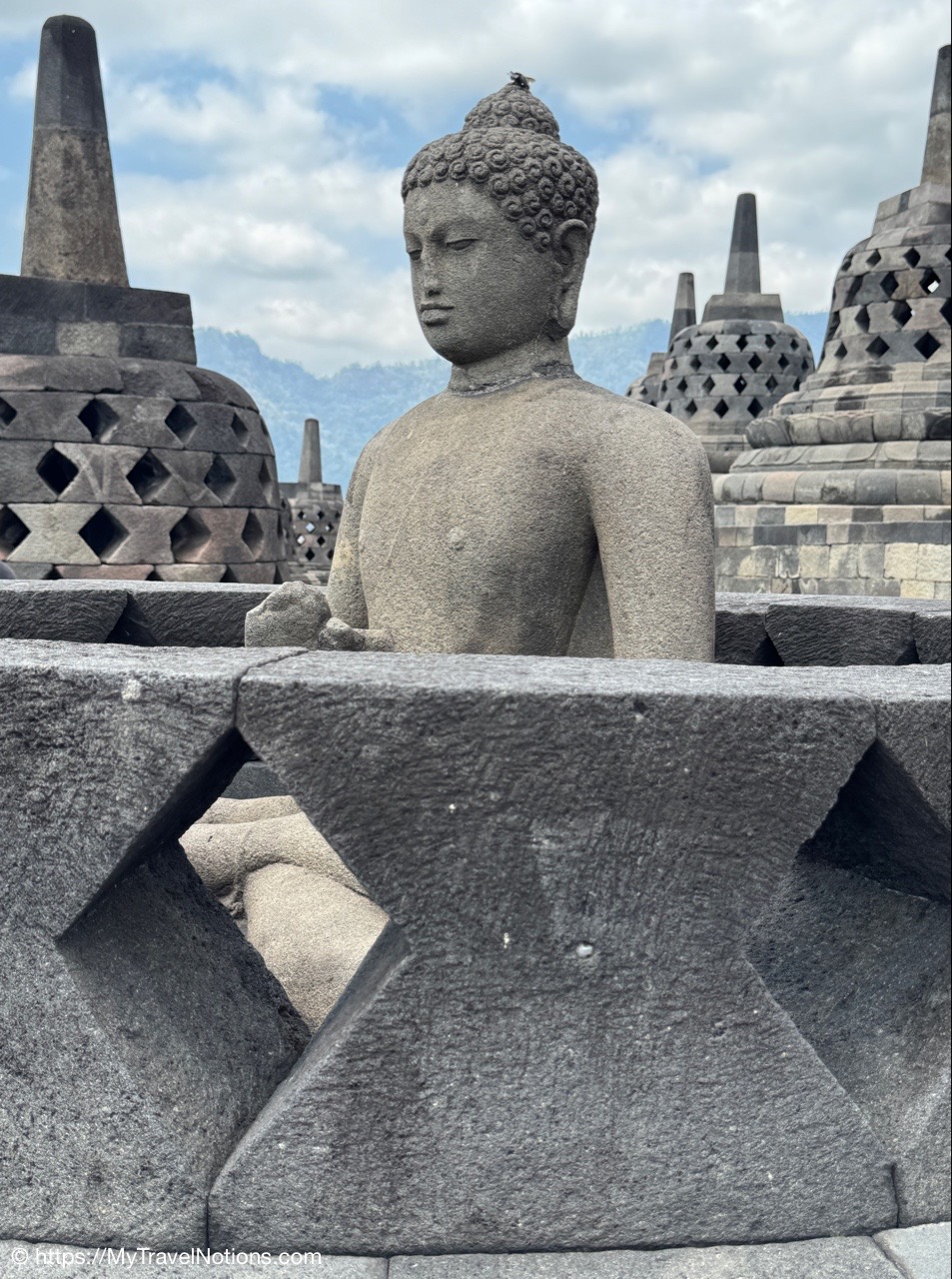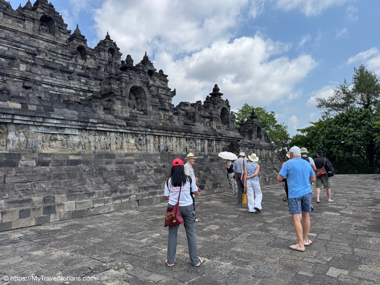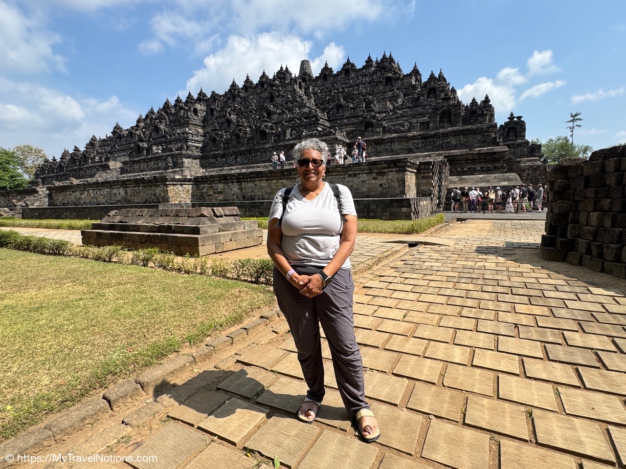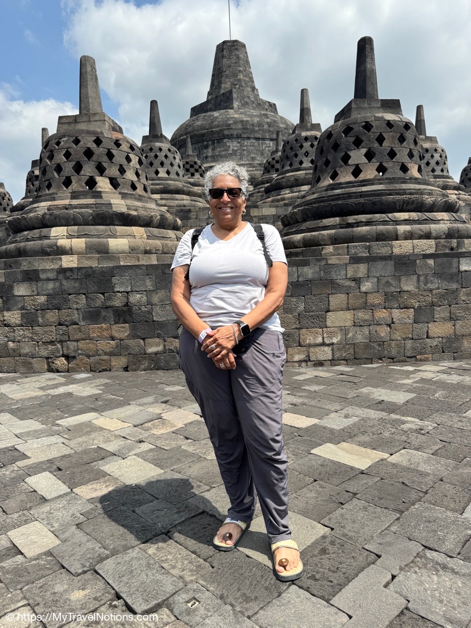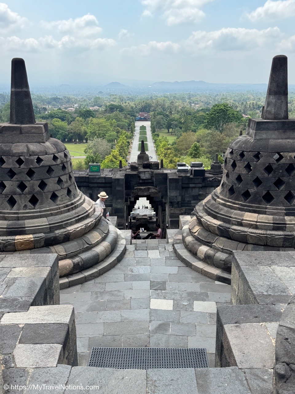 Me at the bell-shaped perforated stupas at the very top of the Borobudur Temple. (Sept. 24, 2025)The entrance of the Borobudur Temple, the world’s largest Buddhist temple is a massive 9th-century stone monument built as a three-dimensional mandala representing the path to enlightenment. It features nine stacked platforms (six square, three circular) adorned with thousands of intricate narrative relief, serving as both a major pilgrimage site and a UNESCO World Heritage Site. (Sept. 24, 2025)Me with a view of the entrance to the Borobudur Temple with my upanat sandals, required wearing to protect the ancient stone steps when climbing the monument near Yogyakarta. The slippers come with the entrance ticket and can be taken home as a souvenir and required to protect the ancient stone steps while climbing the monument. The disadvantage is that I had to carry around my actual shoes inside the provided red tote bag. I found them to be uncomfortable and ended up leaving them in my hotel room. (Sept. 24, 2025)Climbing the initial stairs to access the base of the Borobudur Temple near Yogyakarta. (Sept. 24, 2025)The base level where we began our assent up the steep stone steps to the different upper levels or terraces of the Borobudur Temple near Yogyakarta. The different levels or terraces represent stages of consciousness, culminating at the top with views of stupas and surrounding landscapes. (Sept. 24, 2025)Me at the base level where we began our assent up the steep stone steps to the different upper levels or terraces of the Borobudur Temple near Yogyakarta. The different levels represent stages of consciousness, culminating at the top with views of stupas and surrounding landscapes. (Sept. 24, 2025)A view of the various levels or terraces of the Borobudur Temple near Yogyakarta. (Sept. 24, 2025)On the first terrace or Rupadhatu Level (Square Terraces) of the Borobudur Temple near Yogyakarta. (Sept. 24, 2025)There use to be some 432 Buddha statues hidden within the arches or niches in the balustrades on the Rupadhatu Level (Square Terraces) of the Borobudur Temple. The statues within the niches on the Rupadhatu level often display different hand gestures (mudras), reflecting various aspects of Buddhist teachings. Below the Buddha are the water spouts as mythological sea creatures designed to channel heavy monsoon rainwater away from the structure, preventing erosion and damage, showcasing advanced ancient engineering for a mortarless stone structure. (Sept. 24, 2025)Me sitting at a corner of the on the Rupadhatu Level (Square Terraces) of the Borobudur Temple. (Sept. 24, 2025)The steeped arched stairways of the Borobudur Temple. Climbing the stairs represents the Buddhist path to enlightenment, with different levels representing stages of consciousness. The entire top section represents the Arupadhatu (realm of formlessness), the final stage of spiritual ascent in Buddhist cosmology, leading to enlightenment. (Sept. 24, 2025)Reliefs along the corridor walls on the terraces of the Borobudur Temple. (Sept. 24, 2025)Reliefs along the corridor walls on the terraces of the Borobudur Temple. (Sept. 24, 2025)Reliefs along the corridor walls on the terraces of the Borobudur Temple. (Sept. 24, 2025)Reliefs along the corridor walls on the terraces of the Borobudur Temple. (Sept. 24, 2025)Reliefs along the corridor walls on the terraces of the Borobudur Temple. (Sept. 24, 2025)Reliefs along the corridor walls on the terraces of the Borobudur Temple. (Sept. 24, 2025)Reliefs along the corridor walls on the terraces of the Borobudur Temple. (Sept. 24, 2025)Reliefs along the corridor walls on the terraces of the Borobudur Temple. (Sept. 24, 2025)Reliefs along the corridor walls on the terraces of the Borobudur Temple. (Sept. 24, 2025)Reliefs along the corridor walls on the terraces of the Borobudur Temple. (Sept. 24, 2025)Reliefs along the corridor walls on the terraces of the Borobudur Temple. (Sept. 24, 2025)Our Intrepid Travel tour group at the very top of the Borobudur. From left: Our guide, (Sept. 24, 2025)The bell-shaped perforated stupas at the very top of the Borobudur Temple represents Nirvana. (Sept. 24, 2025)The bell-shaped perforated stupas at the very top of the Borobudur Temple represents Nirvana. (Sept. 24, 2025)Me at the bell-shaped perforated stupas at the very top of the Borobudur Temple. (Sept. 24, 2025)The bell-shaped perforated stupas at the very top of the Borobudur Temple represents Nirvana. (Sept. 24, 2025)The bell-shaped perforated stupas at the very top of the Borobudur Temple is surrounded by mountains, including twin volcanoes Mount Merbabu and Mount Merapi. (Sept. 24, 2025)The bell-shaped perforated stupas at the very top of the Borobudur Temple is surrounded by mountains, including twin volcanoes Mount Merbabu and Mount Merapi. (Sept. 24, 2025)The bell-shaped perforated stupas at the very top of the Borobudur Temple represents Nirvana. (Sept. 24, 2025)The bell-shaped perforated stupas at the very top of the Borobudur Temple represents Nirvana. (Sept. 24, 2025)The bell-shaped perforated stupas at the very top of the Borobudur Temple represents Nirvana. (Sept. 24, 2025)The Buddhas inside the perforated stupas at the top of Borobudur symbolize the path to enlightenment. (Sept. 24, 2025)The Buddhas inside the perforated stupas at the top of Borobudur symbolize the path to enlightenment. (Sept. 24, 2025)Saying goodbye to my visit at the Borobudur Temple near Yogyakarta. (Sept. 24, 2025)The second part of our day was a 2-hour walking tour through the traditional Javanese village of Candirejo close to the Borobudur Temple near Yogyakarta. The village is considered a cultural and eco-tourism destination, offering visitors an authentic glimpse into rural life. (Sept. 24, 2025)Walking through the Candirejo Village close to the Borobudur Temple near Yogyakarta. It is known for its traditional Javanese culture and village life. (Sept. 24, 2025)The Candirejo Village close to the Borobudu
