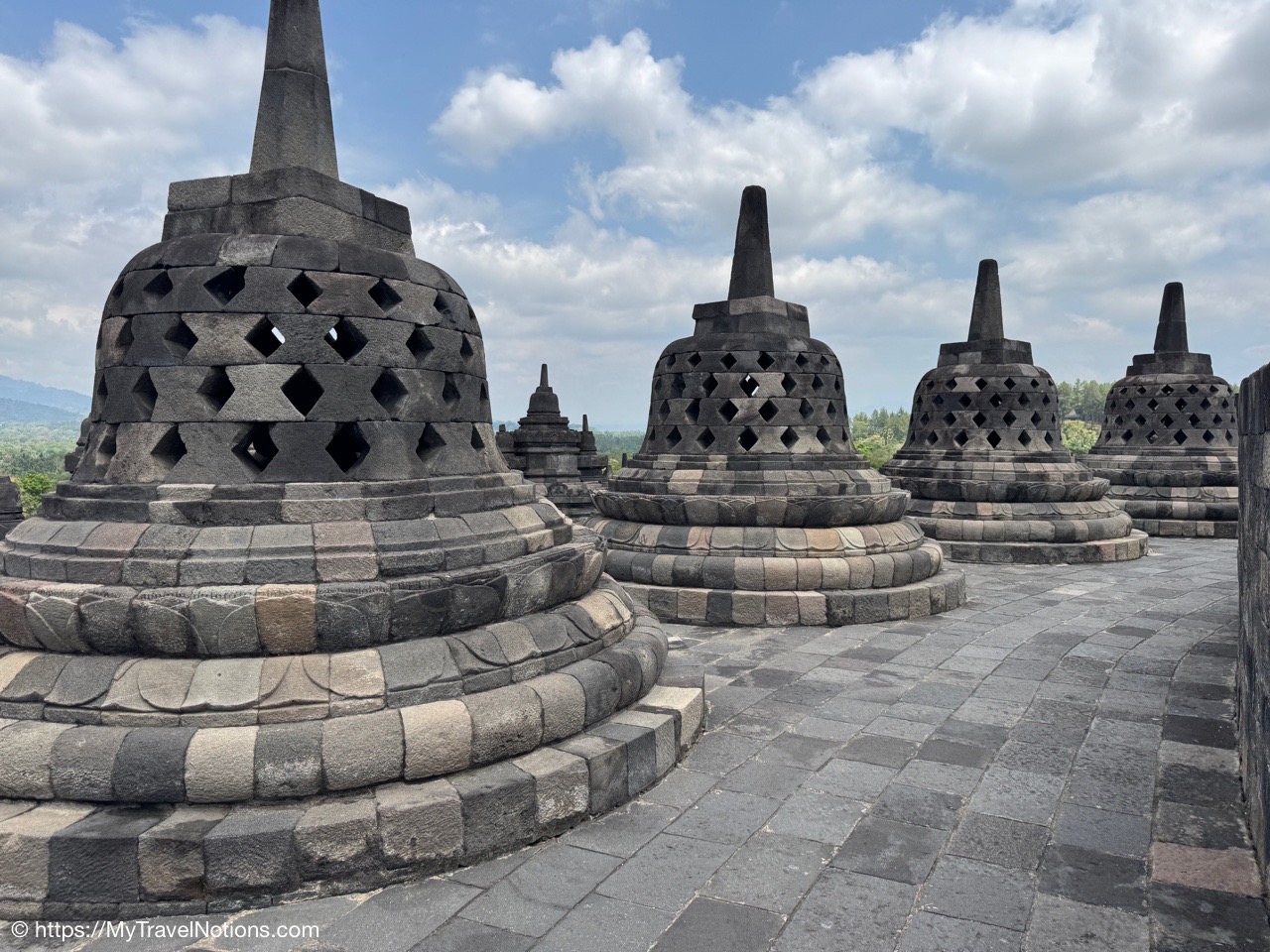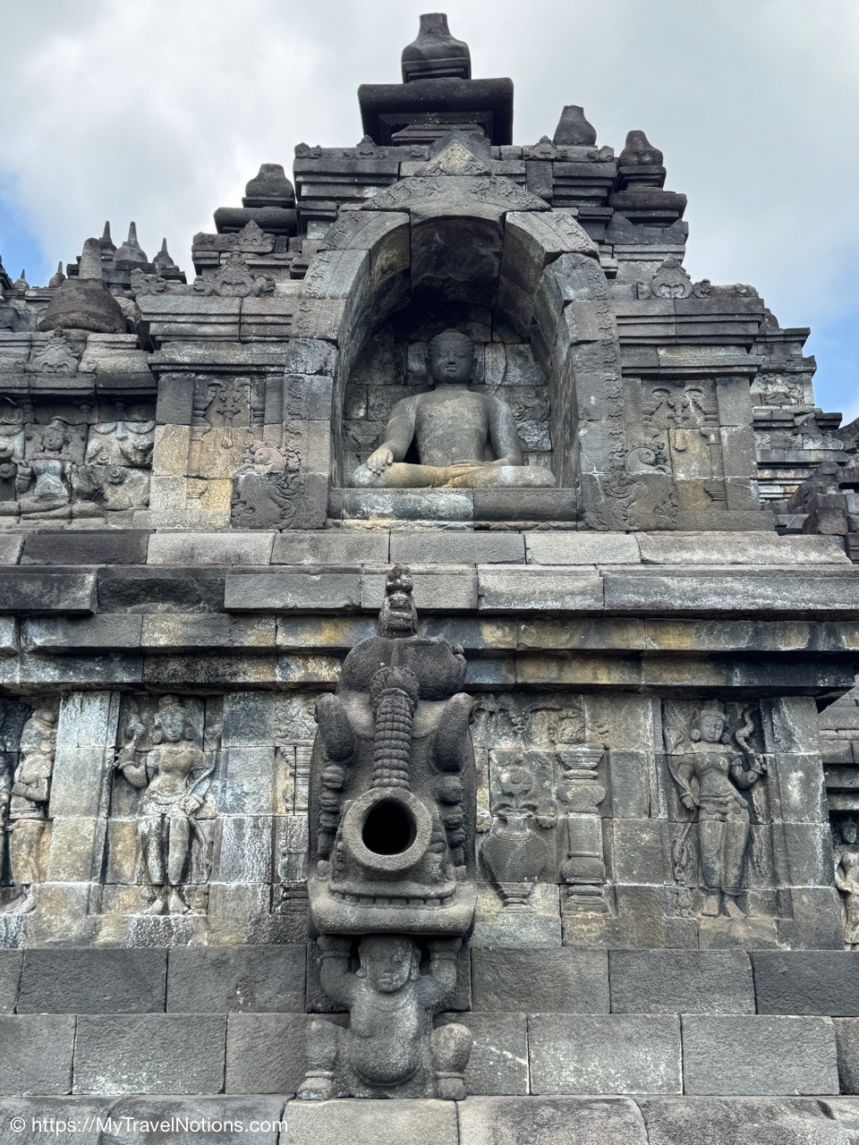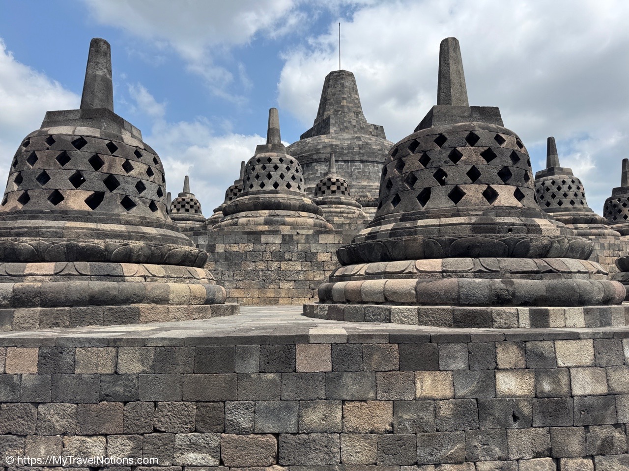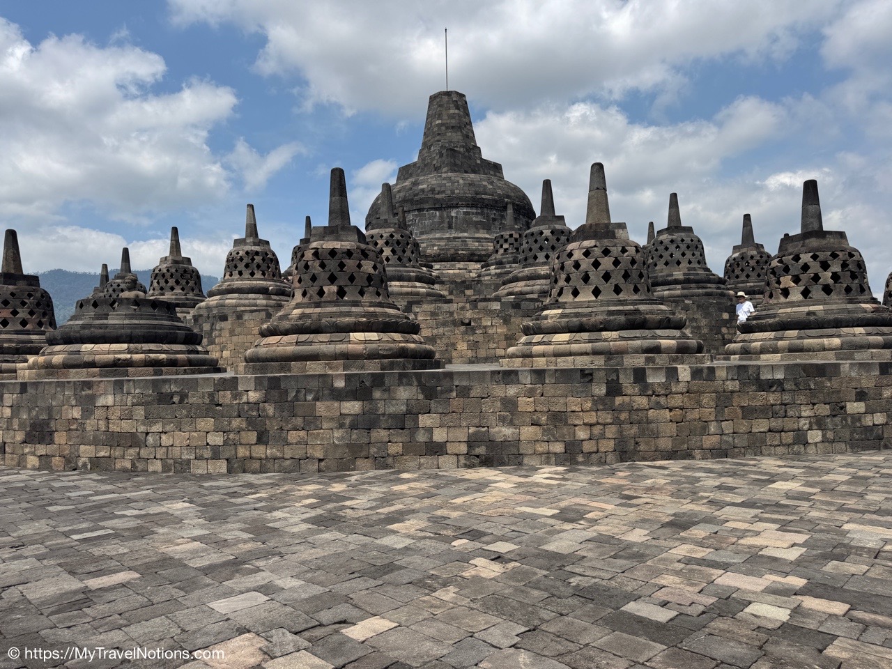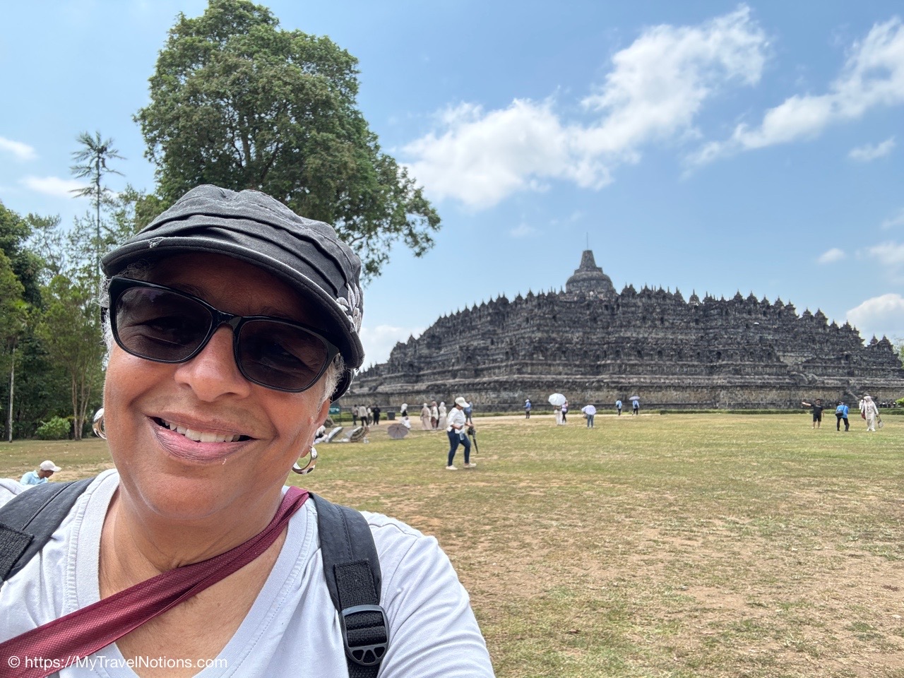 Me at the bell-shaped perforated stupas at the very top of the Borobudur Temple. (Sept. 24, 2025)The entrance of the Borobudur Temple, the world’s largest Buddhist temple is a massive 9th-century stone monument built as a three-dimensional mandala representing the path to enlightenment. It features nine stacked platforms (six square, three circular) adorned with thousands of intricate narrative relief, serving as both a major pilgrimage site and a UNESCO World Heritage Site. (Sept. 24, 2025)Me with a view of the entrance to the Borobudur Temple with my upanat sandals, required wearing to protect the ancient stone steps when climbing the monument near Yogyakarta. The slippers come with the entrance ticket and can be taken home as a souvenir and required to protect the ancient stone steps while climbing the monument. The disadvantage is that I had to carry around my actual shoes inside the provided red tote bag. I found them to be uncomfortable and ended up leaving them in my hotel room. (Sept. 24, 2025)Climbing the initial stairs to access the base of the Borobudur Temple near Yogyakarta. (Sept. 24, 2025)The base level where we began our assent up the steep stone steps to the different upper levels or terraces of the Borobudur Temple near Yogyakarta. The different levels or terraces represent stages of consciousness, culminating at the top with views of stupas and surrounding landscapes. (Sept. 24, 2025)Me at the base level where we began our assent up the steep stone steps to the different upper levels or terraces of the Borobudur Temple near Yogyakarta. The different levels represent stages of consciousness, culminating at the top with views of stupas and surrounding landscapes. (Sept. 24, 2025)A view of the various levels or terraces of the Borobudur Temple near Yogyakarta. (Sept. 24, 2025)On the first terrace or Rupadhatu Level (Square Terraces) of the Borobudur Temple near Yogyakarta. (Sept. 24, 2025)There use to be some 432 Buddha statues hidden within the arches or niches in the balustrades on the Rupadhatu Level (Square Terraces) of the Borobudur Temple. The statues within the niches on the Rupadhatu level often display different hand gestures (mudras), reflecting various aspects of Buddhist teachings. Below the Buddha are the water spouts as mythological sea creatures designed to channel heavy monsoon rainwater away from the structure, preventing erosion and damage, showcasing advanced ancient engineering for a mortarless stone structure. (Sept. 24, 2025)Me sitting at a corner of the on the Rupadhatu Level (Square Terraces) of the Borobudur Temple. (Sept. 24, 2025)The steeped arched stairways of the Borobudur Temple. Climbing the stairs represents the Buddhist path to enlightenment, with different levels representing stages of consciousness. The entire top section represents the Arupadhatu (realm of formlessness), the final stage of spiritual ascent in Buddhist cosmology, leading to enlightenment. (Sept. 24, 2025)Reliefs along the corridor walls on the terraces of the Borobudur Temple. (Sept. 24, 2025)Reliefs along the corridor walls on the terraces of the Borobudur Temple. (Sept. 24, 2025)Reliefs along the corridor walls on the terraces of the Borobudur Temple. (Sept. 24, 2025)Reliefs along the corridor walls on the terraces of the Borobudur Temple. (Sept. 24, 2025)Reliefs along the corridor walls on the terraces of the Borobudur Temple. (Sept. 24, 2025)Reliefs along the corridor walls on the terraces of the Borobudur Temple. (Sept. 24, 2025)Reliefs along the corridor walls on the terraces of the Borobudur Temple. (Sept. 24, 2025)Reliefs along the corridor walls on the terraces of the Borobudur Temple. (Sept. 24, 2025)Reliefs along the corridor walls on the terraces of the Borobudur Temple. (Sept. 24, 2025)Reliefs along the corridor walls on the terraces of the Borobudur Temple. (Sept. 24, 2025)Reliefs along the corridor walls on the terraces of the Borobudur Temple. (Sept. 24, 2025)Our Intrepid Travel tour group at the very top of the Borobudur. From left: Our guide, (Sept. 24, 2025)The bell-shaped perforated stupas at the very top of the Borobudur Temple represents Nirvana. (Sept. 24, 2025)The bell-shaped perforated stupas at the very top of the Borobudur Temple represents Nirvana. (Sept. 24, 2025)Me at the bell-shaped perforated stupas at the very top of the Borobudur Temple. (Sept. 24, 2025)The bell-shaped perforated stupas at the very top of the Borobudur Temple represents Nirvana. (Sept. 24, 2025)The bell-shaped perforated stupas at the very top of the Borobudur Temple is surrounded by mountains, including twin volcanoes Mount Merbabu and Mount Merapi. (Sept. 24, 2025)The bell-shaped perforated stupas at the very top of the Borobudur Temple is surrounded by mountains, including twin volcanoes Mount Merbabu and Mount Merapi. (Sept. 24, 2025)The bell-shaped perforated stupas at the very top of the Borobudur Temple represents Nirvana. (Sept. 24, 2025)The bell-shaped perforated stupas at the very top of the Borobudur Temple represents Nirvana. (Sept. 24, 2025)The bell-shaped perforated stupas at the very top of the Borobudur Temple represents Nirvana. (Sept. 24, 2025)The Buddhas inside the perforated stupas at the top of Borobudur symbolize the path to enlightenment. (Sept. 24, 2025)The Buddhas inside the perforated stupas at the top of Borobudur symbolize the path to enlightenment. (Sept. 24, 2025)Saying goodbye to my visit at the Borobudur Temple near Yogyakarta. (Sept. 24, 2025)The second part of our day was a 2-hour walking tour through the traditional Javanese village of Candirejo close to the Borobudur Temple near Yogyakarta. The village is considered a cultural and eco-tourism destination, offering visitors an authentic glimpse into rural life. (Sept. 24, 2025)Walking through the Candirejo Village close to the Borobudur Temple near Yogyakarta. It is known for its traditional Javanese culture and village life. (Sept. 24, 2025)The Candirejo Village close to the Borobudu