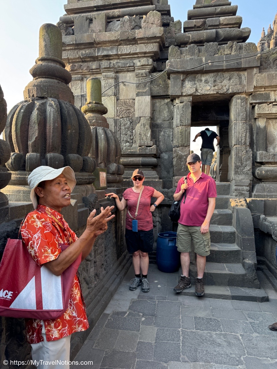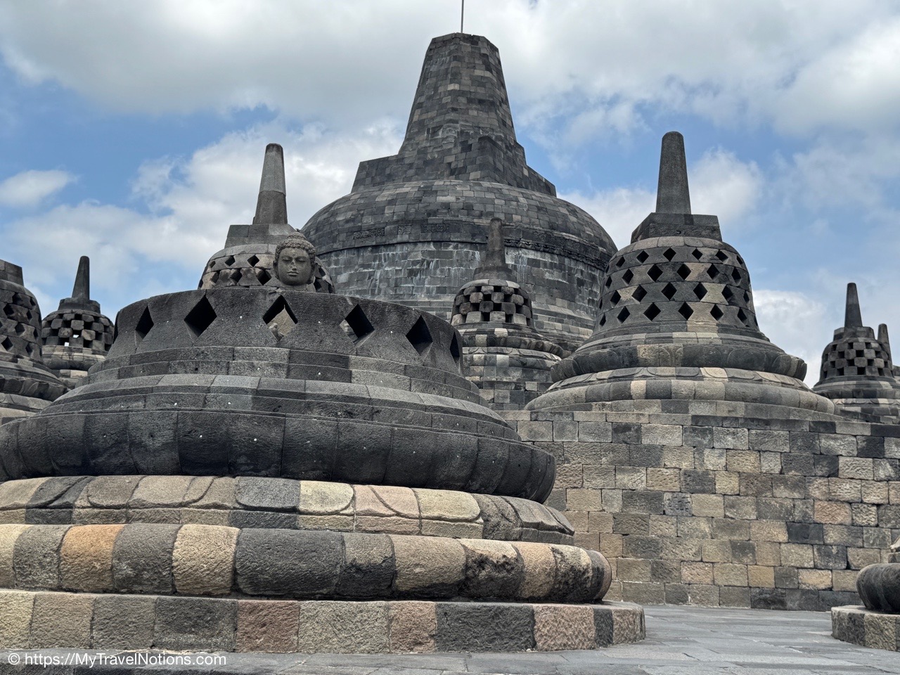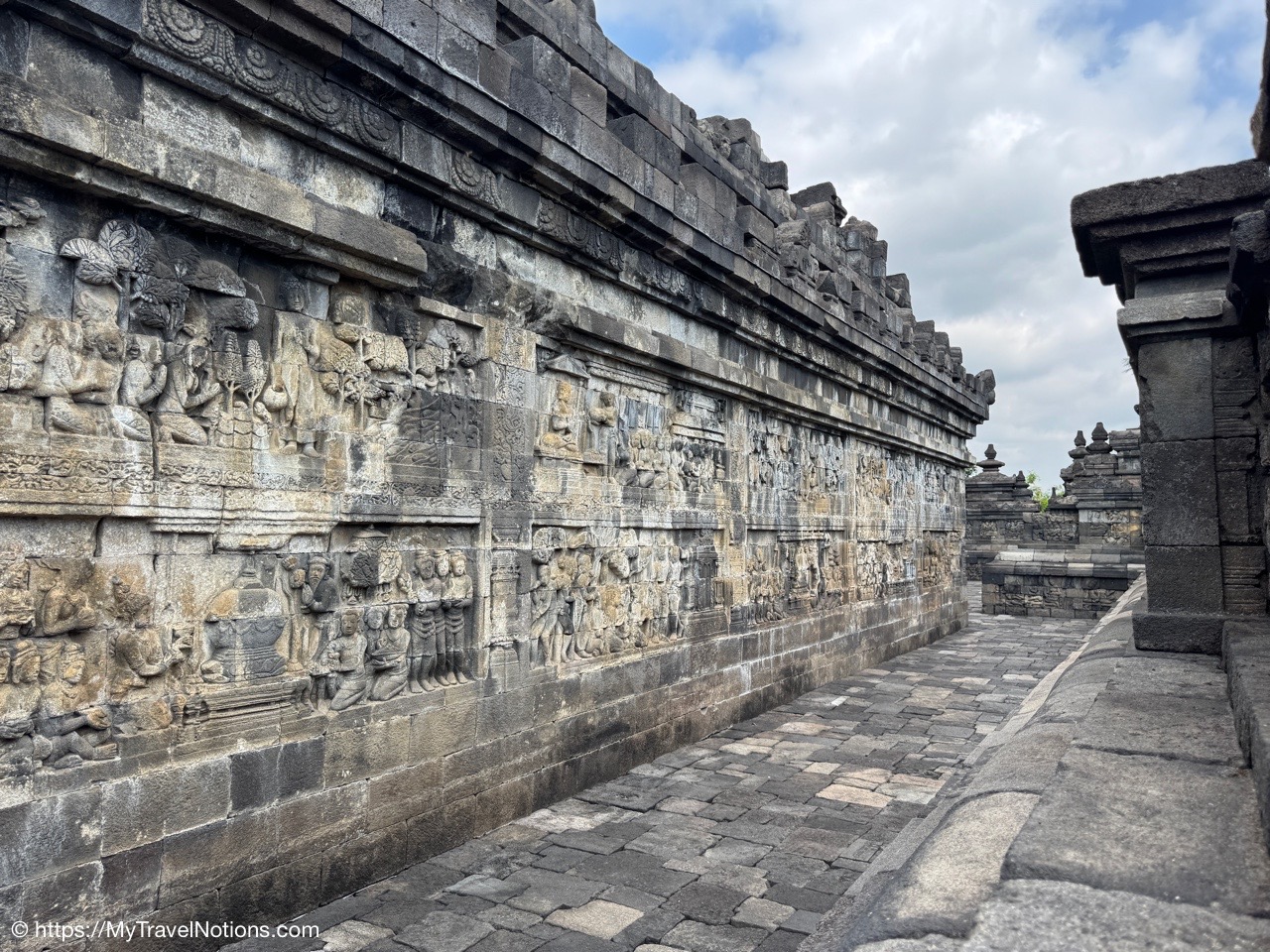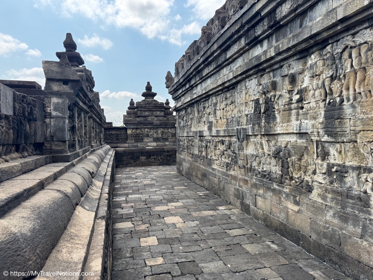 Me at the bell-shaped perforated stupas at the very top of the Borobudur Temple. (Sept. 24, 2025)The entrance of the Borobudur Temple, the world’s largest Buddhist temple is a massive 9th-century stone monument built as a three-dimensional mandala representing the path to enlightenment. It features nine stacked platforms (six square, three circular) adorned with thousands of intricate narrative relief, serving as both a major pilgrimage site and a UNESCO World Heritage Site. (Sept. 24, 2025)Me with a view of the entrance to the Borobudur Temple with my upanat sandals, required wearing to protect the ancient stone steps when climbing the monument near Yogyakarta. The slippers come with the entrance ticket and can be taken home as a souvenir and required to protect the ancient stone steps while climbing the monument. The disadvantage is that I had to carry around my actual shoes inside the provided red tote bag. I found them to be uncomfortable and ended up leaving them in my hotel room. (Sept. 24, 2025)Climbing the initial stairs to access the base of the Borobudur Temple near Yogyakarta. (Sept. 24, 2025)The base level where we began our assent up the steep stone steps to the different upper levels or terraces of the Borobudur Temple near Yogyakarta. The different levels or terraces represent stages of consciousness, culminating at the top with views of stupas and surrounding landscapes. (Sept. 24, 2025)Me at the base level where we began our assent up the steep stone steps to the different upper levels or terraces of the Borobudur Temple near Yogyakarta. The different levels represent stages of consciousness, culminating at the top with views of stupas and surrounding landscapes. (Sept. 24, 2025)A view of the various levels or terraces of the Borobudur Temple near Yogyakarta. (Sept. 24, 2025)On the first terrace or Rupadhatu Level (Square Terraces) of the Borobudur Temple near Yogyakarta. (Sept. 24, 2025)There use to be some 432 Buddha statues hidden within the arches or niches in the balustrades on the Rupadhatu Level (Square Terraces) of the Borobudur Temple. The statues within the niches on the Rupadhatu level often display different hand gestures (mudras), reflecting various aspects of Buddhist teachings. Below the Buddha are the water spouts as mythological sea creatures designed to channel heavy monsoon rainwater away from the structure, preventing erosion and damage, showcasing advanced ancient engineering for a mortarless stone structure. (Sept. 24, 2025)Me sitting at a corner of the on the Rupadhatu Level (Square Terraces) of the Borobudur Temple. (Sept. 24, 2025)The steeped arched stairways of the Borobudur Temple. Climbing the stairs represents the Buddhist path to enlightenment, with different levels representing stages of consciousness. The entire top section represents the Arupadhatu (realm of formlessness), the final stage of spiritual ascent in Buddhist cosmology, leading to enlightenment. (Sept. 24, 2025)Reliefs along the corridor walls on the terraces of the Borobudur Temple. (Sept. 24, 2025)Reliefs along the corridor walls on the terraces of the Borobudur Temple. (Sept. 24, 2025)Reliefs along the corridor walls on the terraces of the Borobudur Temple. (Sept. 24, 2025)Reliefs along the corridor walls on the terraces of the Borobudur Temple. (Sept. 24, 2025)Reliefs along the corridor walls on the terraces of the Borobudur Temple. (Sept. 24, 2025)Reliefs along the corridor walls on the terraces of the Borobudur Temple. (Sept. 24, 2025)Reliefs along the corridor walls on the terraces of the Borobudur Temple. (Sept. 24, 2025)Reliefs along the corridor walls on the terraces of the Borobudur Temple. (Sept. 24, 2025)Reliefs along the corridor walls on the terraces of the Borobudur Temple. (Sept. 24, 2025)Reliefs along the corridor walls on the terraces of the Borobudur Temple. (Sept. 24, 2025)Reliefs along the corridor walls on the terraces of the Borobudur Temple. (Sept. 24, 2025)Our Intrepid Travel tour group at the very top of the Borobudur. From left: Our guide, (Sept. 24, 2025)The bell-shaped perforated stupas at the very top of the Borobudur Temple represents Nirvana. (Sept. 24, 2025)The bell-shaped perforated stupas at the very top of the Borobudur Temple represents Nirvana. (Sept. 24, 2025)Me at the bell-shaped perforated stupas at the very top of the Borobudur Temple. (Sept. 24, 2025)The bell-shaped perforated stupas at the very top of the Borobudur Temple represents Nirvana. (Sept. 24, 2025)The bell-shaped perforated stupas at the very top of the Borobudur Temple is surrounded by mountains, including twin volcanoes Mount Merbabu and Mount Merapi. (Sept. 24, 2025)The bell-shaped perforated stupas at the very top of the Borobudur Temple is surrounded by mountains, including twin volcanoes Mount Merbabu and Mount Merapi. (Sept. 24, 2025)The bell-shaped perforated stupas at the very top of the Borobudur Temple represents Nirvana. (Sept. 24, 2025)The bell-shaped perforated stupas at the very top of the Borobudur Temple represents Nirvana. (Sept. 24, 2025)The bell-shaped perforated stupas at the very top of the Borobudur Temple represents Nirvana. (Sept. 24, 2025)The Buddhas inside the perforated stupas at the top of Borobudur symbolize the path to enlightenment. (Sept. 24, 2025)The Buddhas inside the perforated stupas at the top of Borobudur symbolize the path to enlightenment. (Sept. 24, 2025)Saying goodbye to my visit at the Borobudur Temple near Yogyakarta. (Sept. 24, 2025)The second part of our day was a 2-hour walking tour through the traditional Javanese village of Candirejo close to the Borobudur Temple near Yogyakarta. The village is considered a cultural and eco-tourism destination, offering visitors an authentic glimpse into rural life. (Sept. 24, 2025)Walking through the Candirejo Village close to the Borobudur Temple near Yogyakarta. It is known for its traditional Javanese culture and village life. (Sept. 24, 2025)The Candirejo Village close to the Borobudu